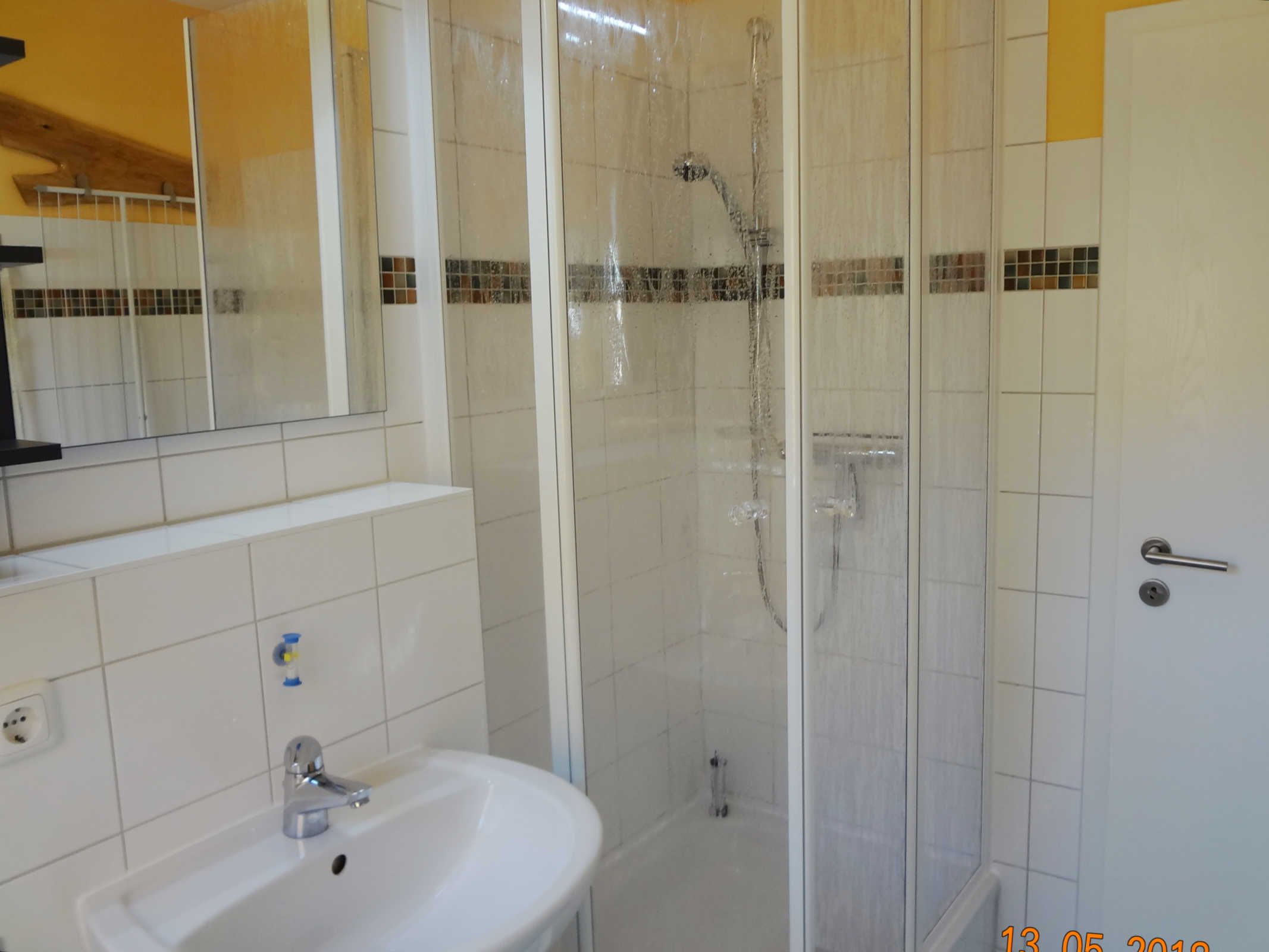 Im hellen Bad mit Fenster sind eine Dusche, ein WC und ein Waschbecken.