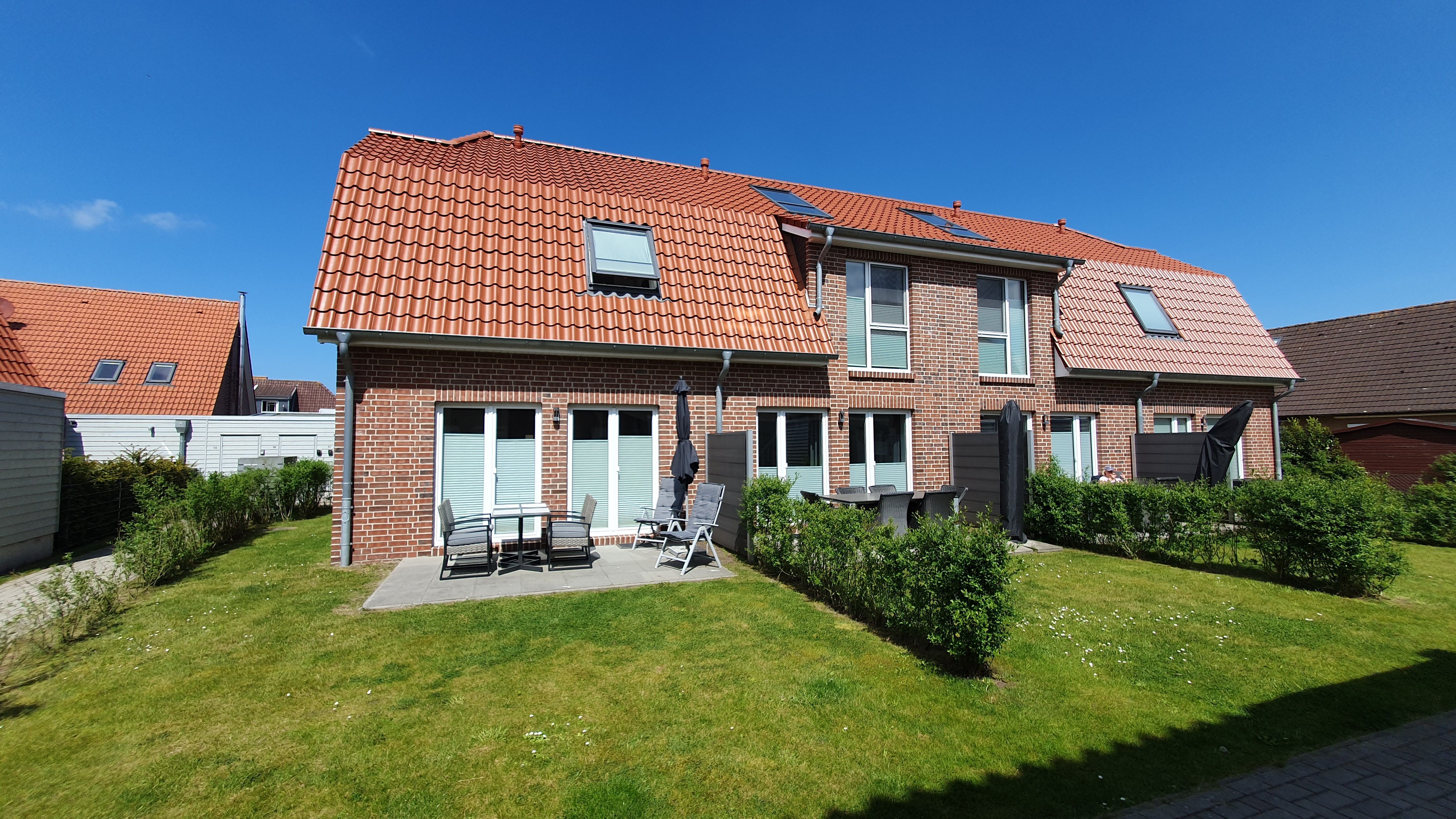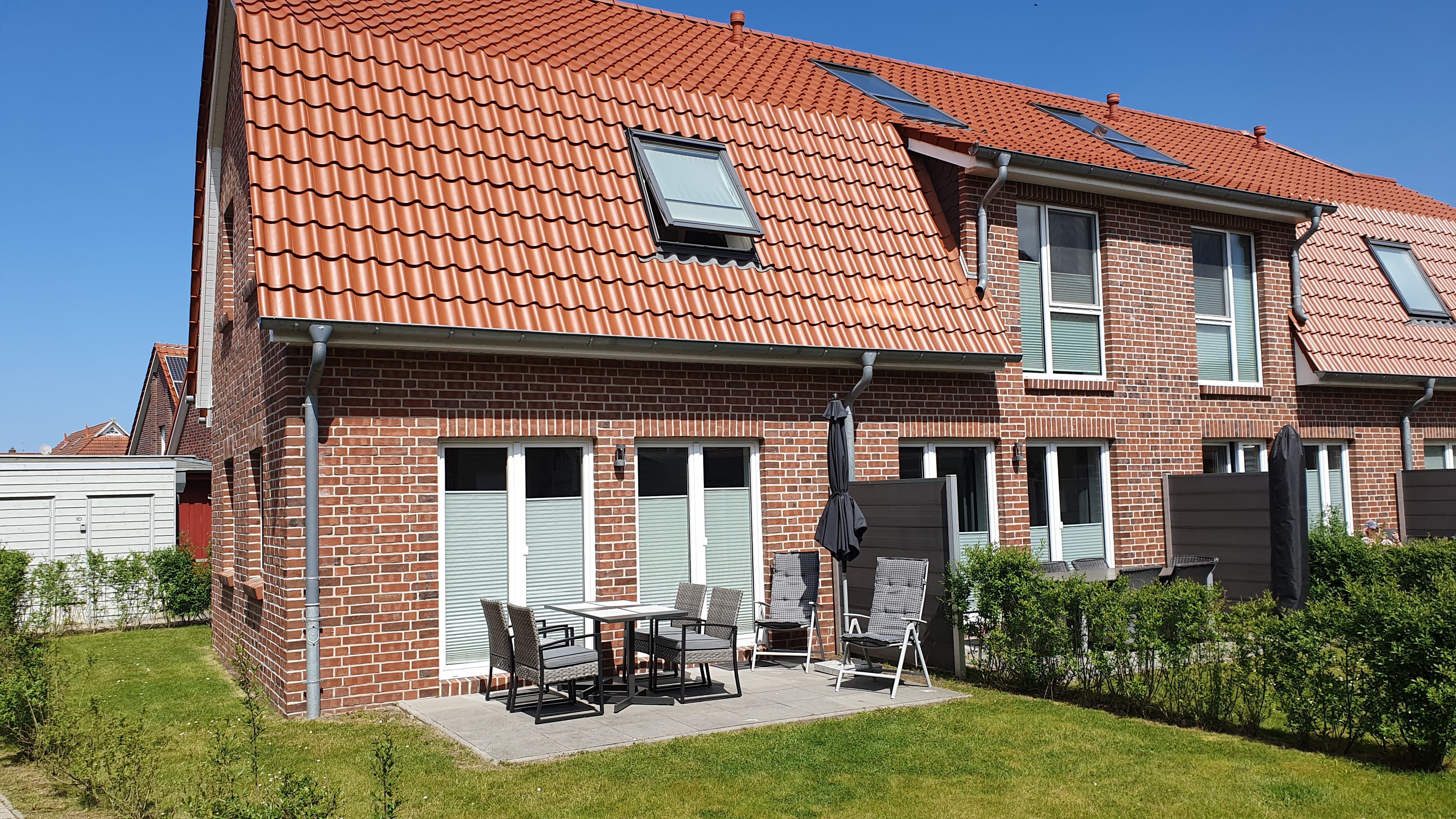 Der Außenbereich des Ferienhauses verfügt über eine möblierte Terrasse in Südausrichtung. Neben einem Parkplatz direkt am Haus, ist auch eine Unterstellmöglichkeit für Ihre Fahrräder vorhanden.