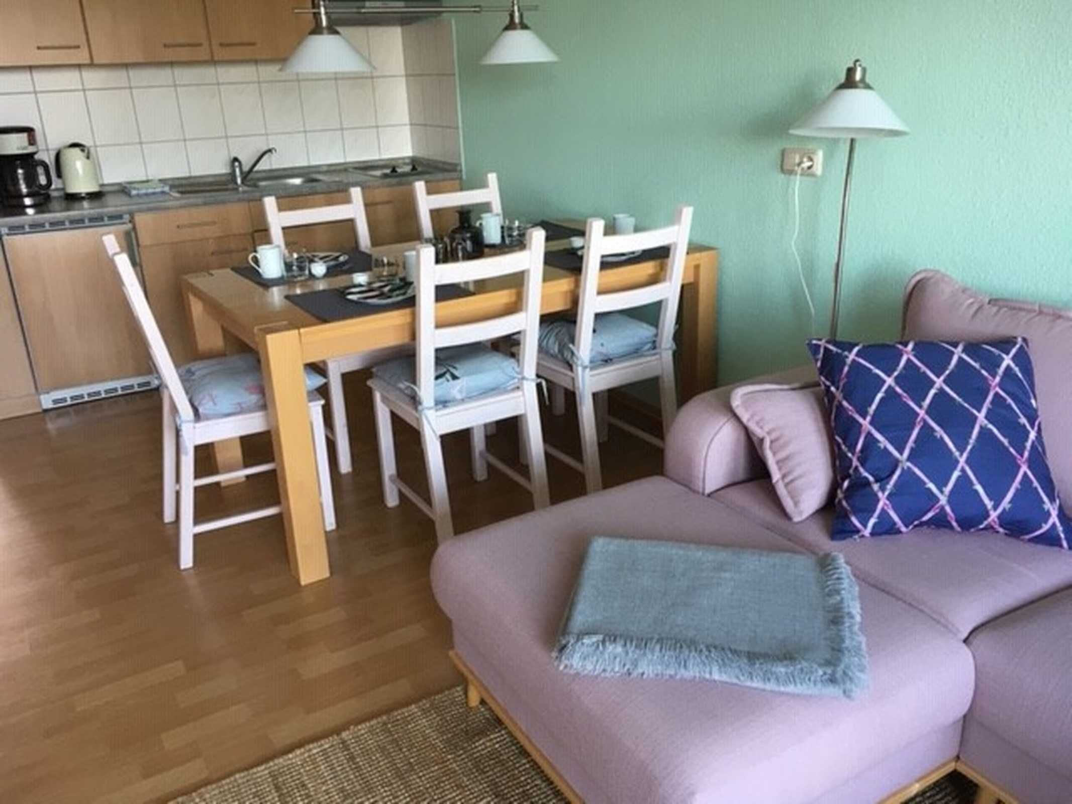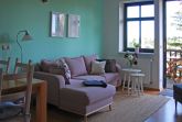 Vor der Wohnung ist auf der Galerie Platz für einen kleinen Tisch mit Stühlen. Die Wohnung ist mit einem Laminatboden sowie Fliesenboden im Bad ausgestattet. Es handelt sich um eine Nichtraucherwohnung.