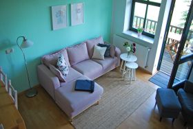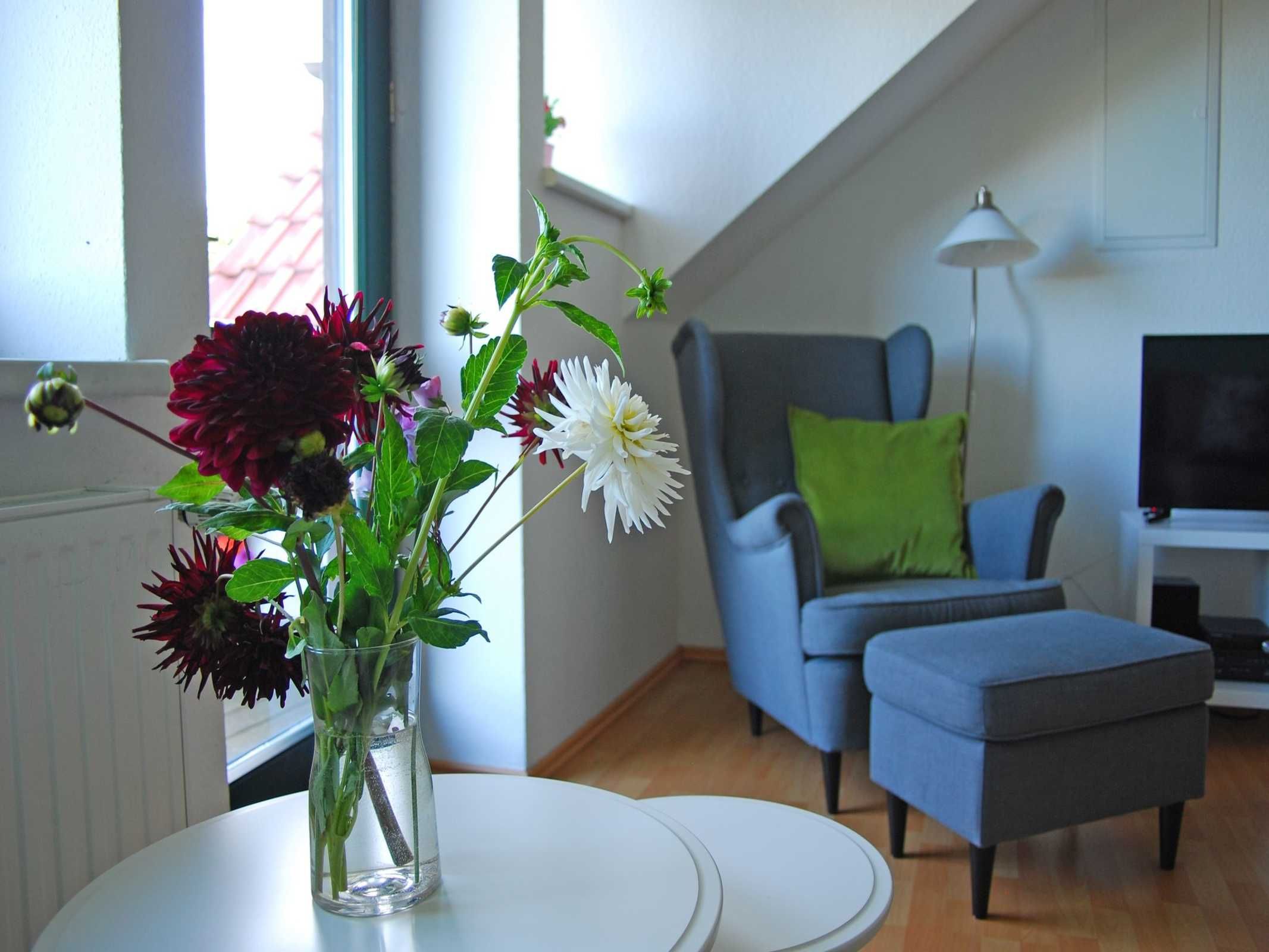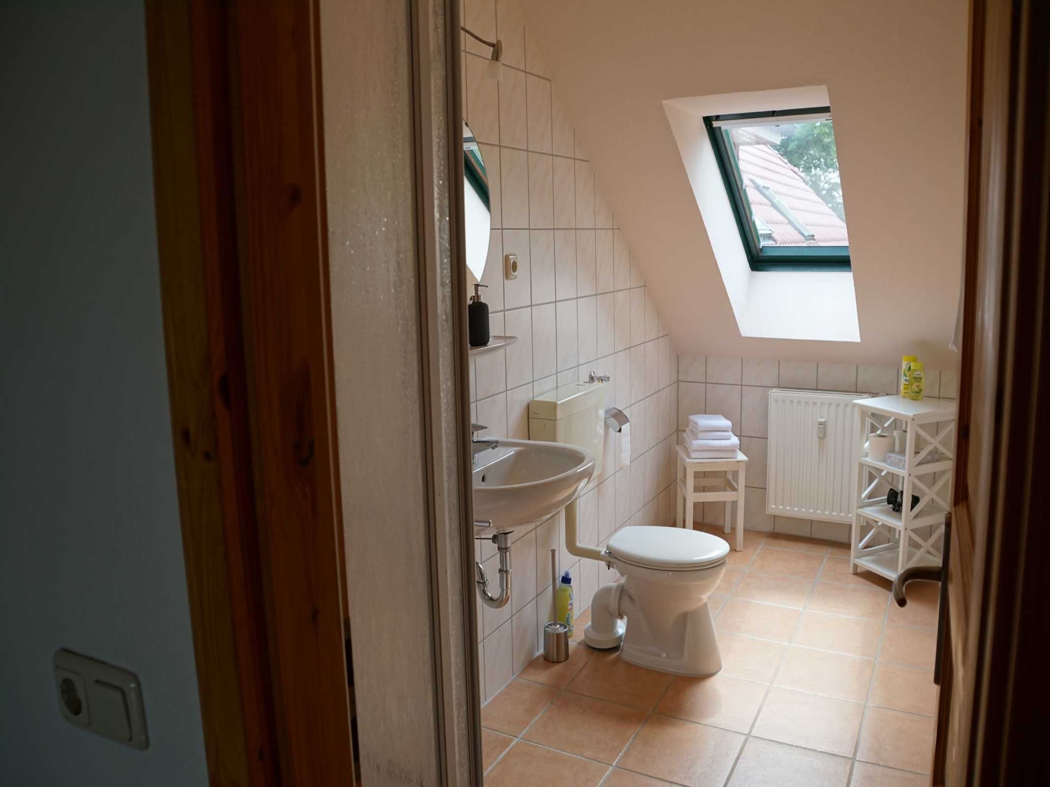 Eine großzügige Ferienwohnung für 2 – 5 Personen auf 2 Etagen mit Dachschrägen (daher größere Grundfläche als angegeben) im Obergeschoss bestehend aus: