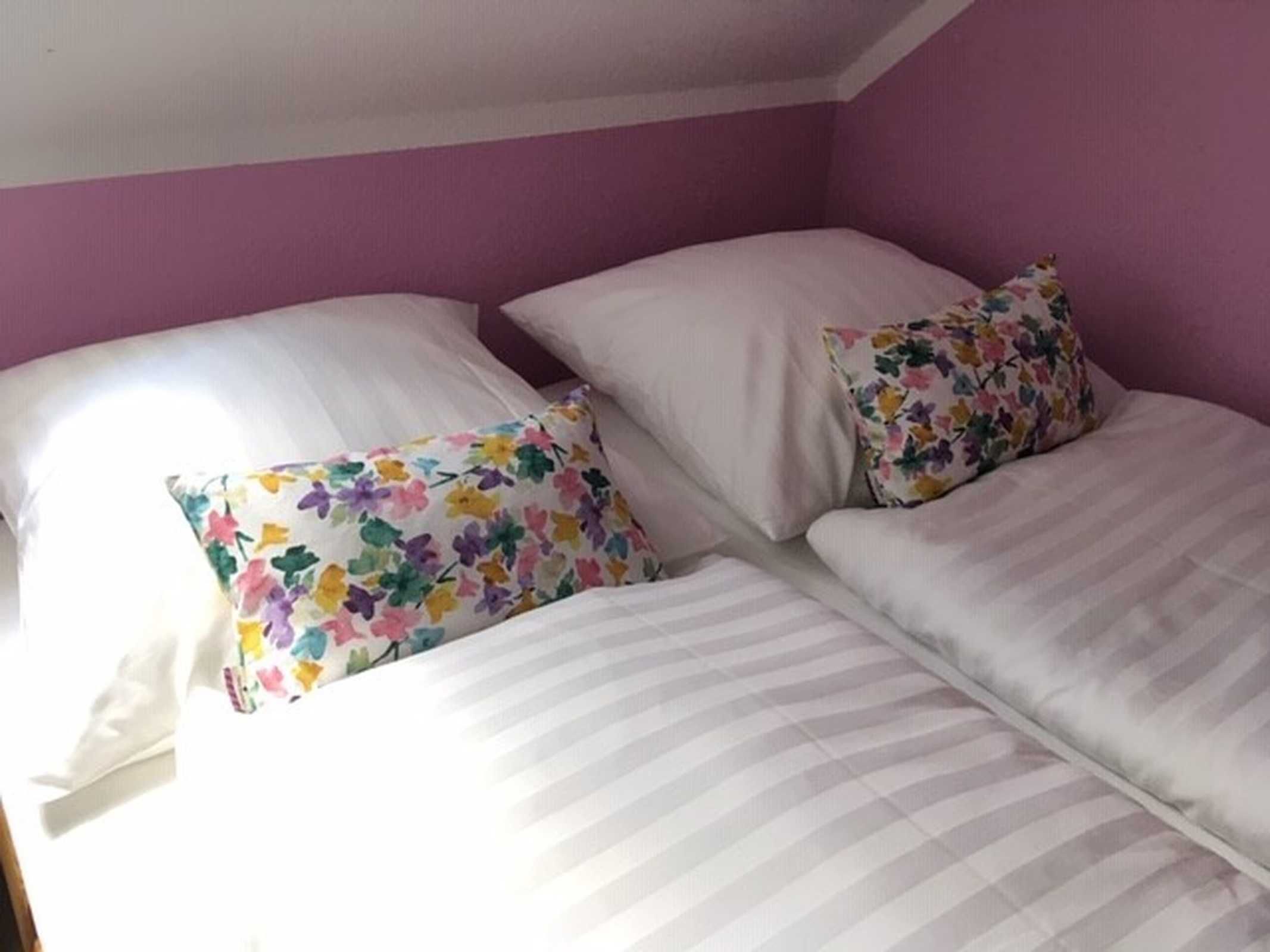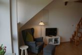 • einem Schlafraum unter der Schräge im Obergeschoss mit einem Doppelbett sowie einem Einzelbett, der über eine Raumspartreppe vom Wohnzimmer aus zu erreichen