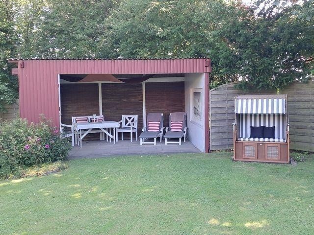 Auch direkt vor der Wohnung steht ein Strandkorb zum Verweilen und Klönschnacken .
