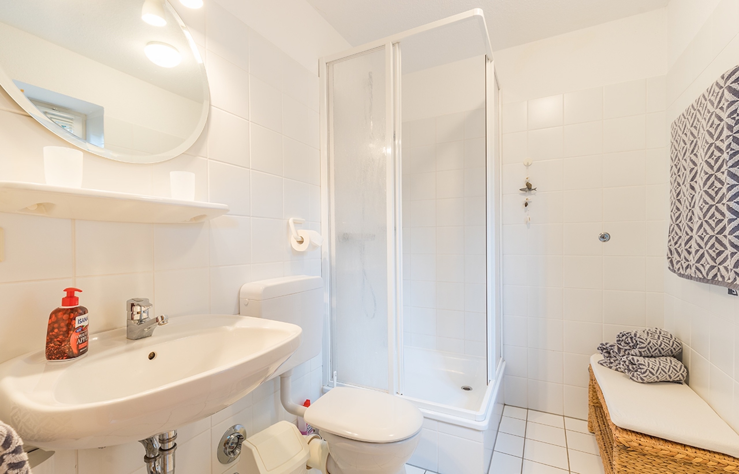 Das Duschbad mit WC ist hell und großzügig mit ausreichend Ablagefläche ausgestattet.