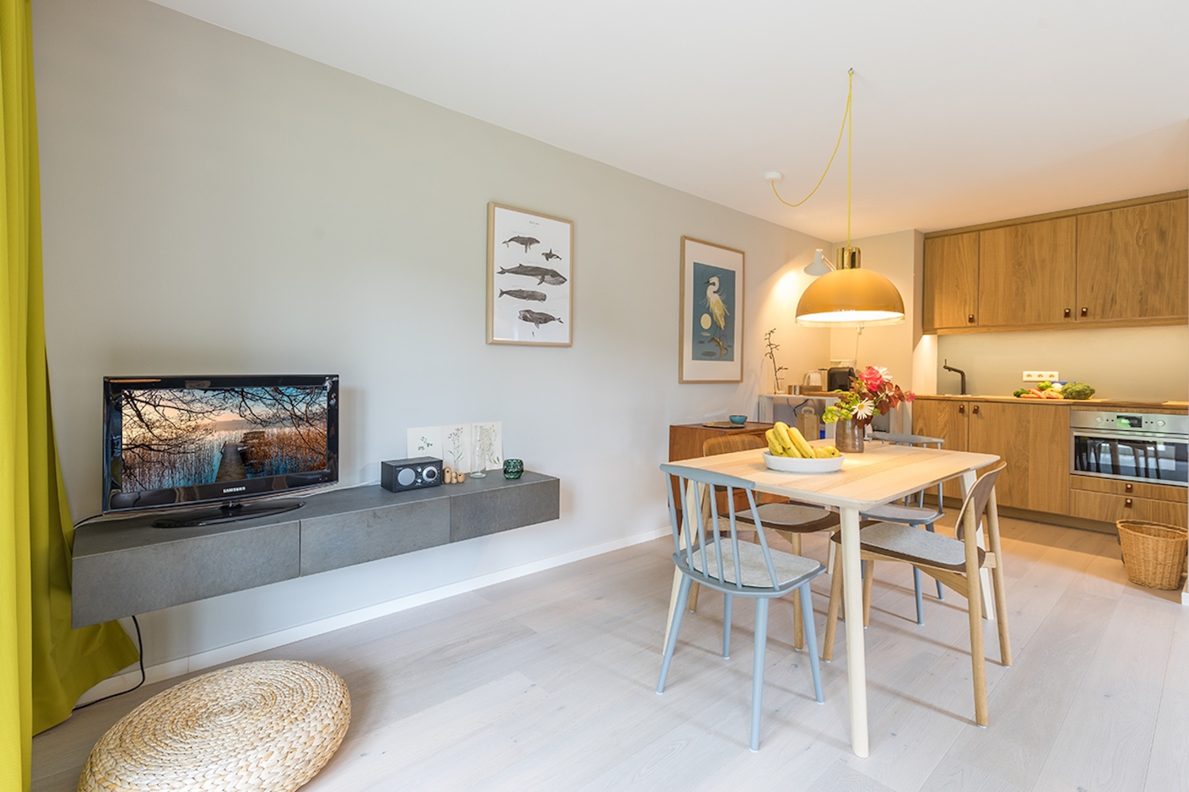 Das Wohnzimmer ist sehr modern eingerichtet. Hier finden Sie eine große Couch, welche sich schnell und einfach zur Schlafcouch umfunktionieren lässt. Selbstverständlich ist Kabel-TV sowie ein Radio, weiterhin befindet sich hier ein Esstisch. Ein WLAN-Zugang steht Ihnen kostenlos zur Verfügung.