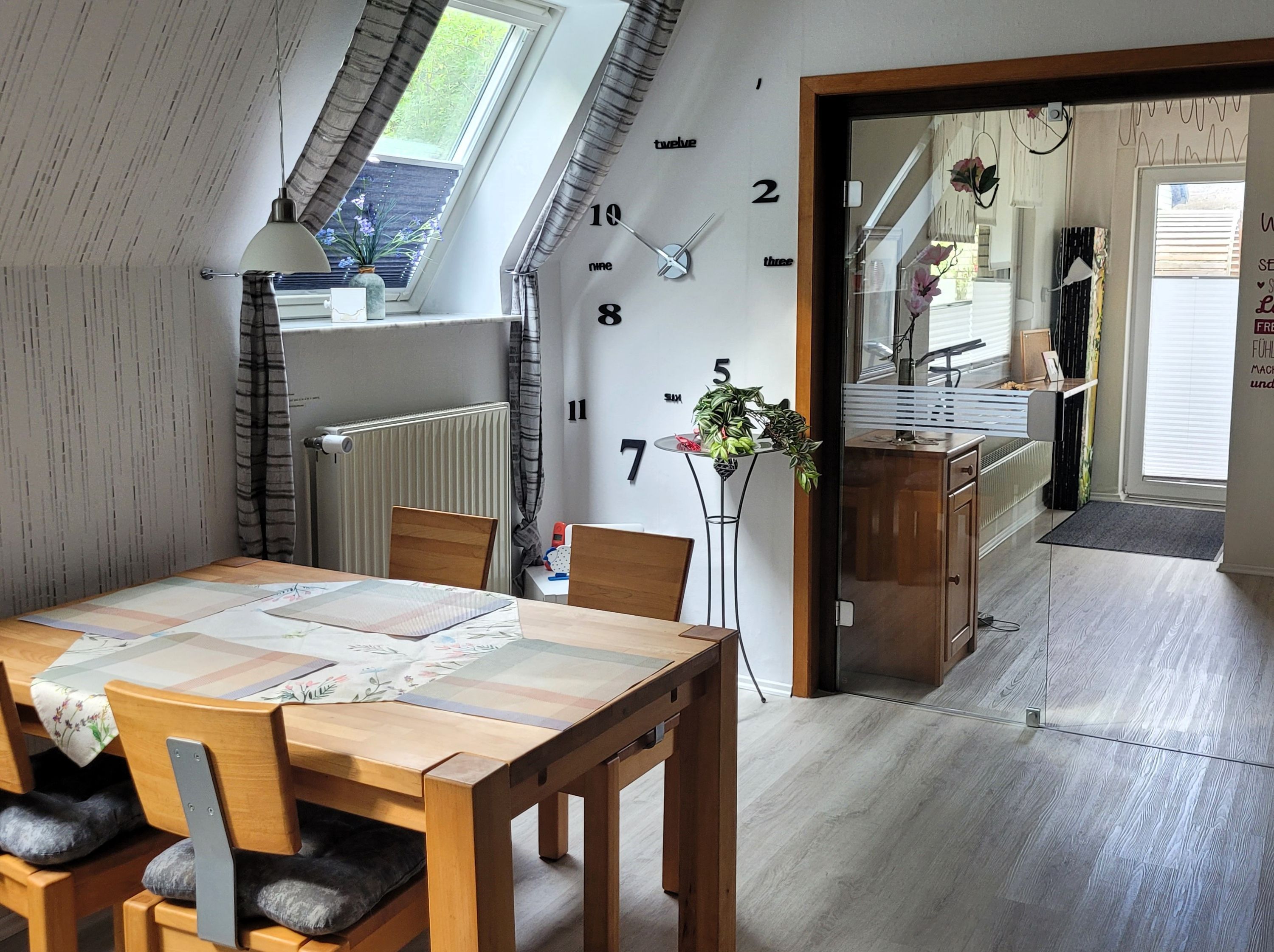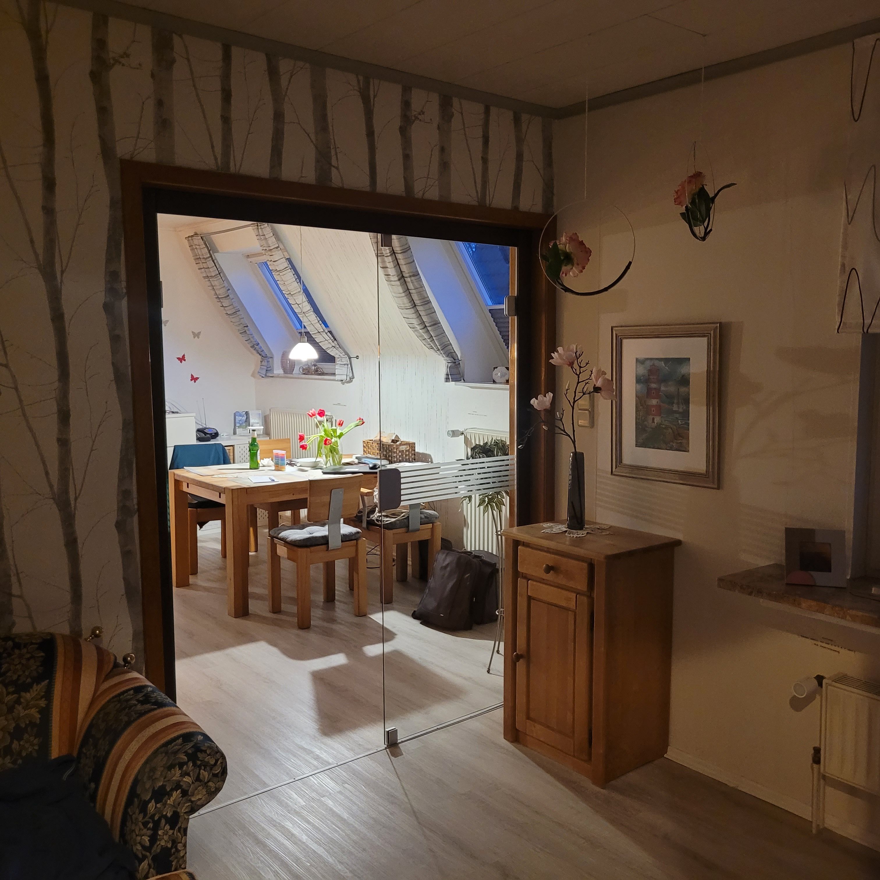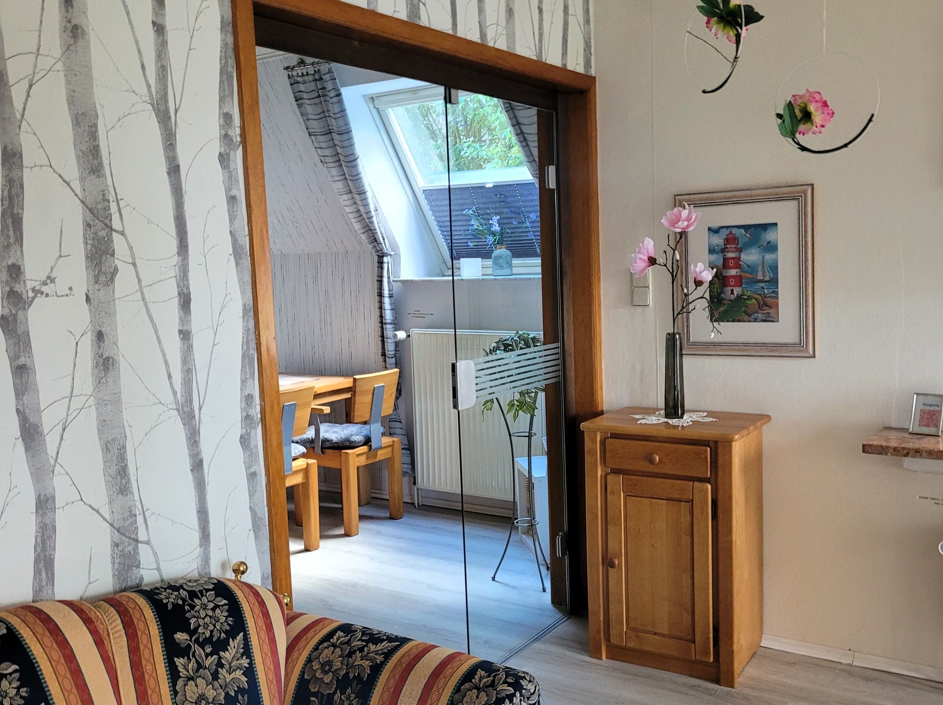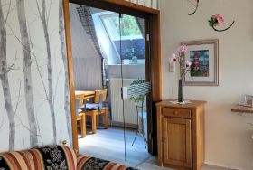 gleichzeitig auch Ausgang zur Terrasse und Zugang zum Wohnzimmer und Schlafzimmer, mit einem großem Fenster zur Frühstücksterrasse hin, lädt mit dem Friesensofa auch zum Verweilen ein.