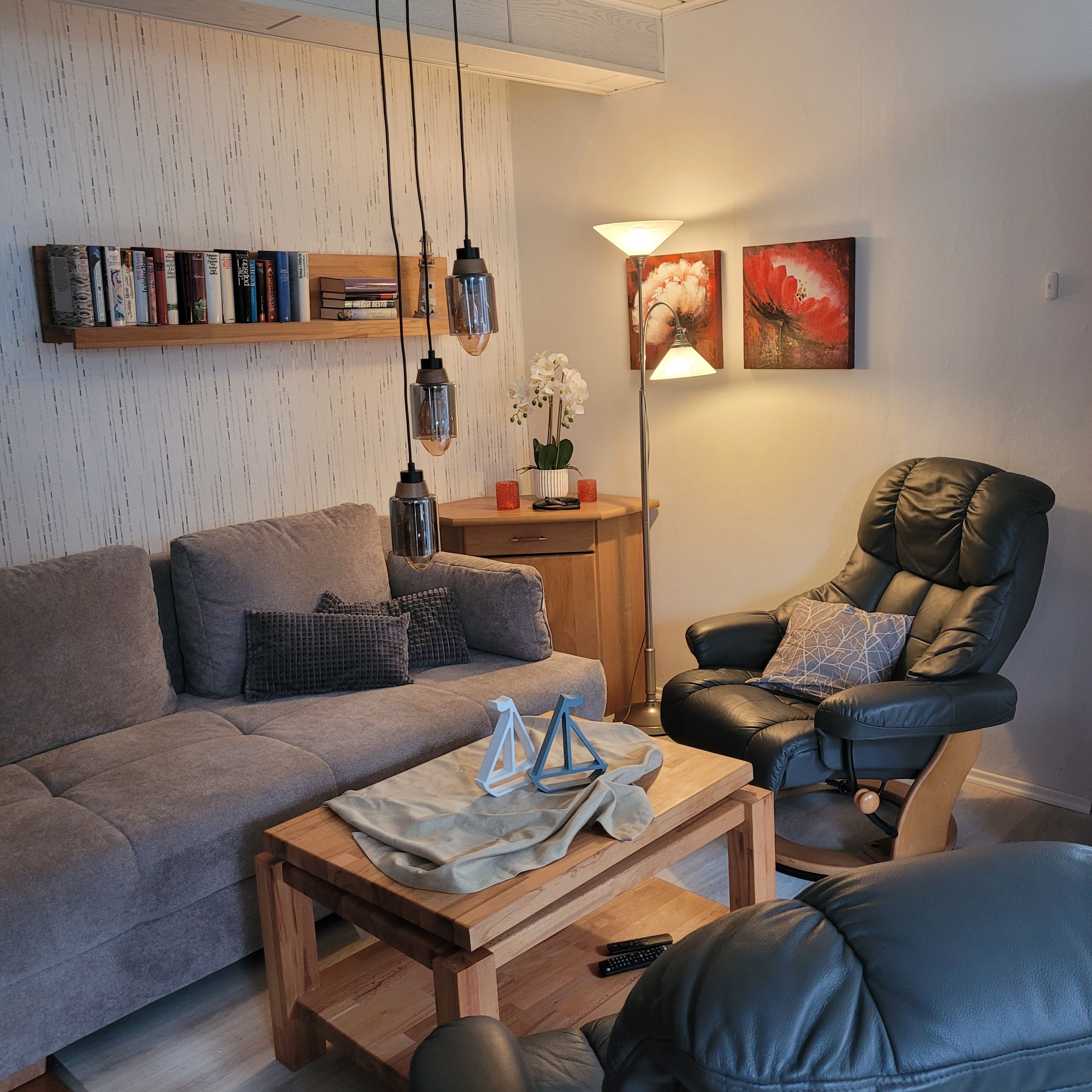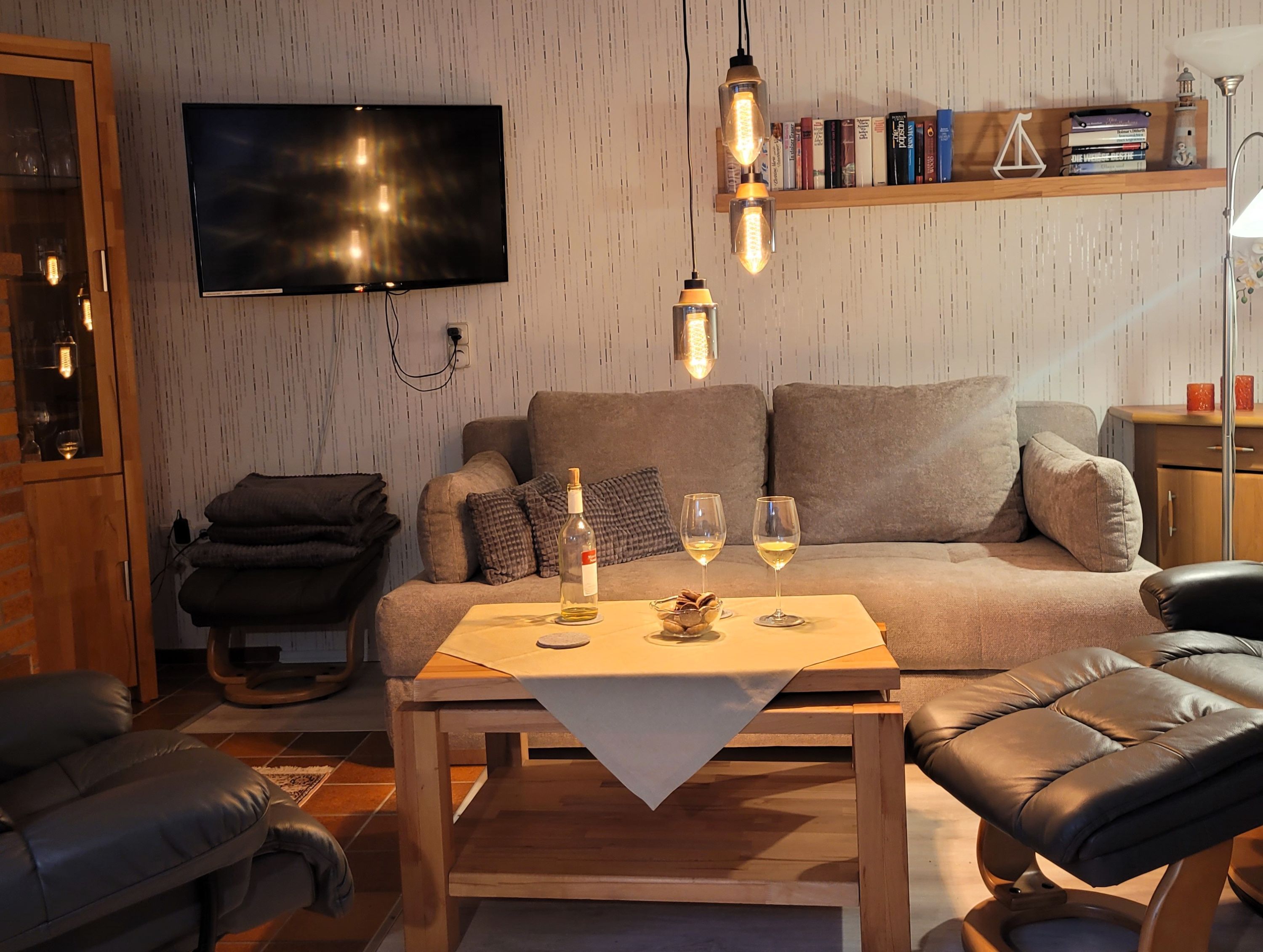 Im großen Wohn-Essraum finden Sie den gemütlichen Kamin (Holz inclusive) vor, vor dem zwei äußerst gemütliche Fernsehsessel mit Fußteil stehen.