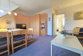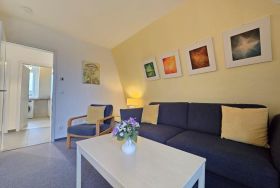 Die Ferienwohnung bietet eine durchdachte Raumaufteilung mit zwei Schlafzimmern, die mit insgesamt vier Einzelbetten ausgestattet sind. Die separate Küche verfügt über alles Notwendige, darunter einen Geschirrspüler, Elektro-/Gasherd, Backofen, Mikrowelle, Kühlschrank mit Gefriermöglichkeit und einen Toaster. Ein gemütlicher Esstisch und ein Kinderhochstuhl runden die Kochmöglichkeiten ab. Im Badezimmer erwartet man ein modernes Duschbad. Die Wohnfläche ist mit einem Sofa, einem Sessel und einer HiFi-Anlage gestaltet, um gemütliche Abende zu genießen. Die Wohnung ist allergikergeeignet und bietet modernes WLAN, TV sowie einen Parkplatz. Praktische Annehmlichkeiten wie eine Waschmaschine, Bügeleisen und Reinigungsmittel sorgen für zusätzlichen Komfort. Ein Starterset mit Gewürzen, Seife und Toilettenpapier ist ebenfalls vorhanden. Breite Auswahl an Brettspielen sorgt für Unterhaltung. Diese Ferienwohnung ist ideal für erholsame Tage und entspannte Abende.