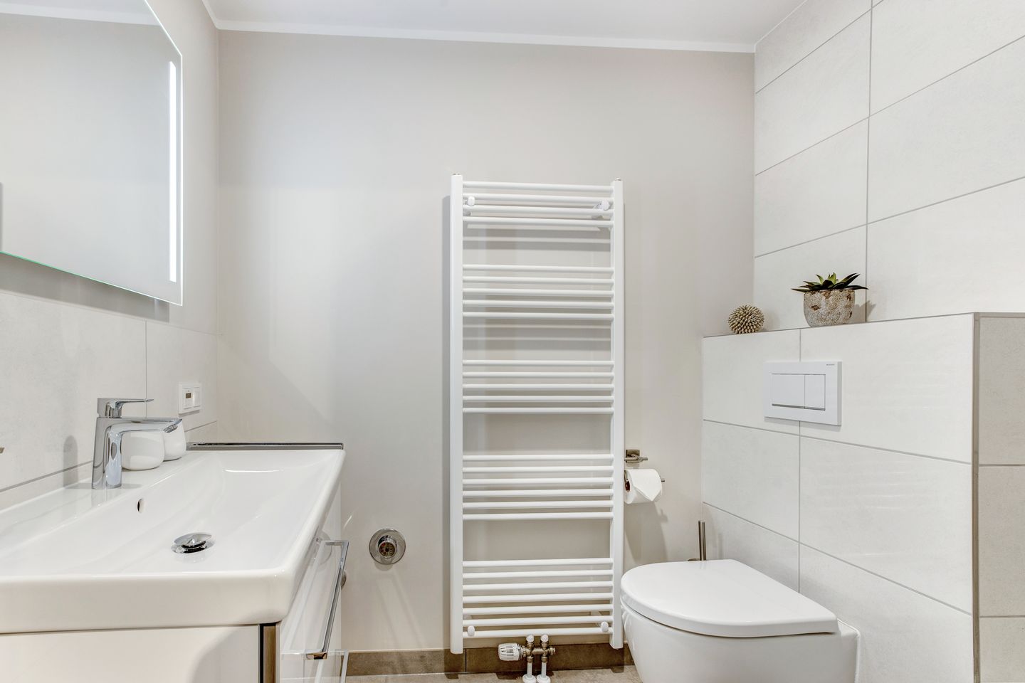 Ebenfalls im Erdgeschoss befindet sich auch eins der insgesamt drei Schlafzimmer mit komfortablen Polsterbett sowie hochwertigen Einbauschränken für die Urlaubsgarderobe. Gleich nebenan dann das ganz in Weiß gehaltene Duschbad mit Regendusche für den perfekten Start in den Tag.