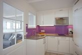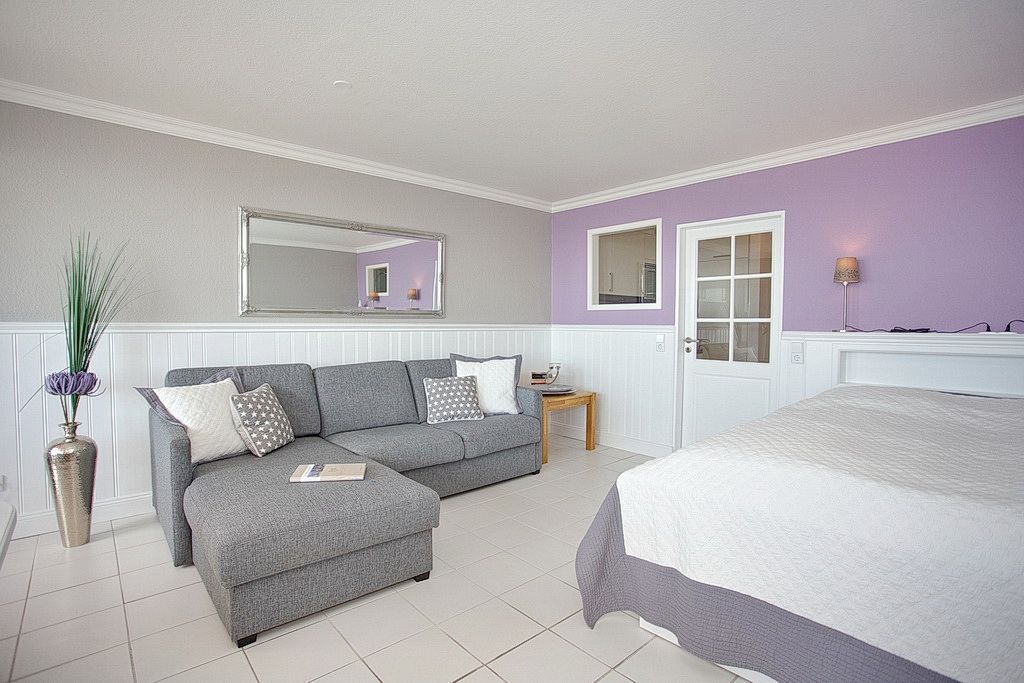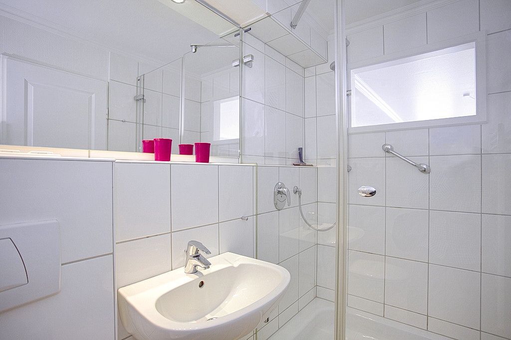 Das moderne 1-Zimmer-Apartment im 1. OG vom Haus Metropol mit ca. 43 m² überzeugt durch sein großes gefliestes Wohn-/Schlafzimmer mit feststehendem Doppelbett (160x200), Couchecke und Essplatz direkt am Fenster. Zudem finden Sie im Wohnbereich einen Flat-TV, ein Radio und WLAN (ohne Gewähr). Die seperate Küche mit Backofen, Geschirrspüler und Cerankochfeld ist voll ausgestattet. Im Eingangsbereich befindet sich der Zugang zum Duschbad mit WC.