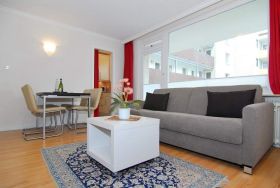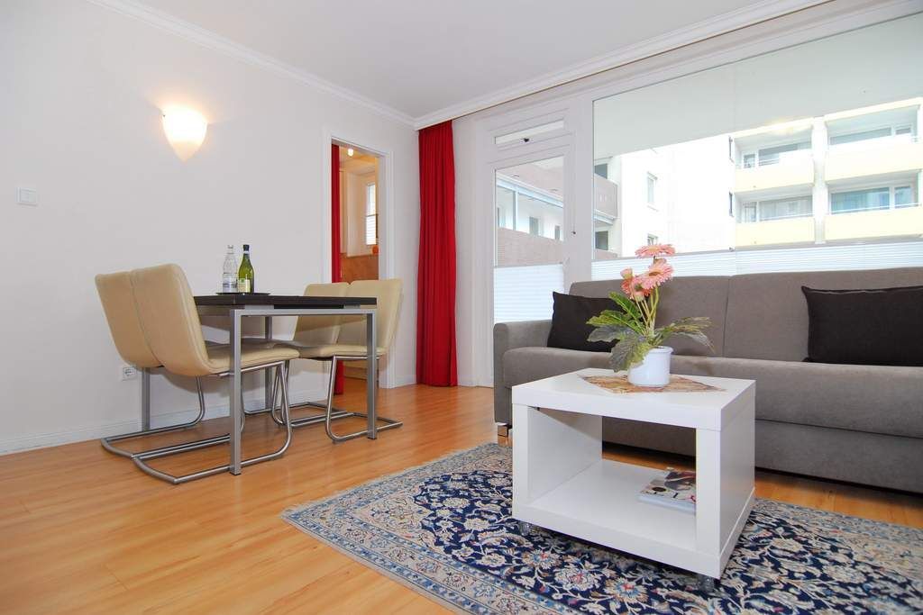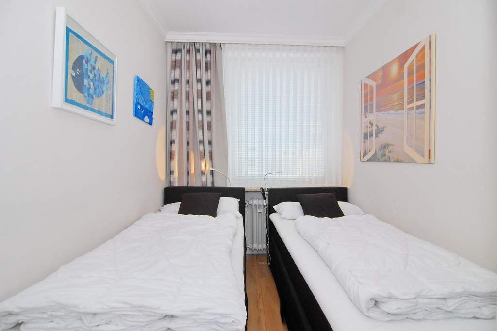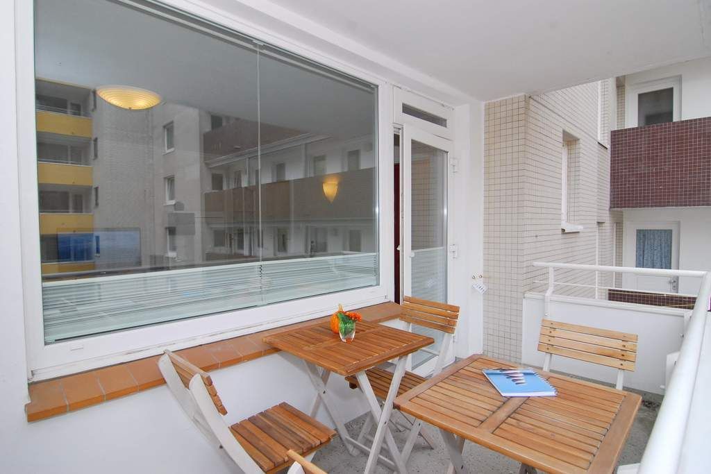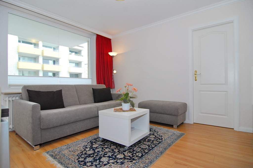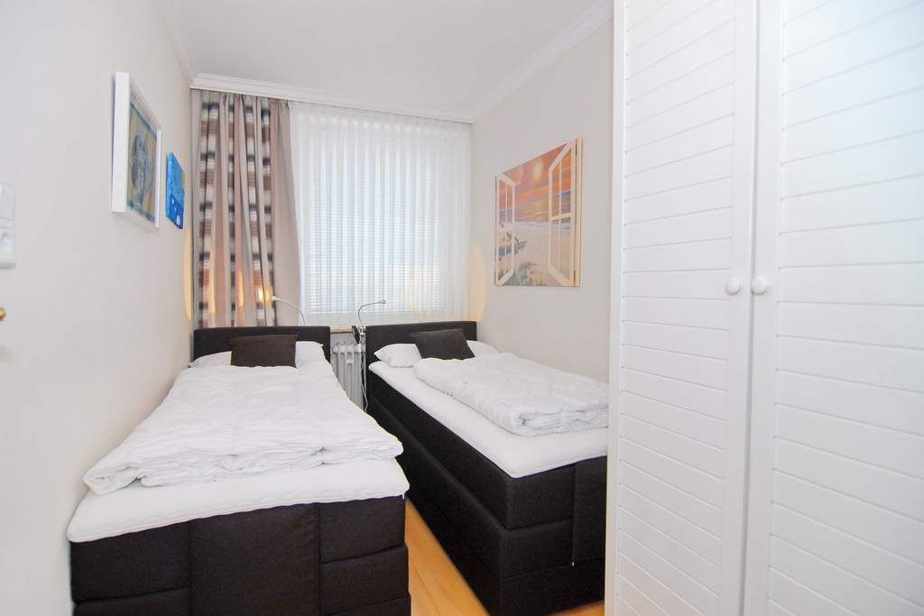 Moderne 2- Zimmer-Ferienwohnung im Haus Atlantik, 1 OG., ca. 35 m², Nichtraucher. Wohnraum mit Schlafcouch, Essplatz, TV, Internet (ohne Gewähr), DVD und Stereo- Anlage. Nord-Ost-Balkon mit Balkonmöbel, kleine Küche mit Mikrowelle und Geschirrspüler, Duschbad/ WC, Schlafzimmer mit 2 Einzelbetten (je 80x200 - zusammenschiebbar und elektr. höhenverstellbar) und 1 Einzelbett (1,90x70). Die Wohnung ist komplett mit Laminat ausgelegt. Tierhaltung ist nicht gestattet. Wäschepaket sowie PKW- Stellplatz nur auf Bestellung.