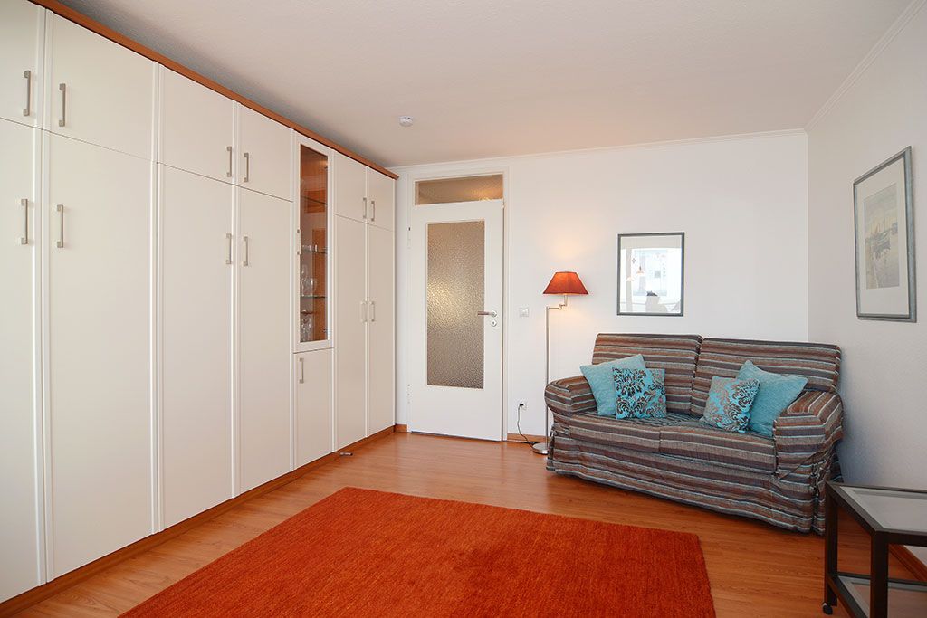 Hübsches1-Zimmer-Ferienwohnung, ca. 34 qm im Haus Sylter Welle, 4 OG. Nichtraucher-Whg.! Wohn-/Schlafraum mit Westbalkon und Meeresblick, 2 Einzelschrankbetten, Esstisch mit 2 Lederstühlen am Fenster und Blick auf das Meer, Zweisitzer-Couch, Vitrine-und Kleiderschrank, Flat-TV und Radio. W-Lan (ohne Gewähr) Das Apartment ist mit Holzlaminat ausgelegt. Küchenzeile im Flur mit Mikrowelle und Geschirrspüler, Vollbad / WC mit Duschvorrichtung. Tierhaltung ist nicht gestattet. Bettwäsche und Handtücher sind zur Anreise aufgezogen. Ein PKW-Stellplatz kann kostenpflichtig zugebucht werden.