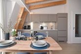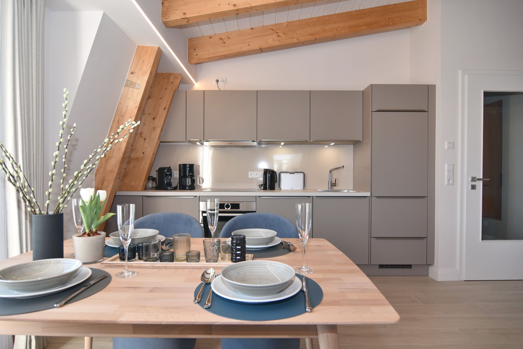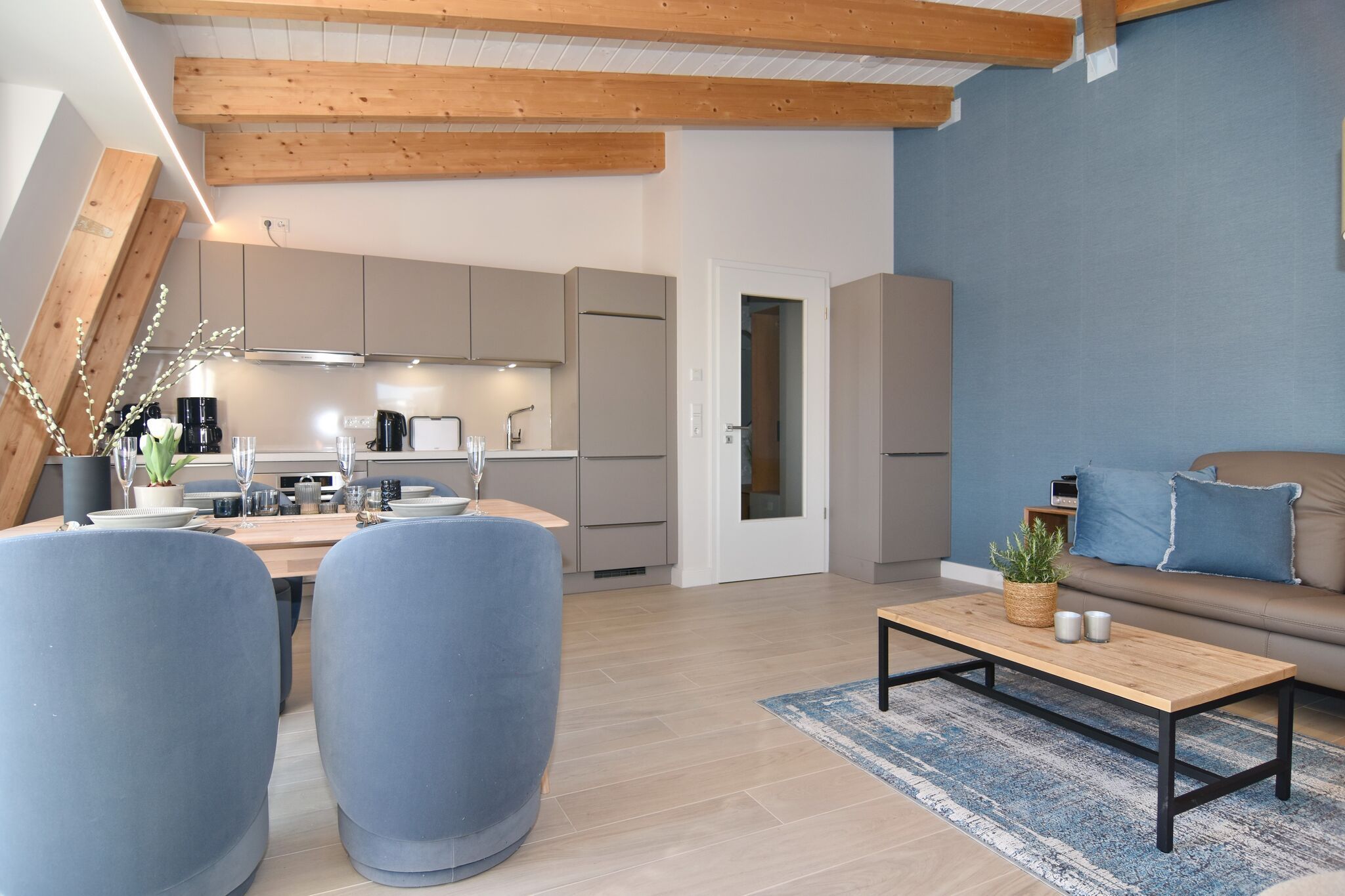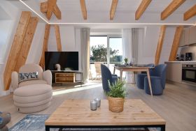 Die hochwertige 2-Zimmer-Wohnung im 2. OG mit ca. 59 qm ist für maximal 2 Personen ausgestattet. Vom Flur mit Garderobe gelangen Sie in das Wohnzimmer mit offener Küche und möbliertem Südbalkon. Die hochwertige Küche bietet neben Induktionsherd auch Geschirrspüler, Kühlschrank mit Gefrierfach und Backofen mit integrierter Mikrowelle. Die Wohnung bietet Ihnen ein Schlafzimmer und ein Duschbad /WC mit Haar- und Handtuchtrockner. Das Schlafzimmer ist mit einem Boxspringbett (180x200) der Marke FBF, Flat-TV und Einbauschrank ausgestattet. Bis auf das Schlafzimmer sind die Räume mit großformatigen Fliesen versehen.