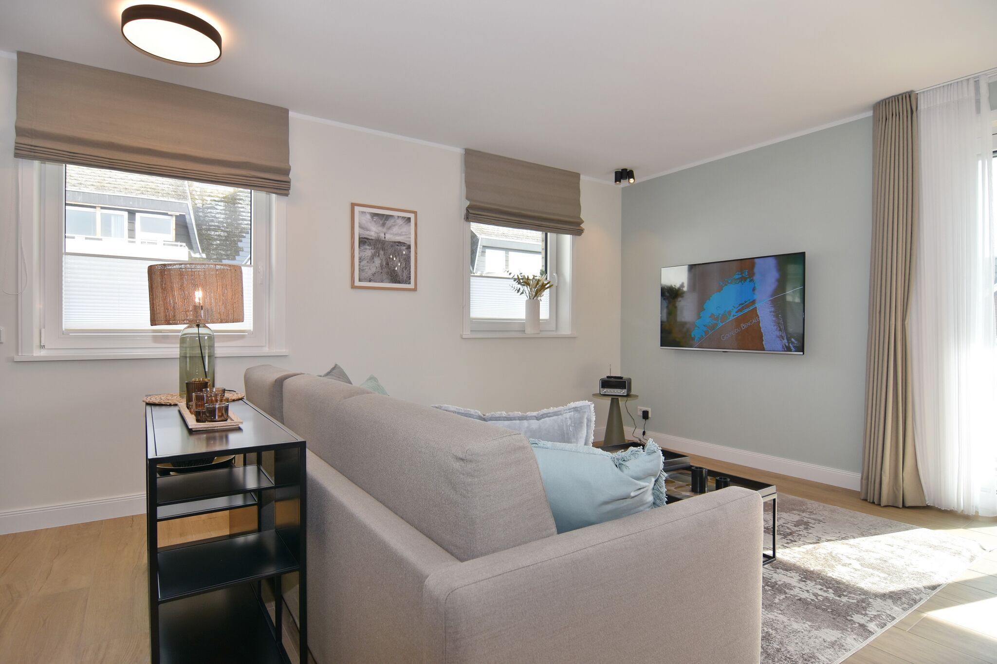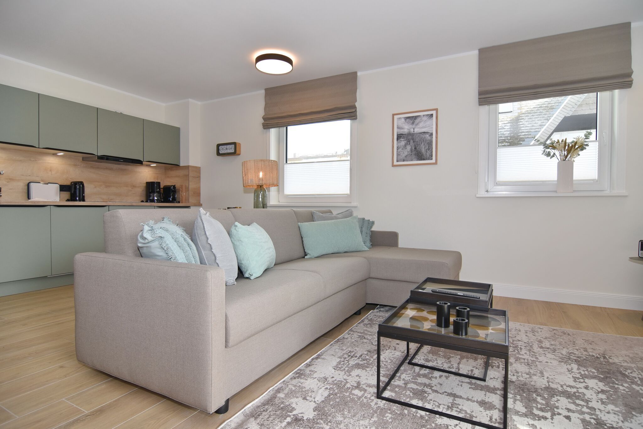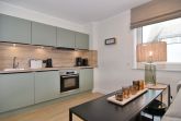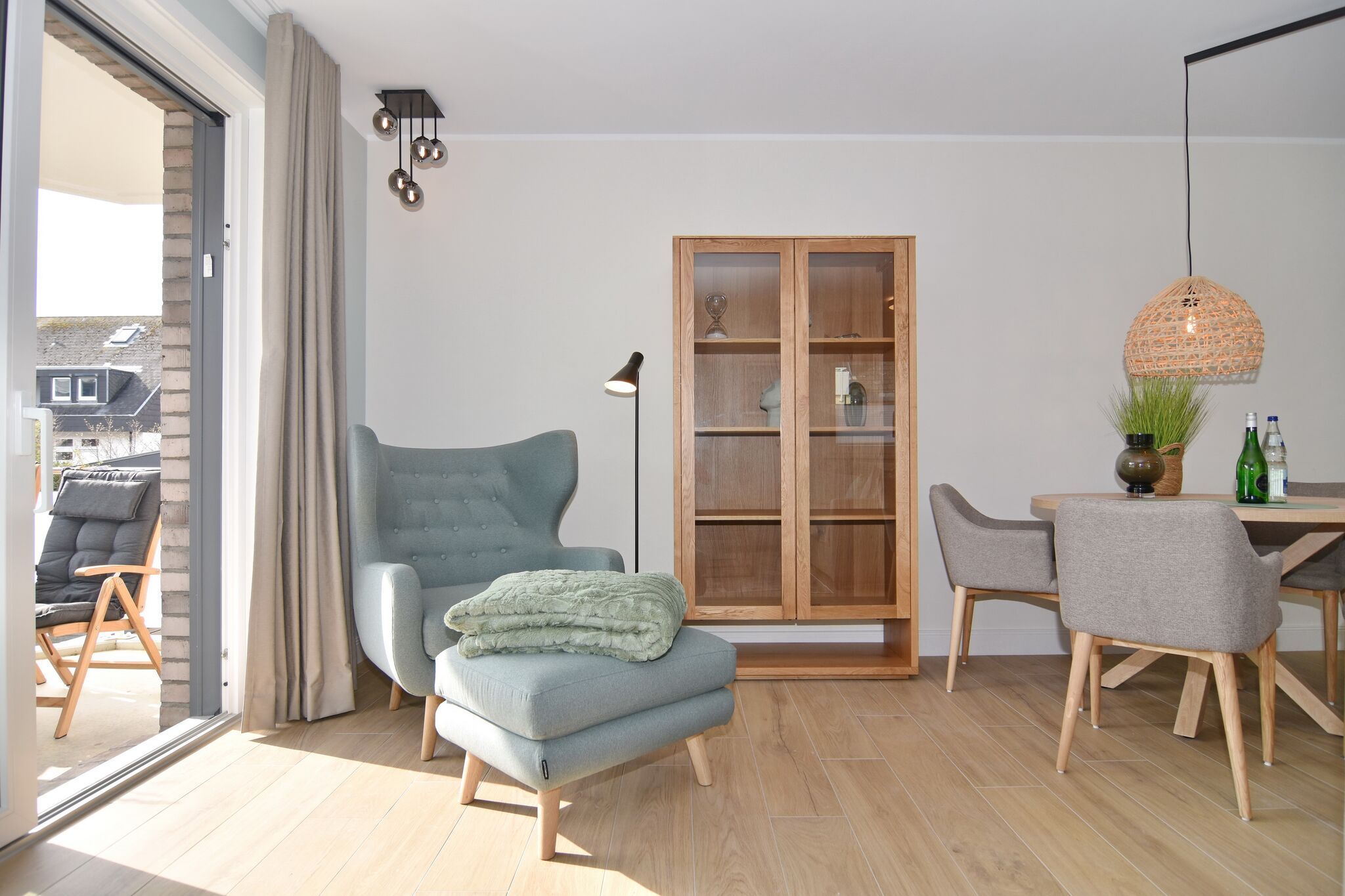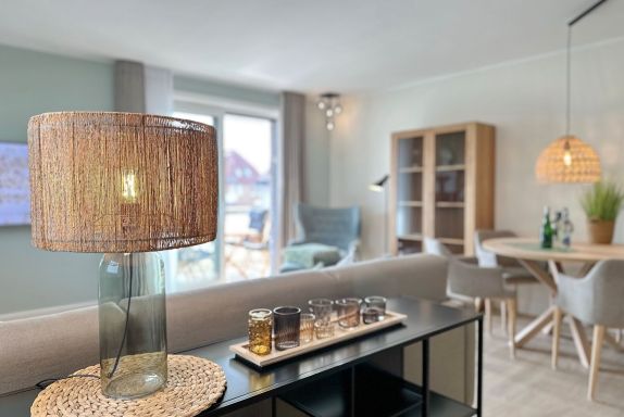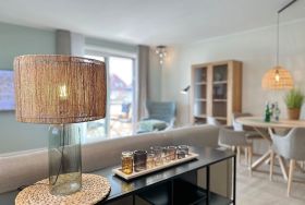 Die hochwertige 2-Zimmer-Wohnung im 1.OG mit ca. 59 qm ist für maximal 3 Personen ausgestattet. Vom Flur mit Garderobe gelangen Sie in das Wohnzimmer mit offener Küche und möbliertem Ostbalkon. Die hochwertige Küche bietet neben Induktionsherd auch Geschirrspüler, Kühlschrank mit Gefrierfach und Backofen mit integrierter Mikrowelle. Die Wohnung bietet Ihnen ein Schlafzimmer und ein Duschbad /WC mit Haar- und Handtuchtrockner. Das Schlafzimmer ist mit einem Boxspringbett (200x200) der Marke FBF, Flat-TV und Einbauschrank ausgestattet. Bis auf das Schlafzimmer sind die Räume mit großformatigen Fliesen versehen.