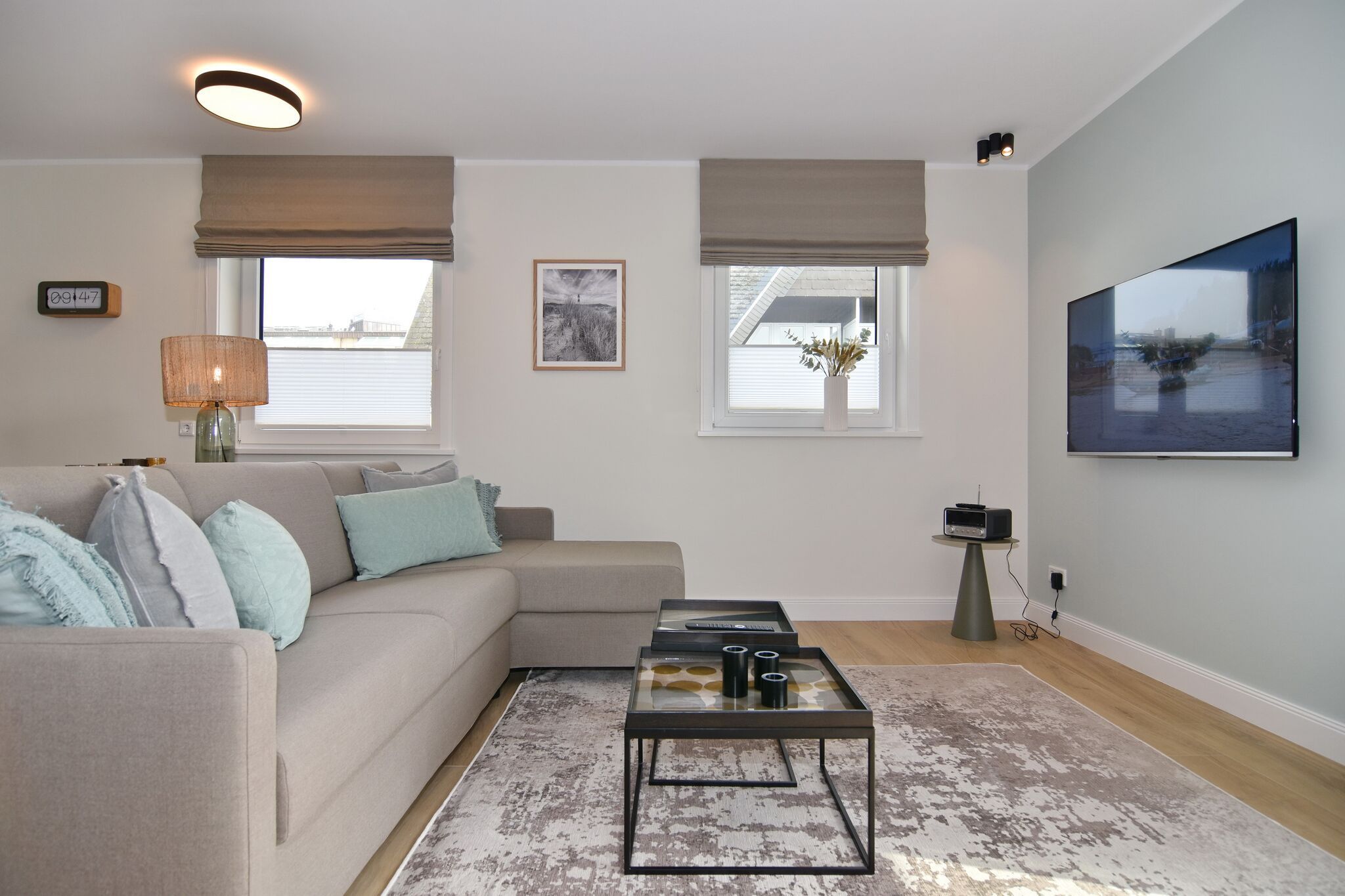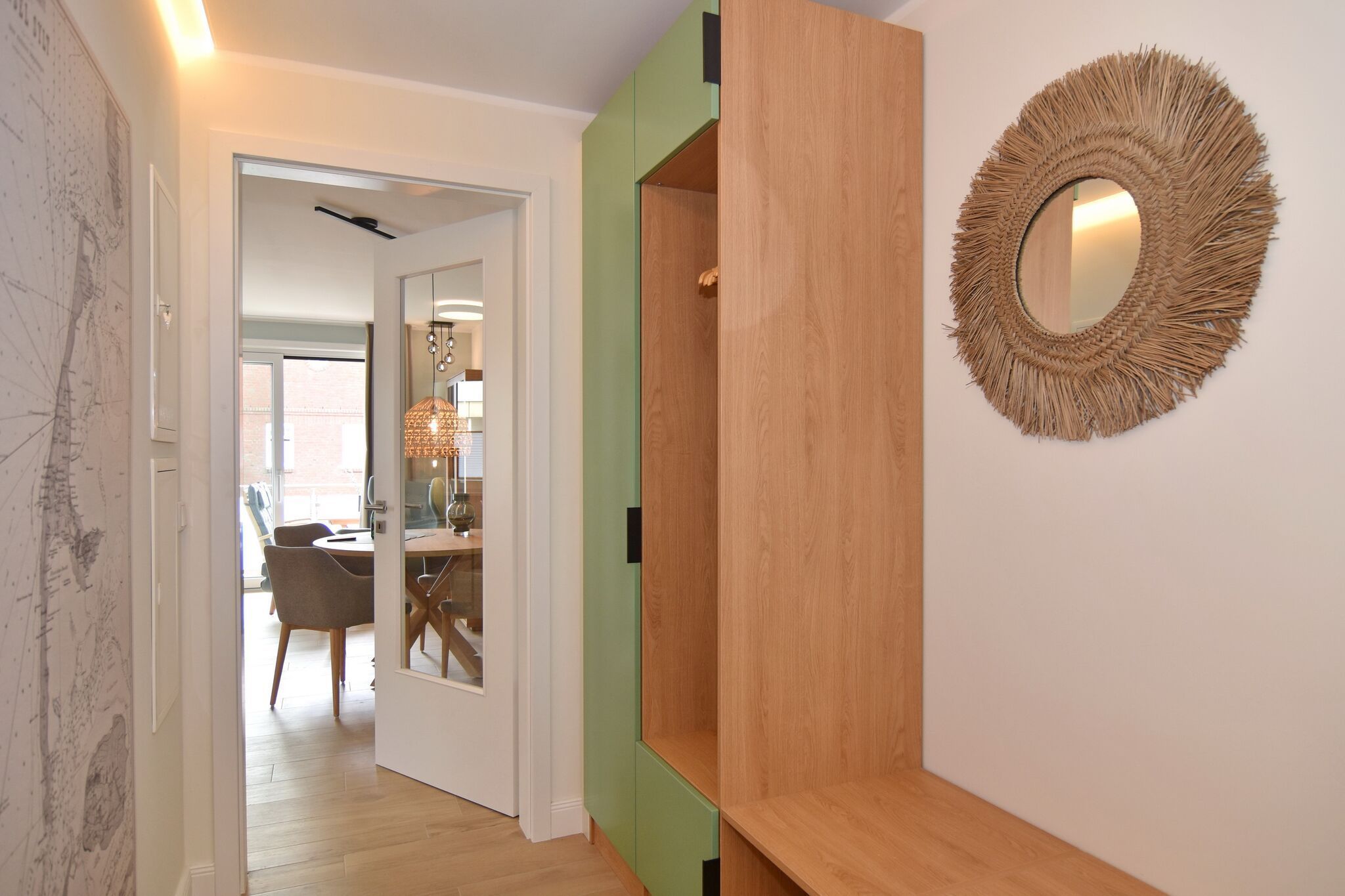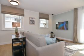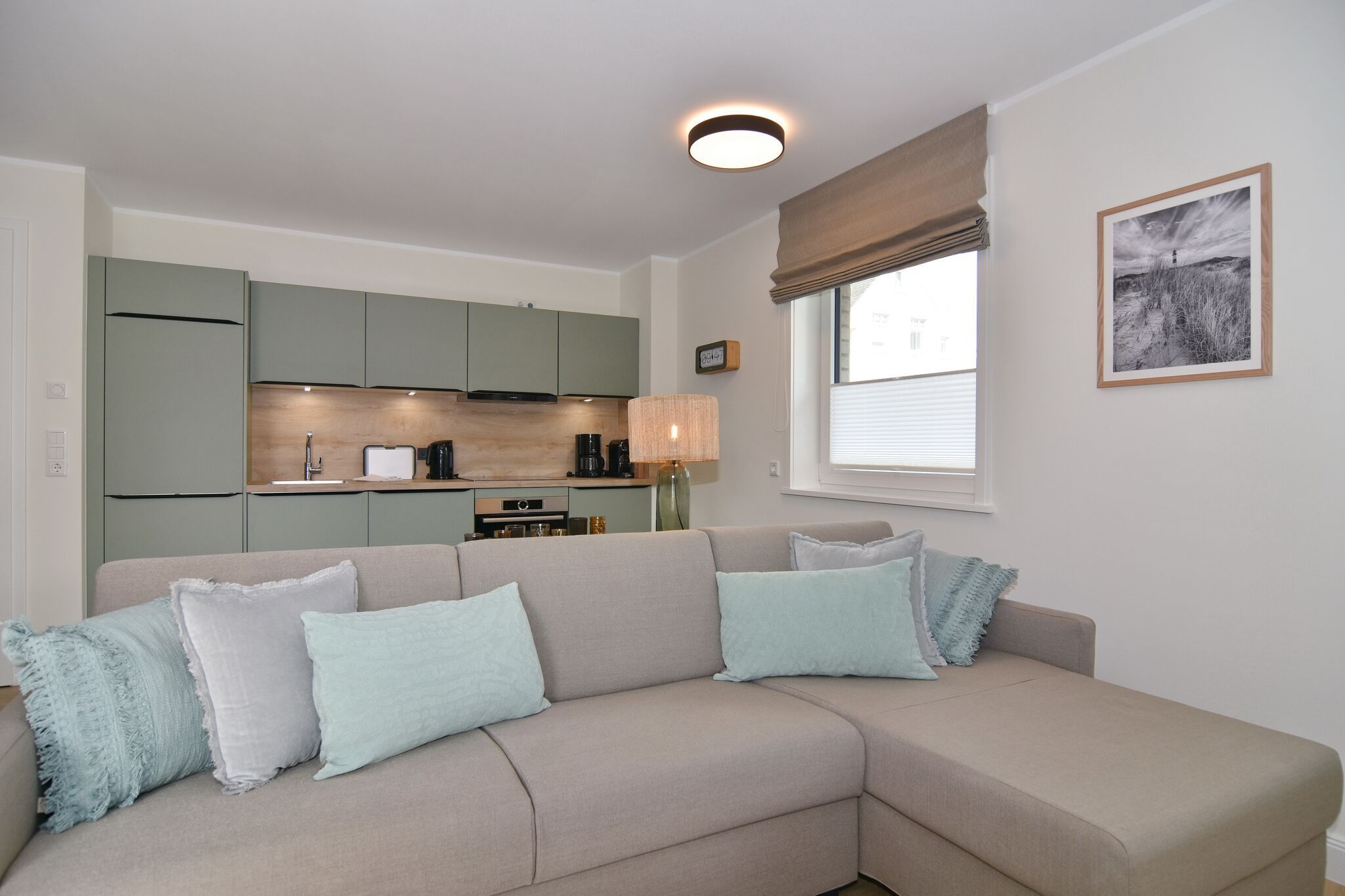 Die hochwertige 2-Zimmer-Wohnung im 1.OG mit ca. 59 qm ist für maximal 3 Personen ausgestattet. Vom Flur mit Garderobe gelangen Sie in das Wohnzimmer mit offener Küche und möbliertem Ostbalkon. Die hochwertige Küche bietet neben Induktionsherd auch Geschirrspüler, Kühlschrank mit Gefrierfach und Backofen mit integrierter Mikrowelle. Die Wohnung bietet Ihnen ein Schlafzimmer und ein Duschbad /WC mit Haar- und Handtuchtrockner. Das Schlafzimmer ist mit einem Boxspringbett (200x200) der Marke FBF, Flat-TV und Einbauschrank ausgestattet. Bis auf das Schlafzimmer sind die Räume mit großformatigen Fliesen versehen.
