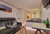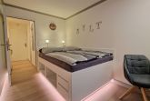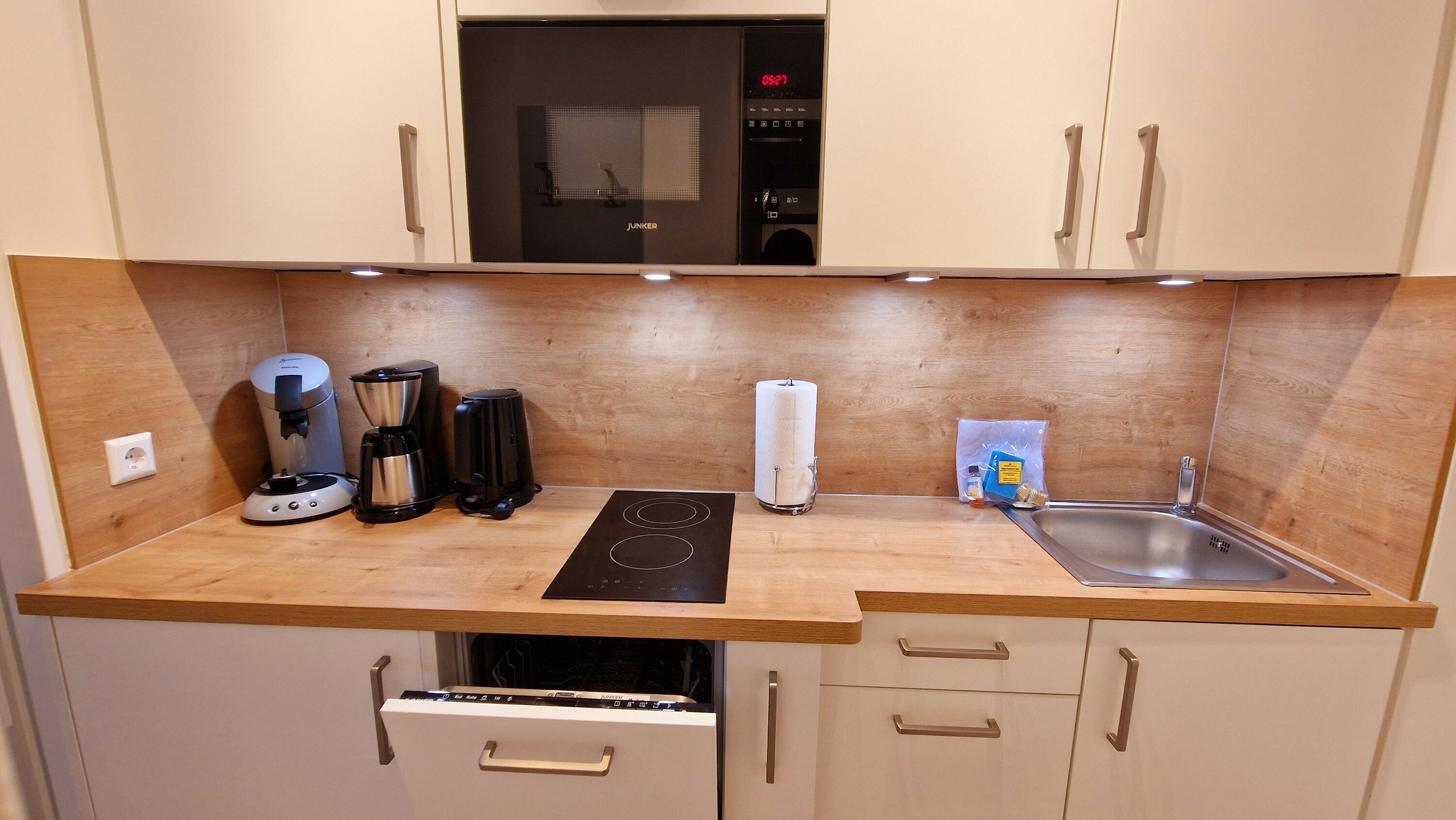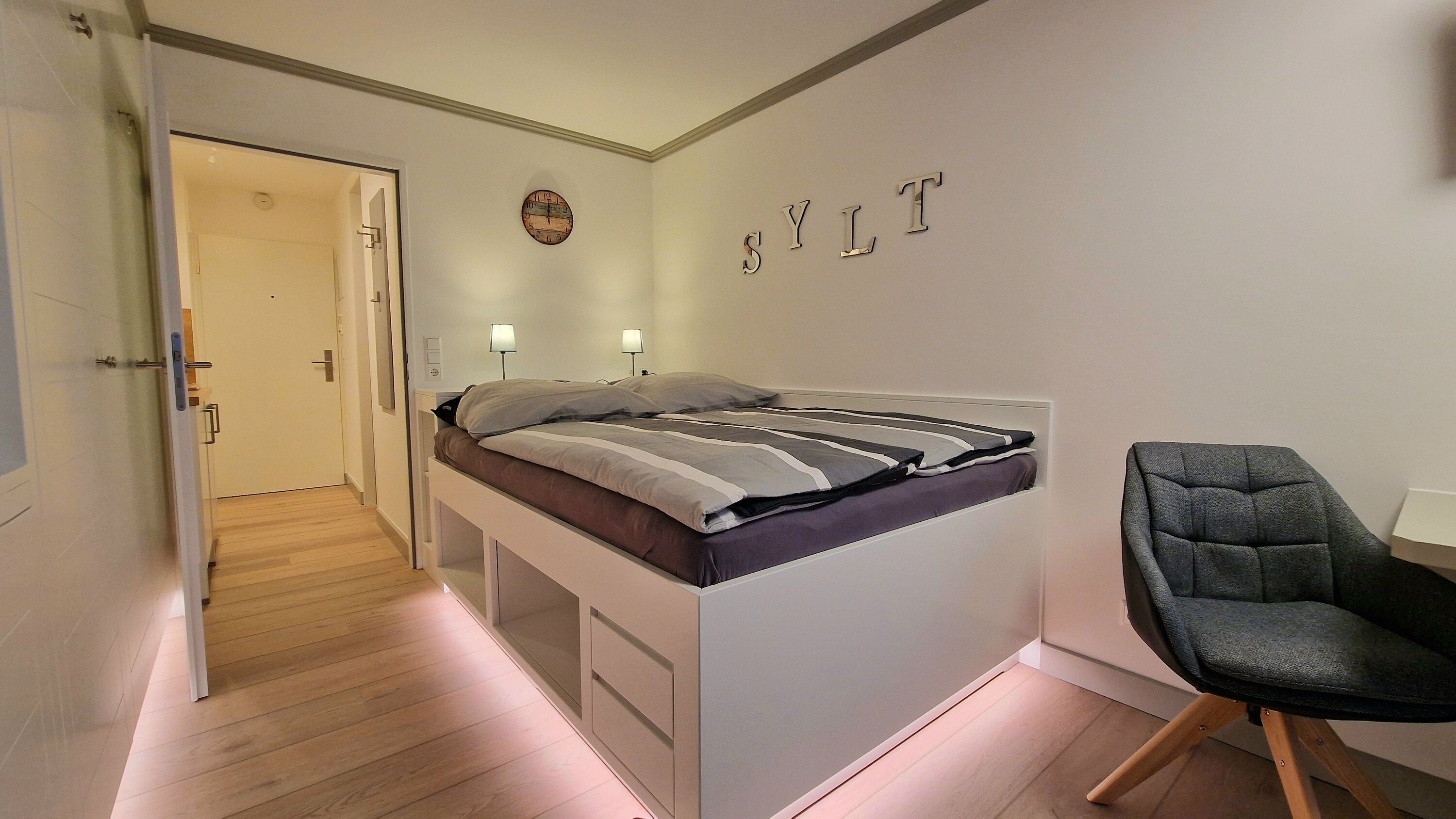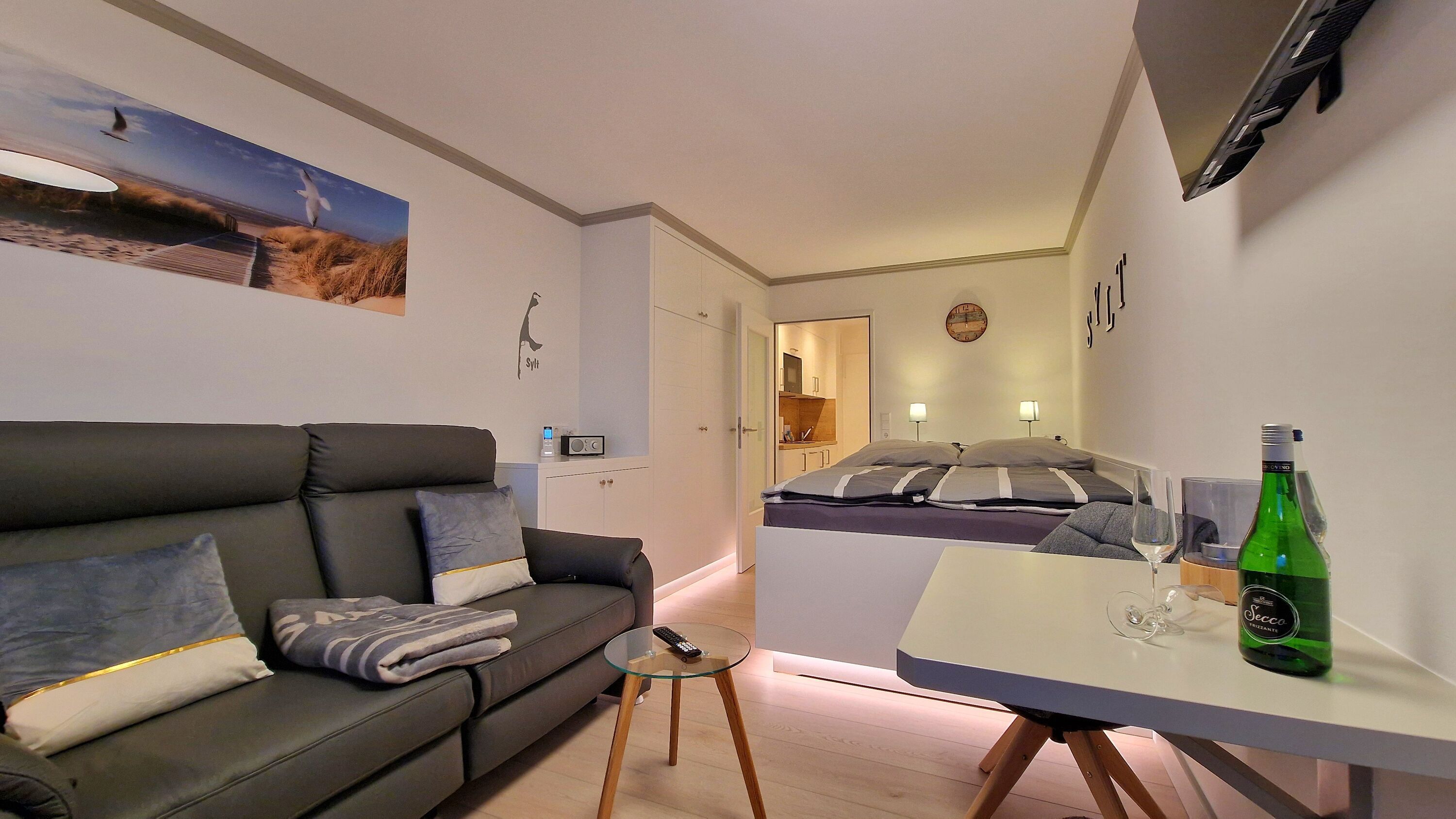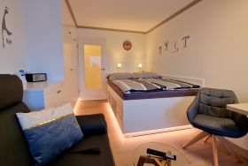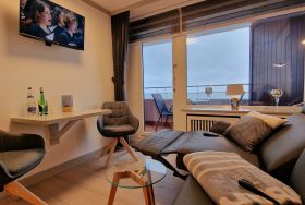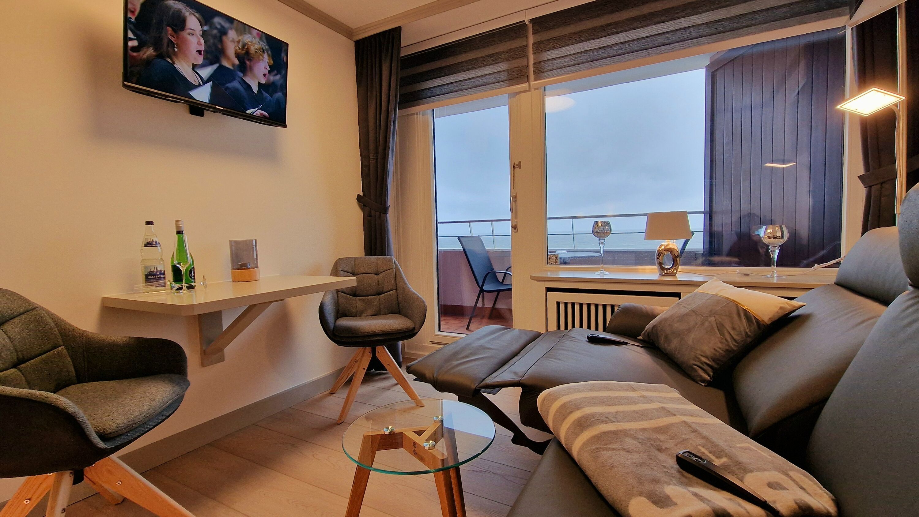 1-Zimmer-Apartment mit freiem Seeblick im 7. OG des Haus Metropol, ca. 25 m². Kombinierter Wohn- und Schlafraum mit festem Doppelbett (140x200. 75cm Höhe), 2er-Sofa mit elektronischer Liegefunktion, Esstisch mit gemütlichen Stühlen, Smart-TV, Festnetzanschluss, seperatem WLAN und möblierten Westbalkon. Hübsche Küchenzeile mit Geschirrspüler, Mikrowelle, 2er-Cerankochfeld und extra Senseo Kaffeemaschine . Schickes Duschbad mit WC. Tierhaltung und Rauchen ist in der Wohnung ist nicht gestattet. Bettwäsche und Handtücher sind zur Anreise aufgezogen. Ein PKW-Stellplatz kann kostenpflichtig zugebucht werden.