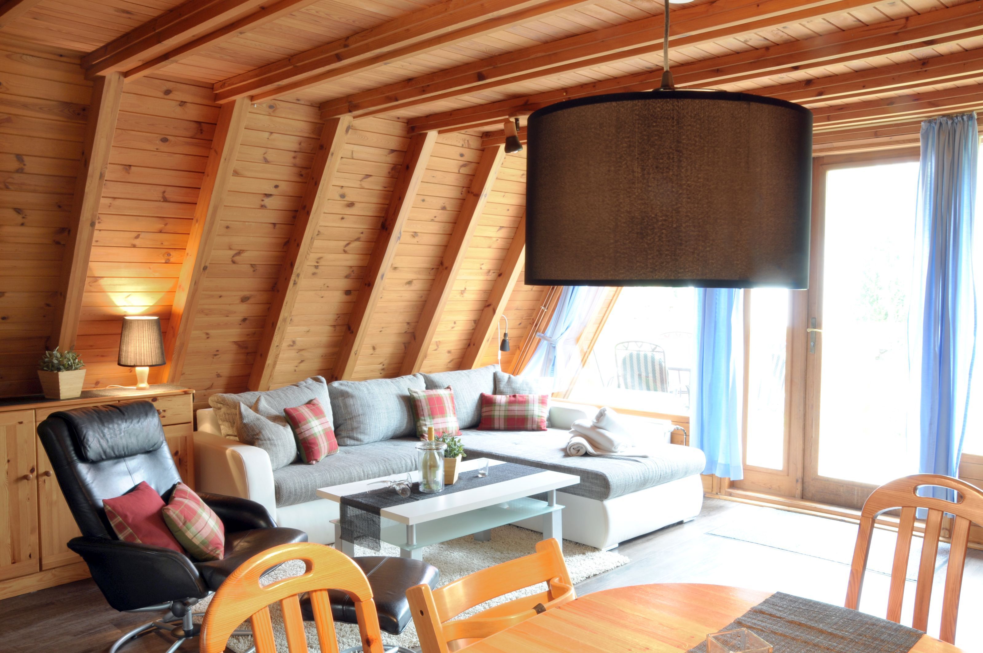 Rustikale Finnhütte mit großzügigem Wohn-/Esszimmer mit offener Küche und Terrassenzugang.
