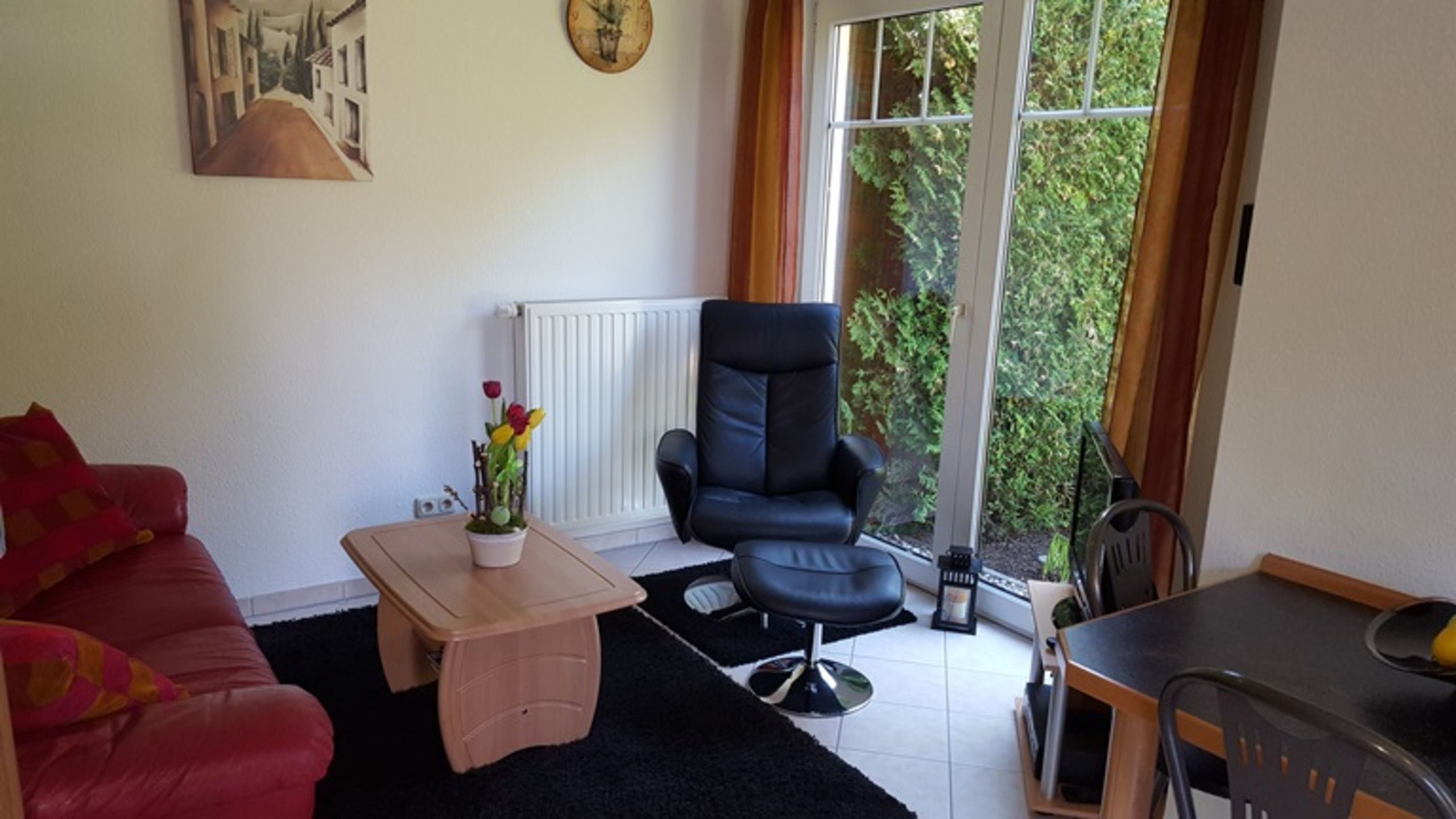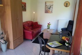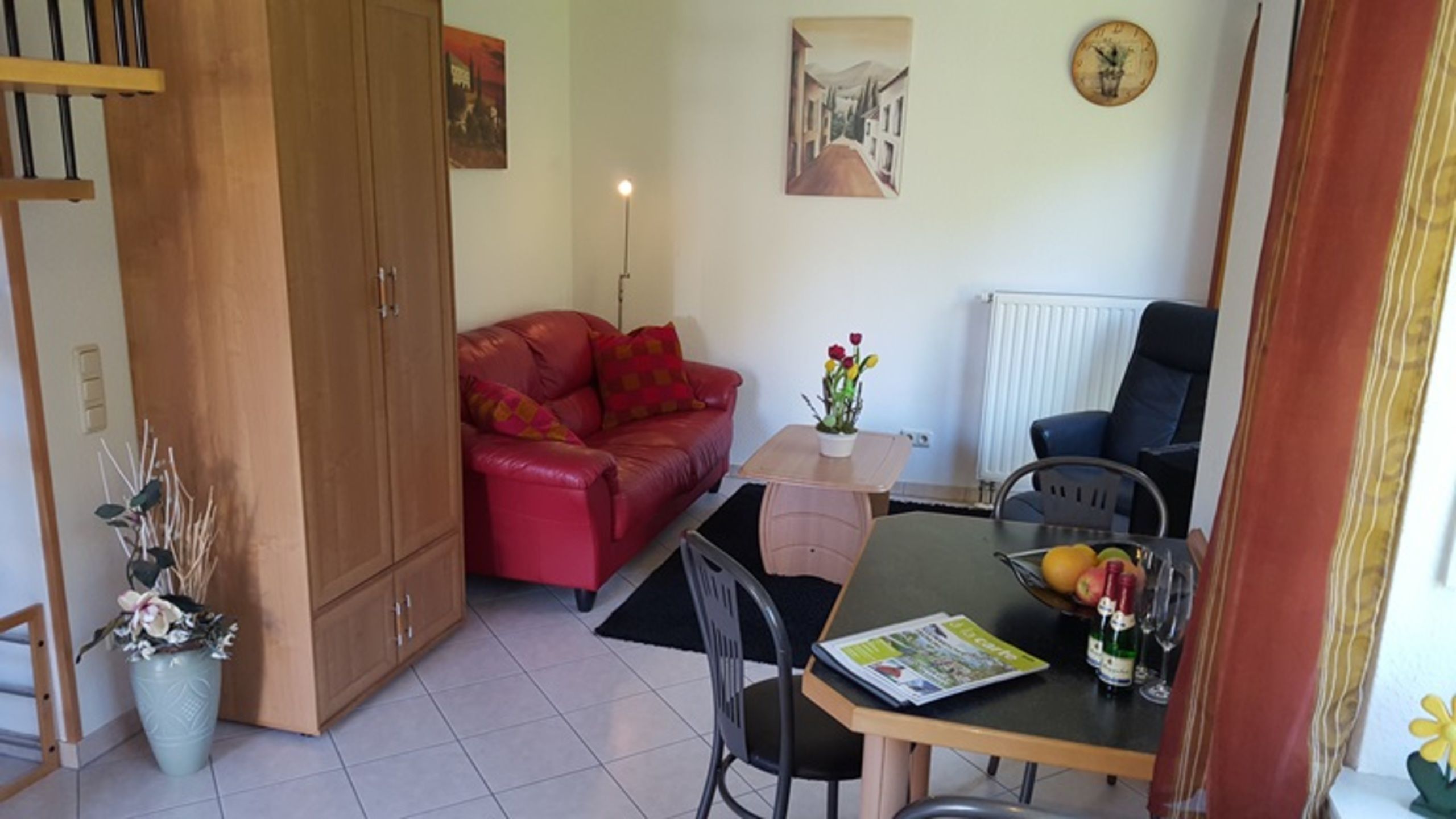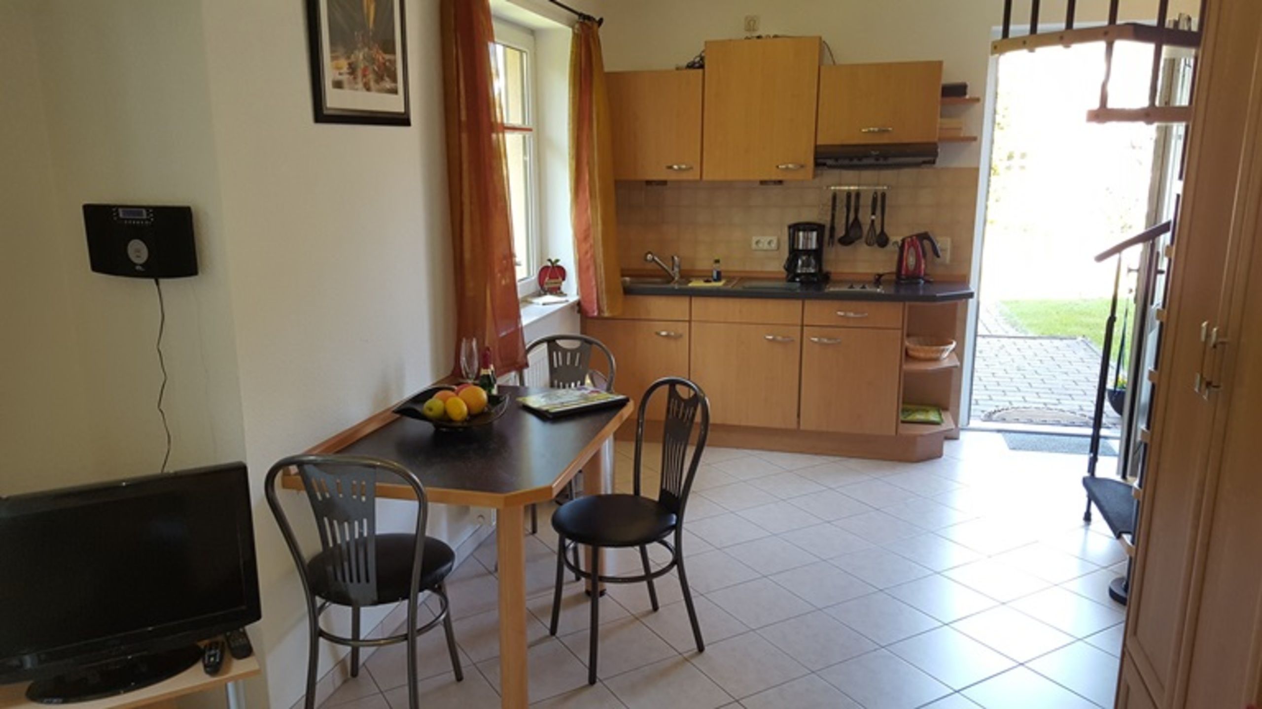 Die komfortable eingerichtete 38 qm großeMaisonetten- Ferienwohnung hat einen separaten Eingang und befindet sich im Parterre eines Einfamilienhauses. Die Wohnung verfügt über einen lichtdurchfluteten kombinierten Wohn und Eßbereich mit Einbauküche welche mit einem Zweiplattenherd, Wasserkocher, Mixer, Toaster und Kaffeemaschine ausgestattet ist. Ein Fernseher und DVD-Player stehen zur Nutzung bereit. Neben dem Wohnraum befindet sich die Dusche/WC. Über eine gespindelte Treppe gelangen Sie vom Wohnraum in den Schlafbereich mit einem Doppelbett Bei schönem Wetter lädt eine Sitzecke am Haus mit Grillmöglichkeit zum Verweilen ein. Ein PKW-Stellplatz ist am Haus. Die Erstausstattung der Bettwäsche und Handtücher stellt Ihnen der Vermieter kostenlos zur Verfügung
