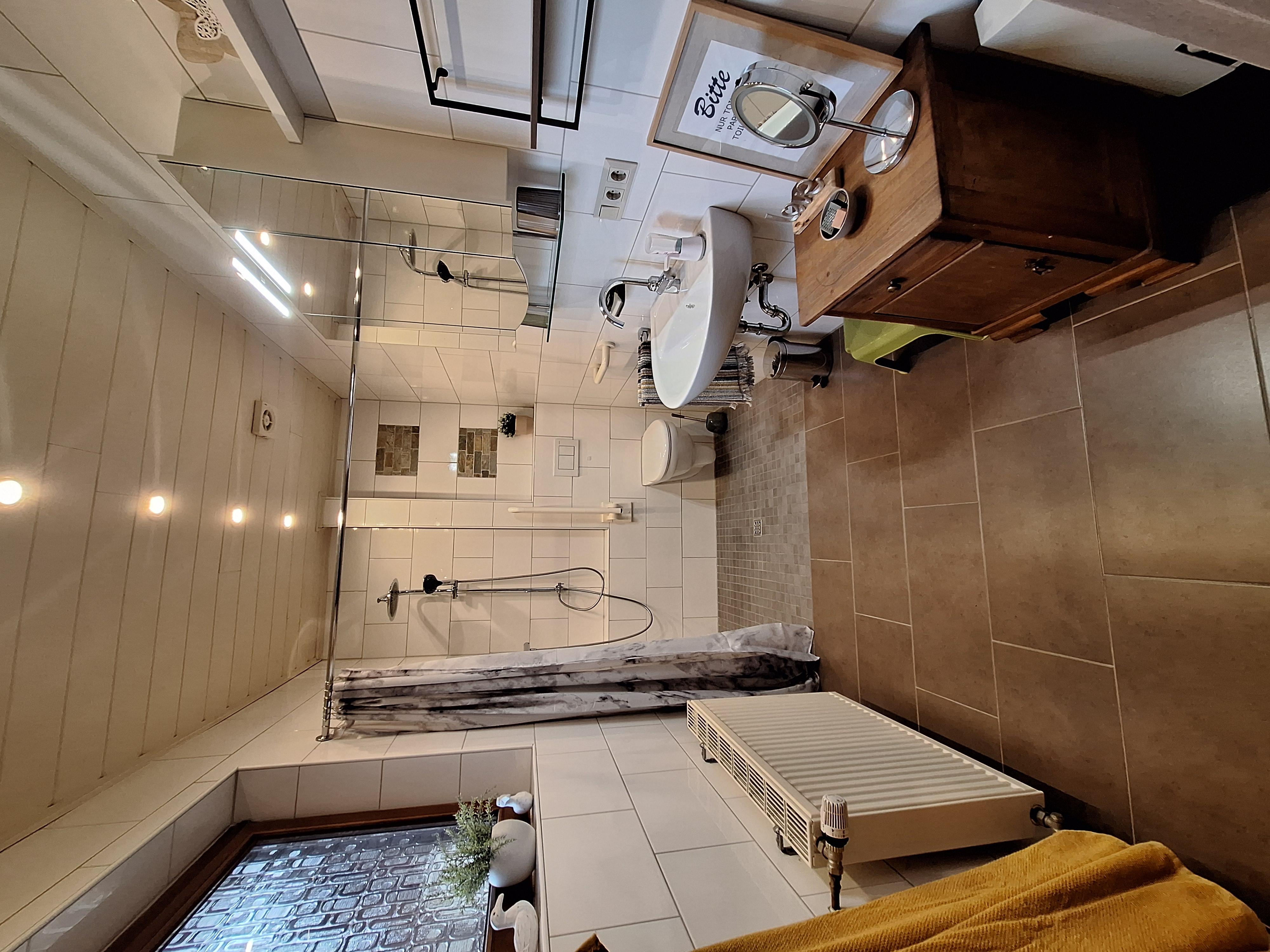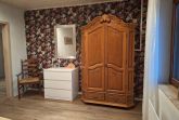 Das Wohnzimmer ist ca. 30m² groß und verfügt über ein XXL- Smart-TV. Von hieraus können Sie durch eine Tür zur Terrasse und in den Garten gelangen. In diesem Raum befindet sich auch ein Kaminofen. Im Wohnzimmer finden Sie eine Couch mit elektr. Liegefunktion, 2 Sessel und ein Massagesessel mit Aufstehhilfe. Die Wohnküche hat folgende Ausstattung: Induktionskochfeld mit 4-Kochplatten, hoch eingebauter Backofen, Dunstabzugshaube, Kühlschrank, Geschirrspüler, Kaffeemaschine mit Filter, Wasserkocher, Toaster und Mikrowelle. Am Esstisch finden 8 Personen Platz und ein Elektrokamin. Im großen Schlafzimmer ist Doppelbett (180 x 200 cm Liegefläche), 1 Stuhl, 1 Schrank sowie eine Kommode. Im kleinen Schlafzimmer sind zwei Einzelbetten (jeweils 100 x 200 cm Liegefläche) die man auch zu einem Doppelbett zusammenschieben kann und ein Schrank. Das Bad hat eine großzügige, barrierefreie Dusche mit Duschhocker, WC und Waschbecken. Zusätzlich ist ein Gäste-WC mit kleinem Handwaschbecken vorhanden.