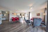 Im kombinierten Wohn- und Essbereich steht euch ein schwenkbarer SMART-TV (43 Zoll) zur Verfügung. Sowohl der Esstisch, als auch der behagliche Wohnbereich mit einer zusätzlichen Doppelschlafcouch (1,40 x 1,90 m) bieten euch Platz, um gesellige Stunden beim Frühstück oder nach einem schönen Tag am Strand zu verbringen. Beim Frühstück könnt ihr auf dem nach Süden gelegenen Balkon den Tag begrüßen. Der Balkon ist überdacht und bietet euch Gartenmöbel, Auflagen, Sonnenschirm und einen Relax-Hängesessel.