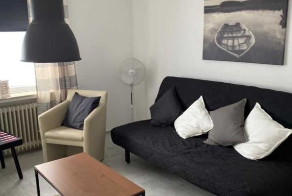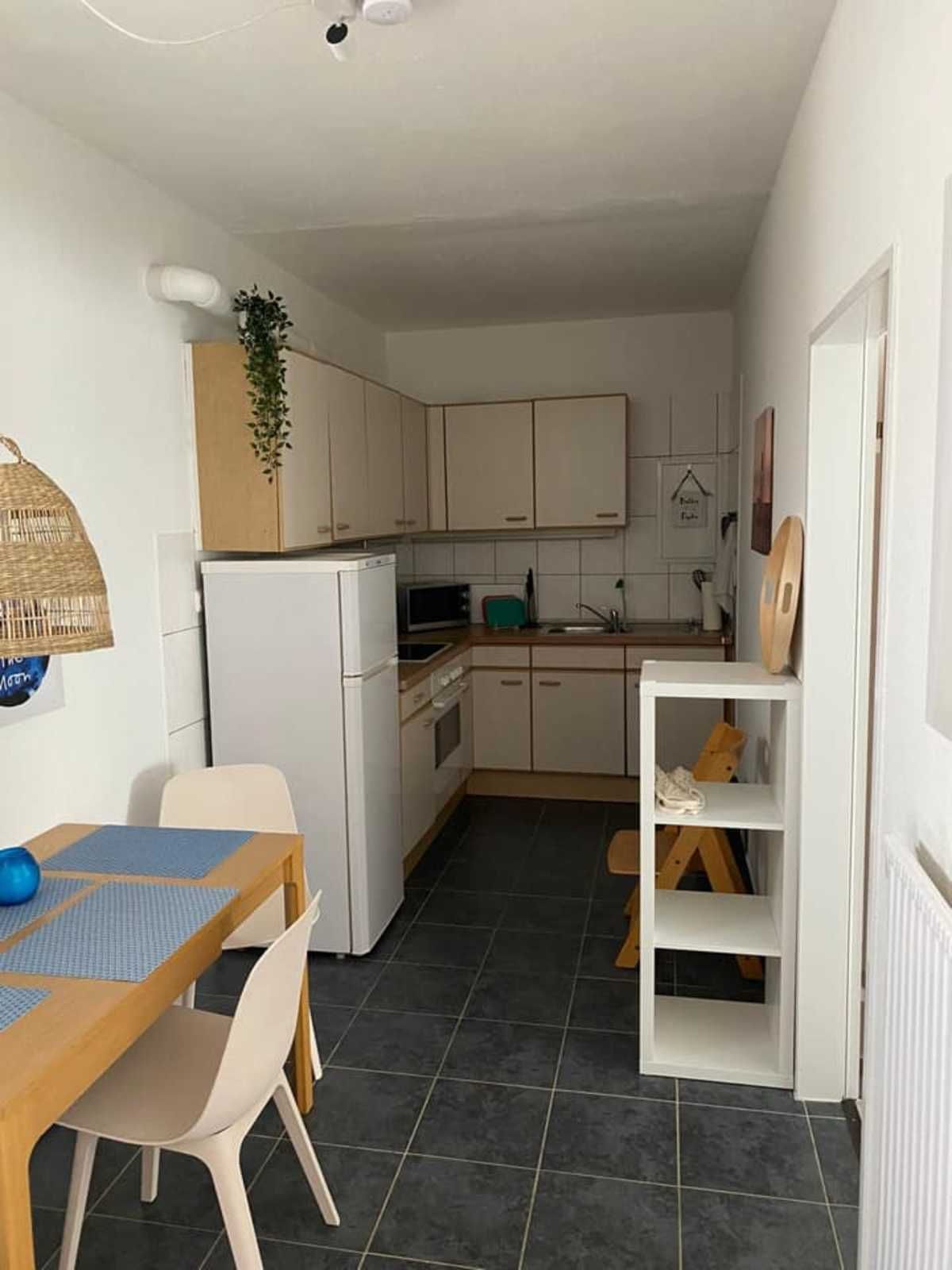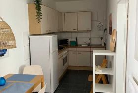 Die Nichtraucher-Ferienwohnung ist modern eingerichtet. Sie verfügt über ein Schlafzimmer mit einen 1,60 m großem Doppelbett und im Wohnzimmer mit einem Schlafsofa, 1,60 m. Die Küche ist mit einem Geschirrspüler ausgestattet. Bis zur Eingangstür der Ferienwohnung sind es 5 Stufen.