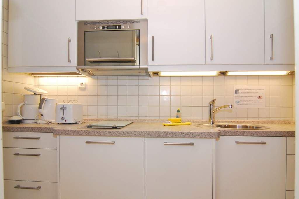 1-Zimmer-Ferienwohnung, ca. 25 m², 4.OG im Haus Sylter Welle zur Seeseite. Nichtraucher-Whg.! Wohn-/Schlafraum mit Westbalkon und Blick auf das Meer, Doppelschrankbett mit 2 Matratzen, 2-Sitzer-Couch mit Couchtisch (verstellbar), Einbauschränke, Radio, Telefon W-Lan (ohne Gewähr) und TV, neue Küchenzeile im Flurbereich mit Mikrowelle und Geschirrspüler, Duschbad/WC. Tierhaltung ist nicht gestattet. Bettwäsche und Handtücher sind zur Anreise aufgezogen. Ein PKW-Stellplatz kann kostenpflichtig zugebucht werden.