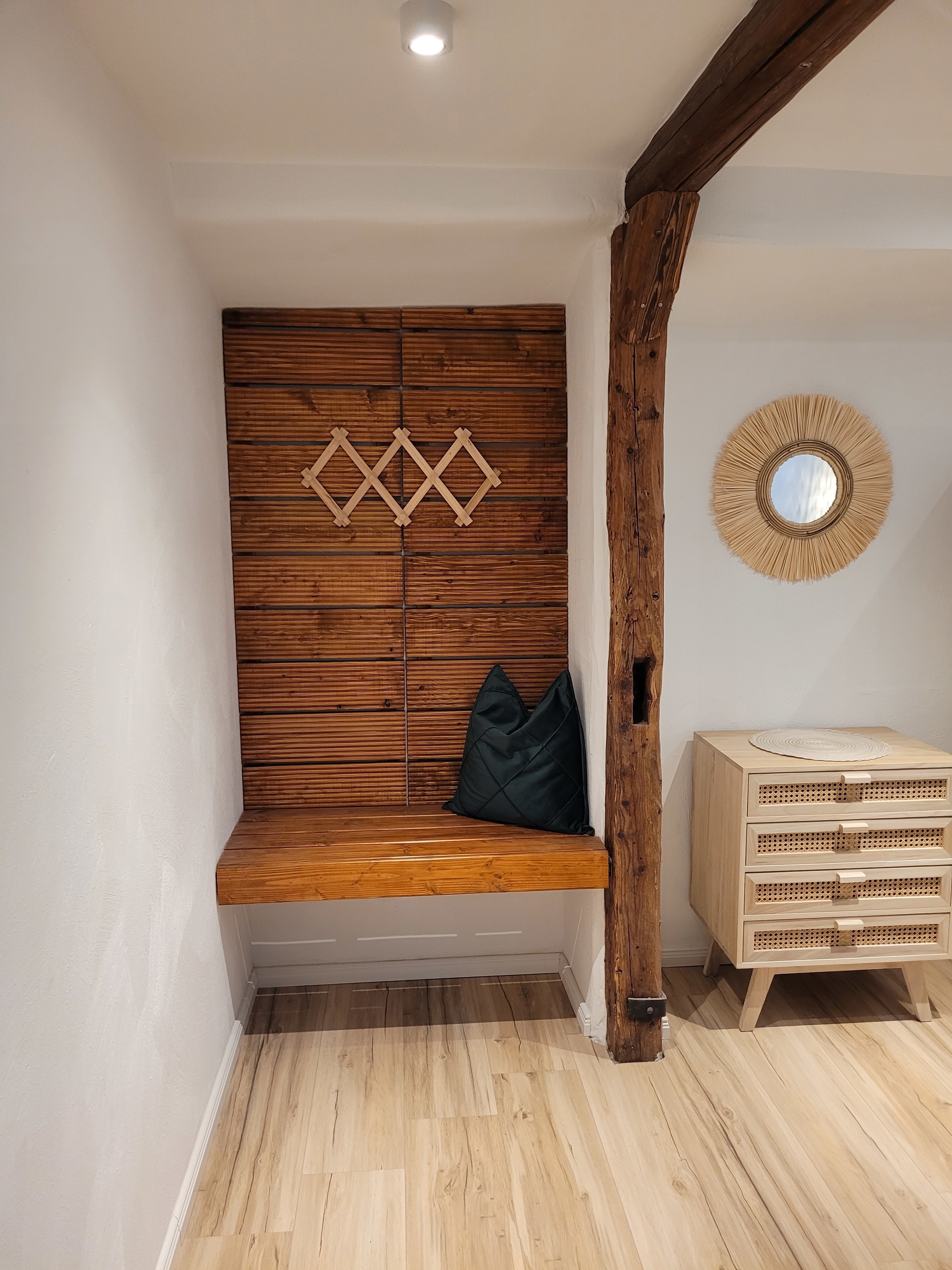 Die Sanierung der FeWo „Strandgut “ wurde im Juli 2023 abgeschlossen, also „brandneu“. In der Wohnung trifft der exklusive Skandi-Stil auf den gemütliche Boho-Stil, dabei verfügt die Wohnung über eine hochwertige Ausstattung. Die FeWo „Strangut“ besteht aus einem Wohnzimmer mit offener Küche, welche komplett ausgestattet ist. Diese verfügt über einen Geschirrspüler, Kühlschrank, Ceranherd, Backofen, Toaster, Kaffeemaschine und Wasserkocher. Des Weiteren befindet sich im Wohnzimmer ein qualitativ hochwertiges Sofa und der gemütliche Essbereich. Das Schlafzimmer ist mit einem komfortablen Boxspringbett in Queensize-Größe plus Topper für einen erholsamen Schlaf eingerichtet. Die FeWo Strandgut besitzt ein einzigartiges innenliegendes Duschbad mit WC und Föhn. Das absolute Highlight der FeWo Strandgut ist aber der große Balkon mit Süd-West-Ausrichtung, hier kann man schöne sonnige Tage und Abende genießen, auch der Blick in den geheimen Garten lädt zum Entspannen und Erholen ein. Zur weiteren Ausstattung gehören: Flachbild-Fernseher, Radio-anlage, Wäscheständer. Ein Waschtrockner, Bügeleisen und Bügelbrett sind auch im Hause vorhanden. PKW-Stellplätze befinden sich 200 m weiter direkt am Binnensee. Ein wunderschöner Innenhofgarten mit der alten Fasswerkstatt #LostPlace und einem Grillplatz lädt zum Verweilen und grillen ein.
