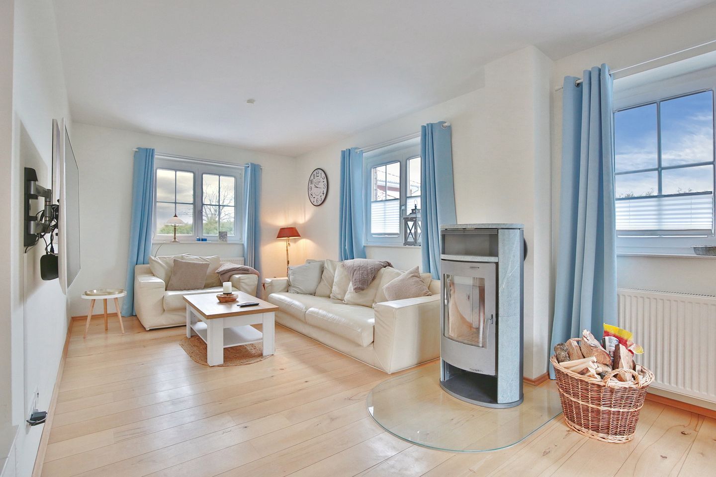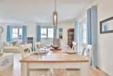 Der Wohnraum besticht mit seiner Offenheit. Zu einer Seite die offene, große Küche mit Kochinsel, mittig der schöne Esstisch mit Platz für 6 Personen und linkerhand um die Ecke der gemütliche Wohnbereich mit 2 Sofas, einem großen Fernseher und dem Kaminofen für gemütliche Abendstunden (Holz ist selbst mitzubringen). Von hier aus und auch von der Küche gelangen Sie auf die Terrasse zur Westseite, ebenfalls möbliert mit Esstisch und einem Strandkorb.