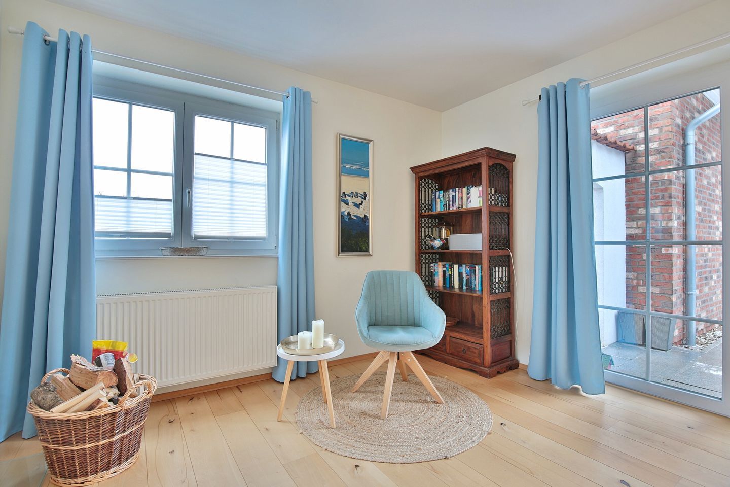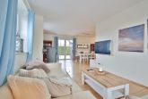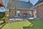 Von hier aus und auch von der Küche gelangen Sie auf die Terrasse zur Westseite, ebenfalls möbliert mit Esstisch und einem Strandkorb.