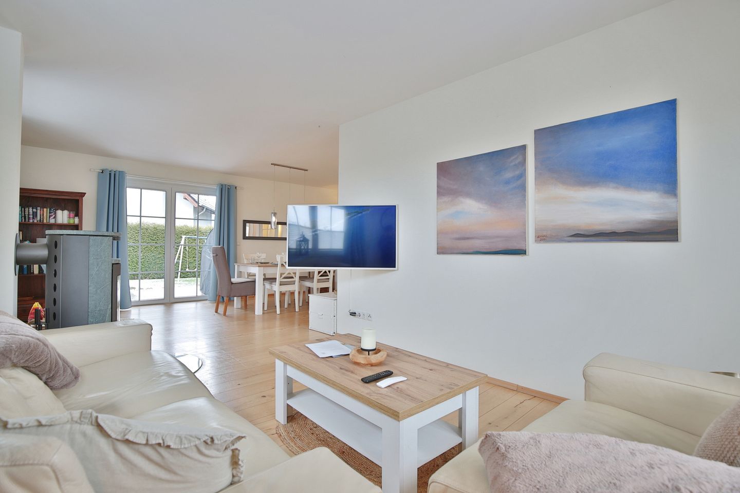 Der Wohnraum besticht mit seiner Offenheit. Zu einer Seite die offene, große Küche mit Kochinsel, mittig der schöne Esstisch mit Platz für 6 Personen und linkerhand um die Ecke der gemütliche Wohnbereich mit 2 Sofas, einem großen Fernseher und dem Kaminofen für gemütliche Abendstunden (Holz ist selbst mitzubringen). Der Kamin steht zurzeit nicht zur Verfügung und darf nicht benutzt werden.