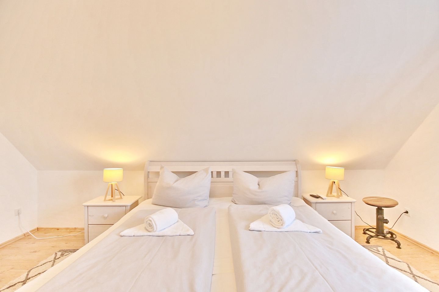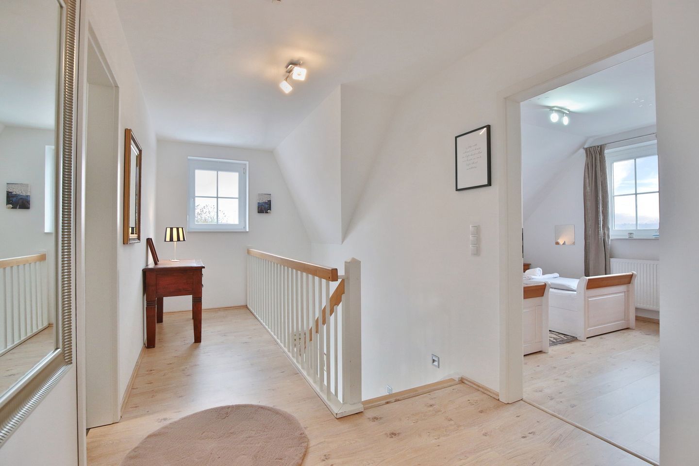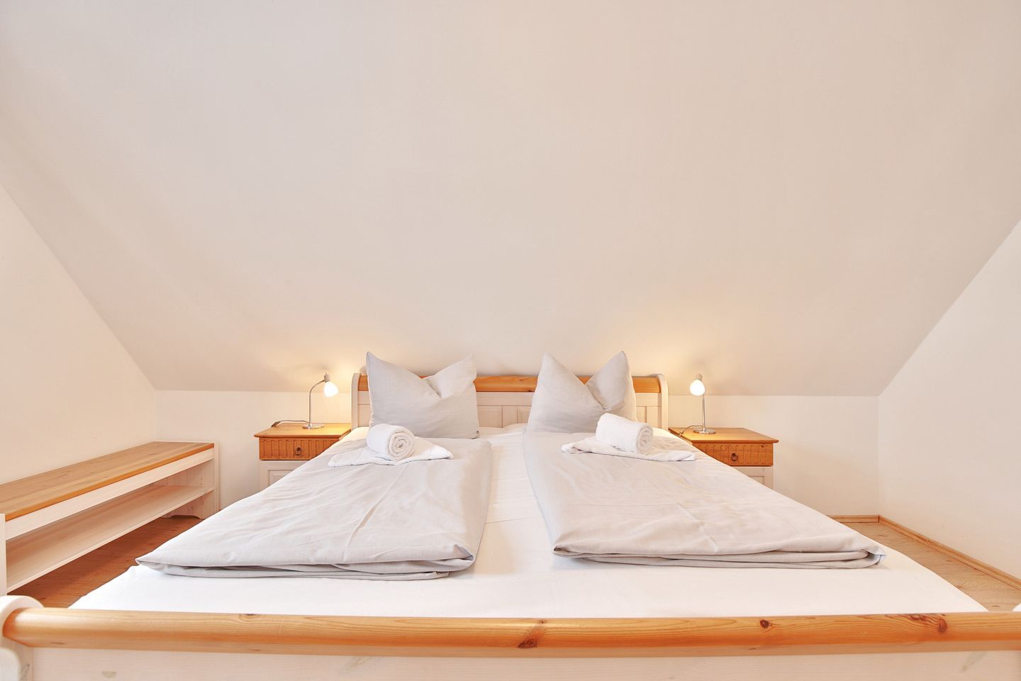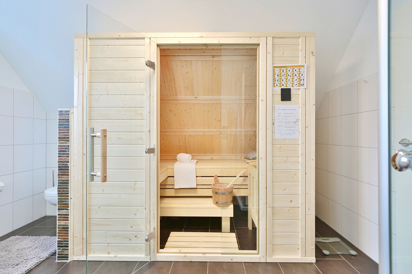 Vom Eingangsbereich gelangen Sie über eine Treppe ins Obergeschoß mit 3 großzügigen Schlafzimmern. 2 Schlafzimmer verfügen über Doppelbetten 1,80 x 2,00m und das dritte Zimmer hat 2 Einzelbetten 0,90 x 2,00 m. Alle Schlafzimmer sind mit Fernsehern und Kleiderschränken ausgestattet. Das Obergeschoß hat ebenfalls ein großes Badezimmer mit Dusche und WC. Seit Januar 2026 steht Ihnen auch eine Sauna zur Verfügung.