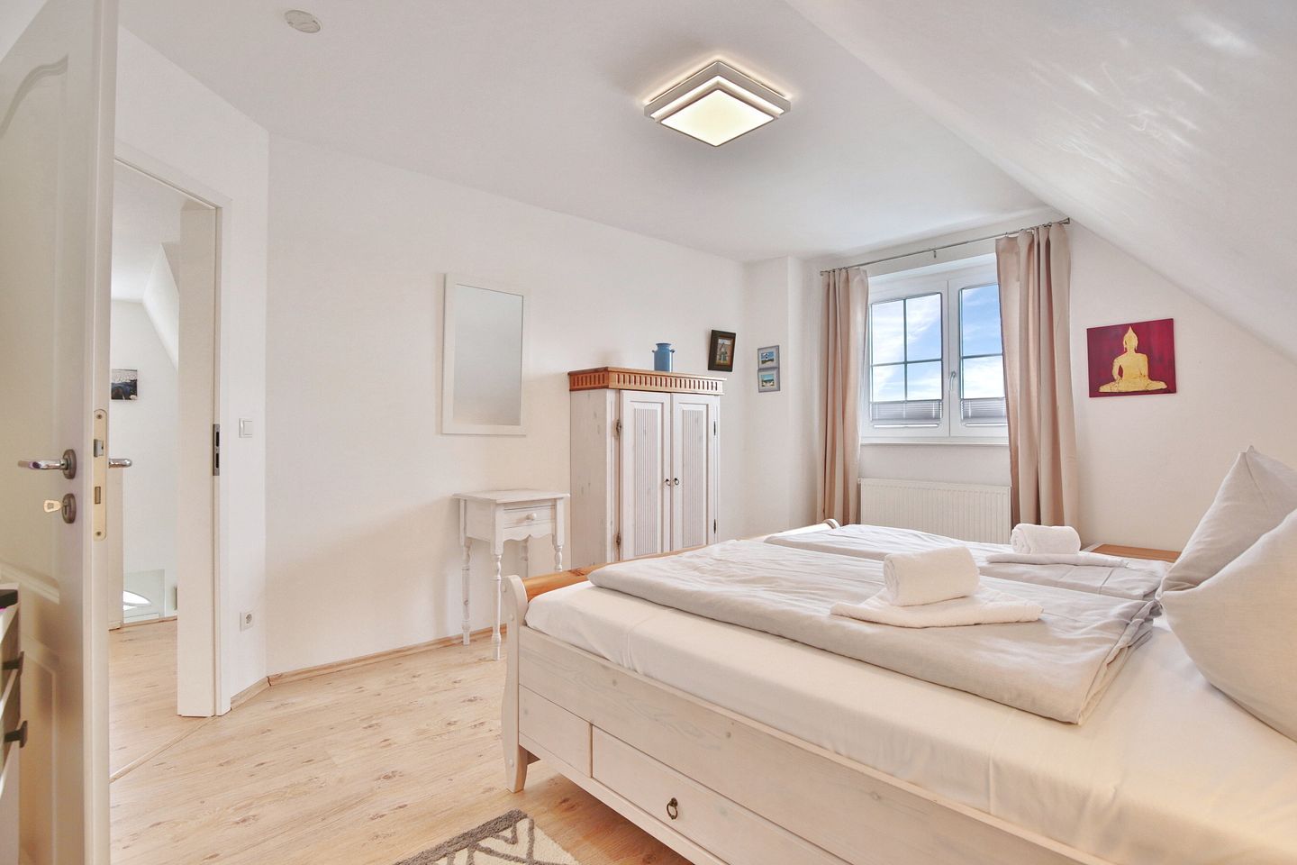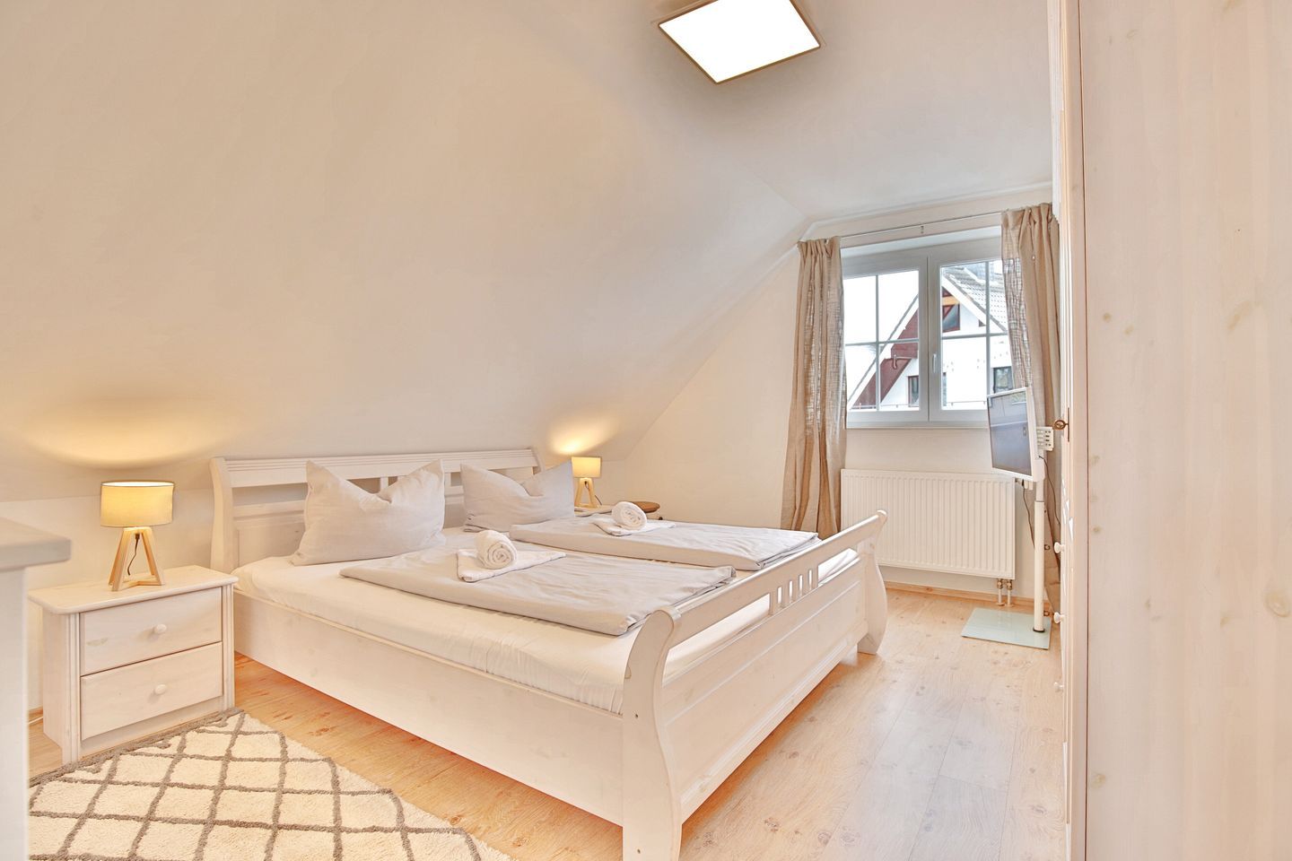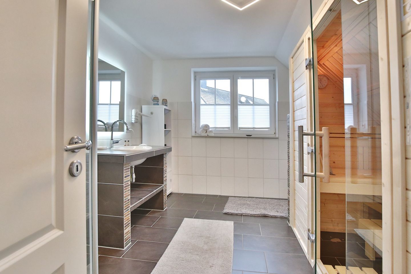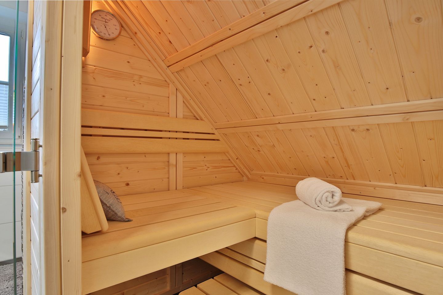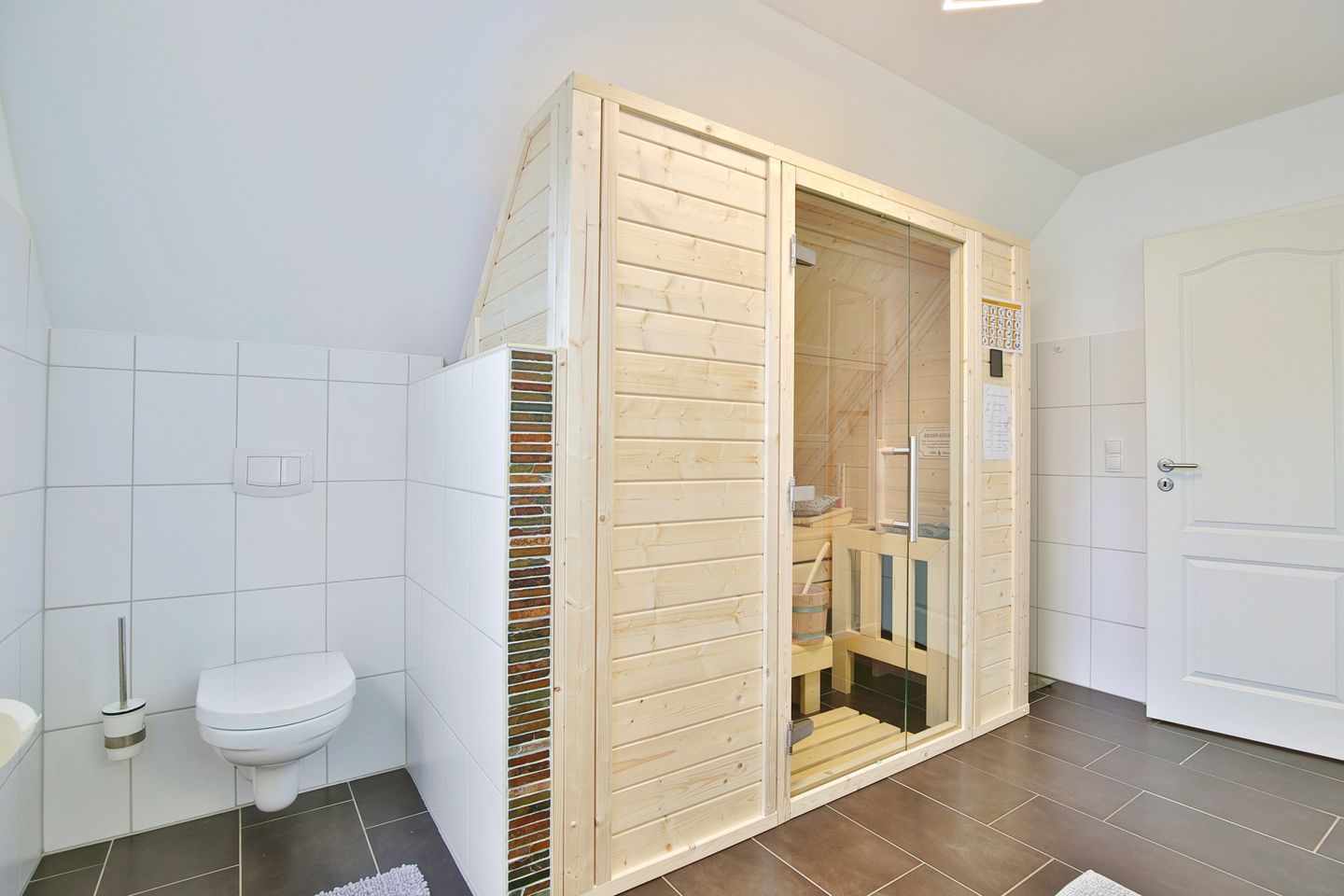 Vom Eingangsbereich gelangen Sie über eine Treppe ins Obergeschoß mit 3 großzügigen Schlafzimmern. 2 Schlafzimmer verfügen über Doppelbetten 1,80 x 2,00m und das dritte Zimmer hat 2 Einzelbetten 0,90 x 2,00 m. Alle Schlafzimmer sind mit Fernsehern und Kleiderschränken ausgestattet. Das Obergeschoß hat ebenfalls ein großes Badezimmer mit Dusche und WC. Seit Januar 2026 steht Ihnen auch eine Sauna zur Verfügung.