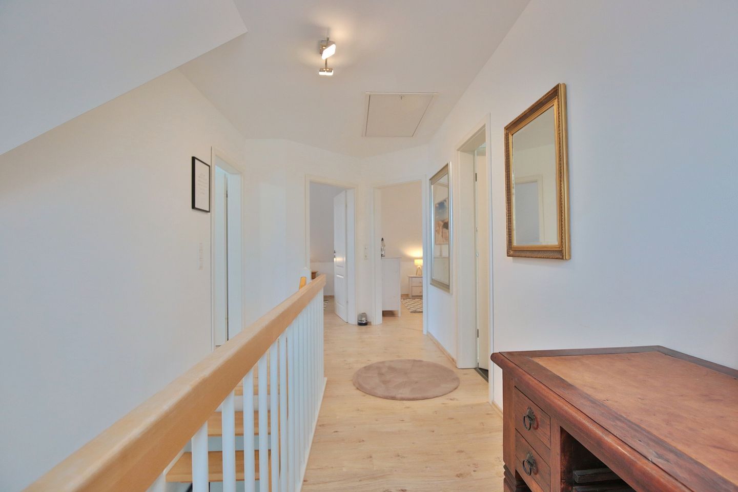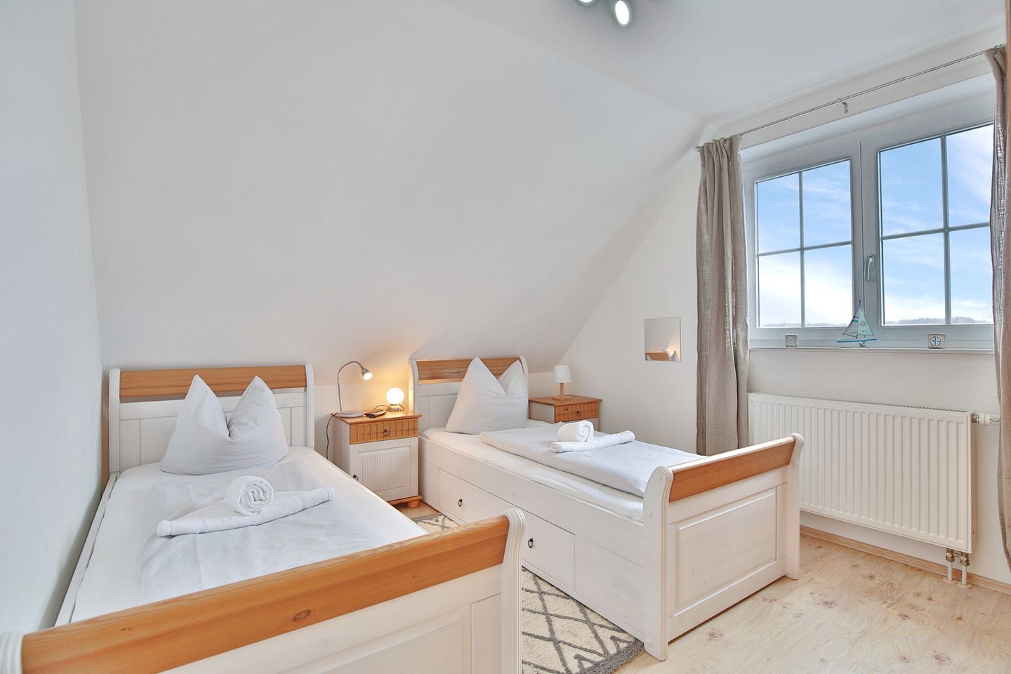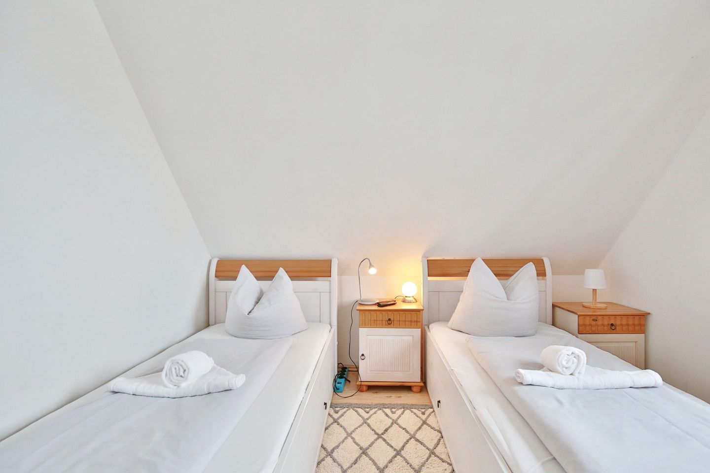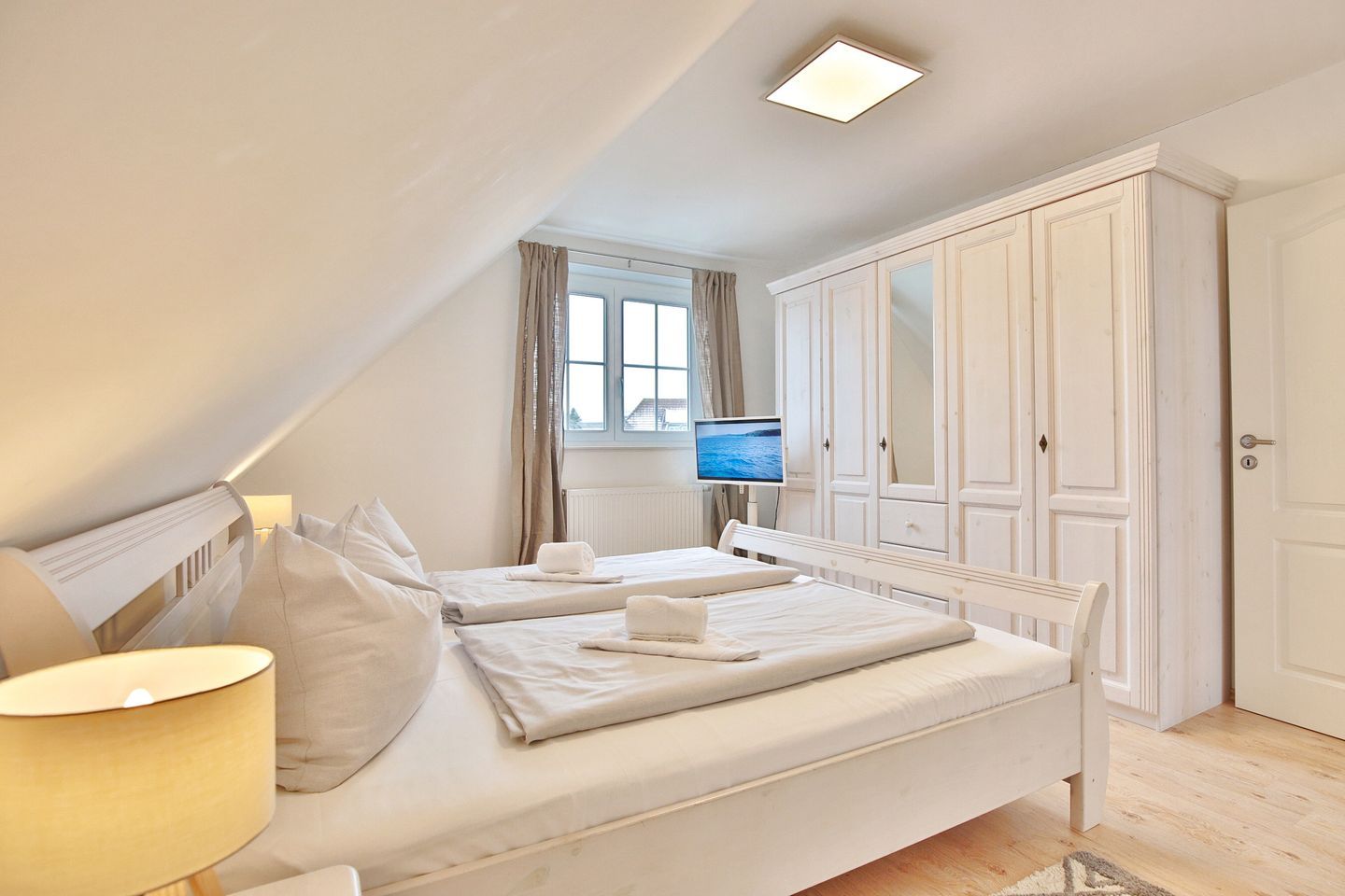Vom Eingangsbereich gelangen Sie über eine Treppe ins Obergeschoß mit 3 großzügigen Schlafzimmern. 2 Schlafzimmer verfügen über Doppelbetten 1,80 x 2,00m und das dritte Zimmer hat 2 Einzelbetten 0,90 x 2,00 m. Alle Schlafzimmer sind mit Fernsehern und Kleiderschränken ausgestattet. Das Obergeschoß hat ebenfalls ein großes Badezimmer mit Dusche und WC. Seit Januar 2026 steht Ihnen auch eine Sauna zur Verfügung.