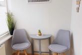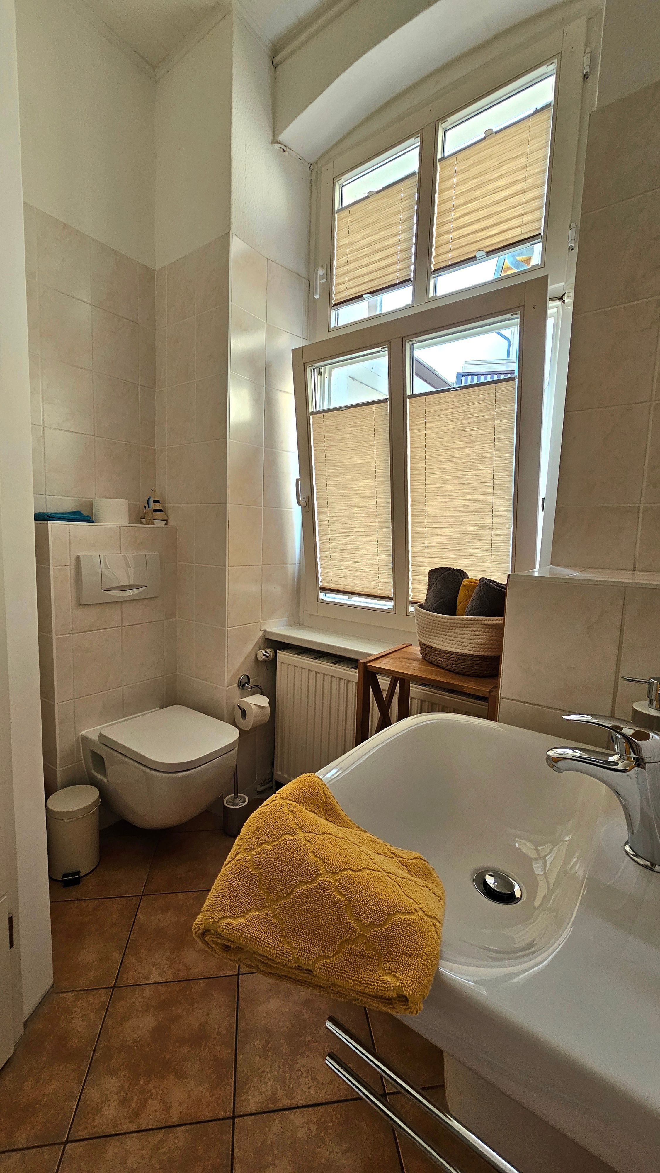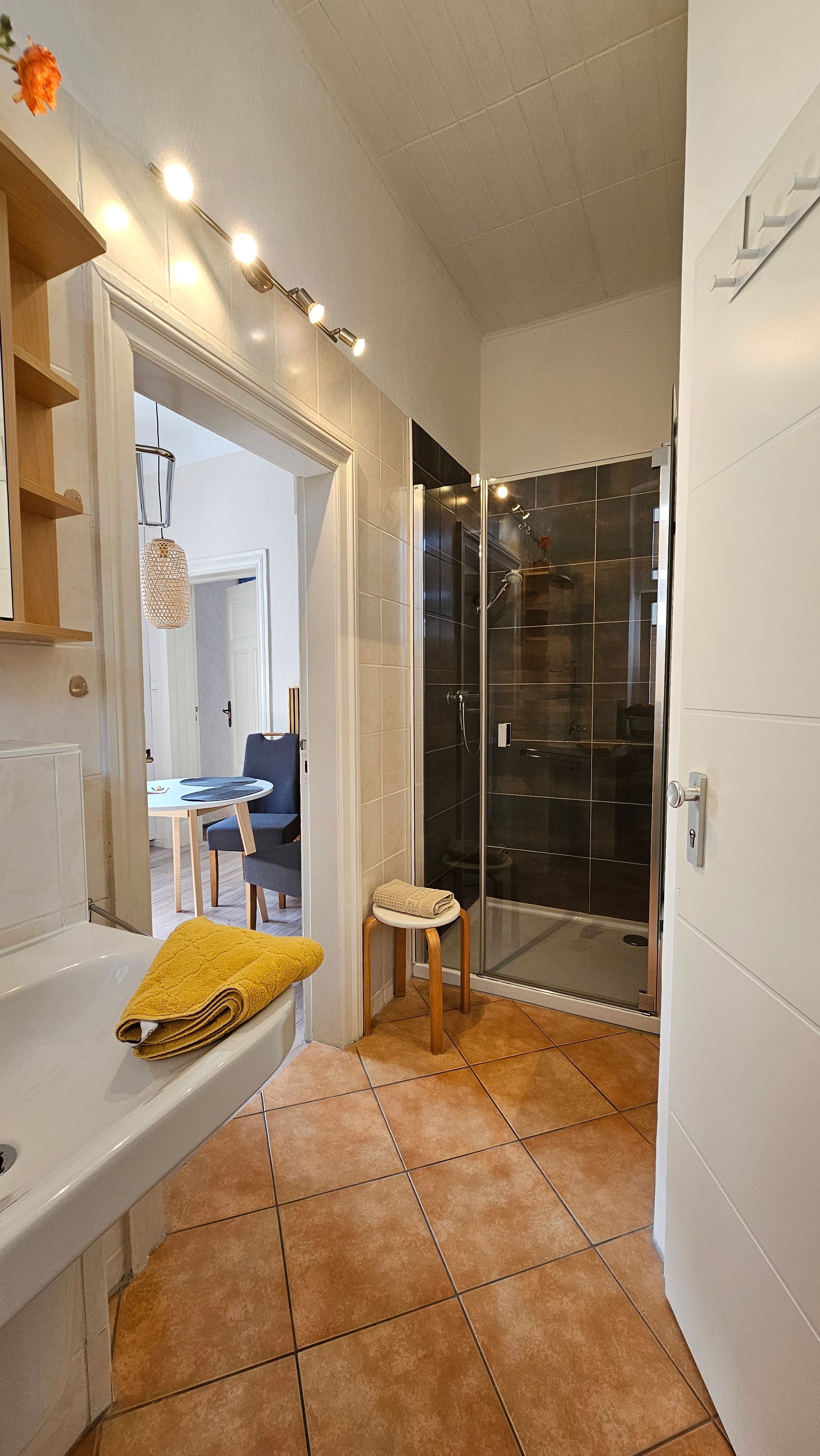 Die Erstausstattung mit Handtüchern und Bettwäsche ist inklusive. Vor der Wohnung kann die Sitzecke genutzt werden, sowie die Wäschespinne im Garten.