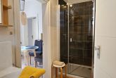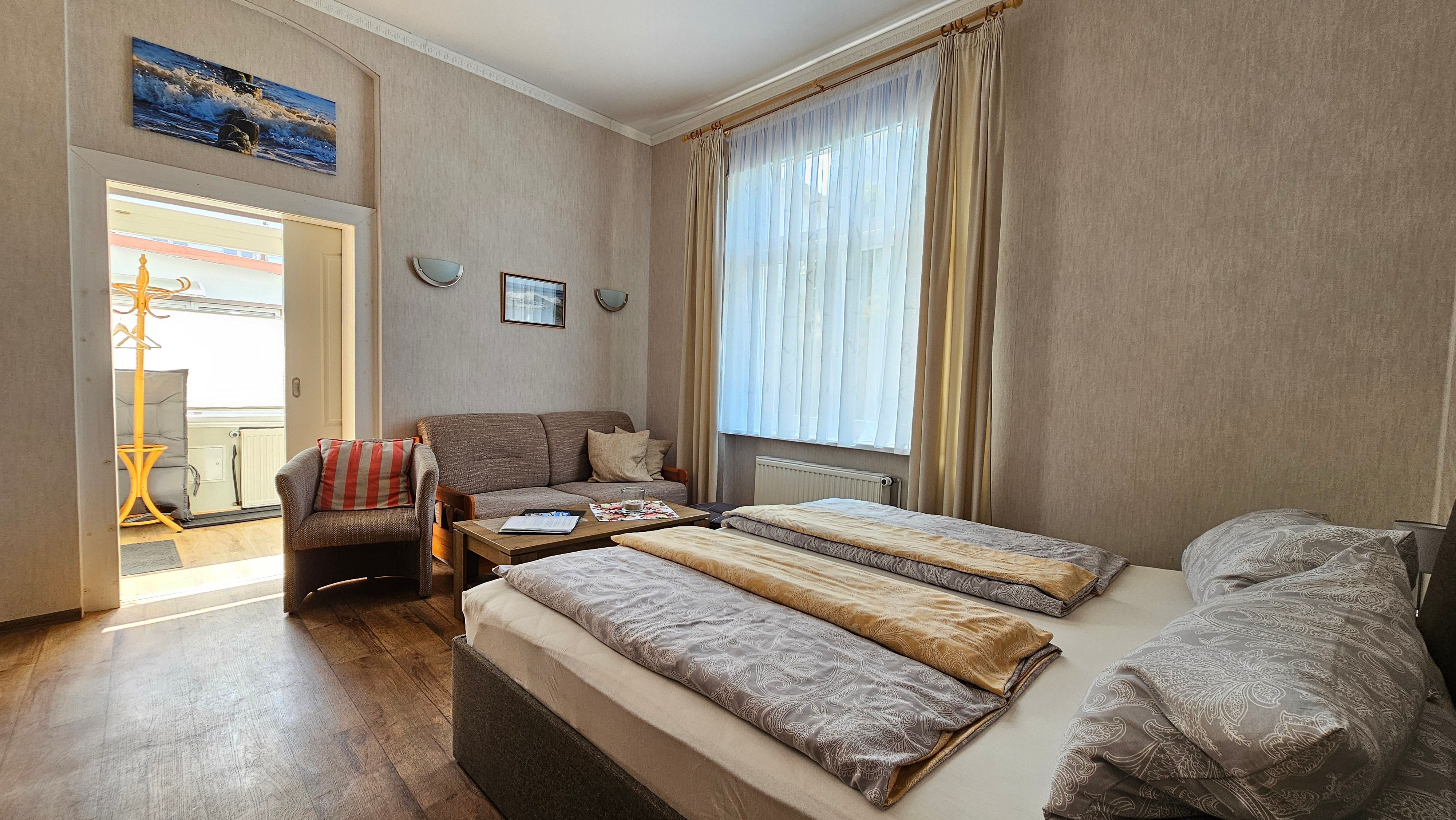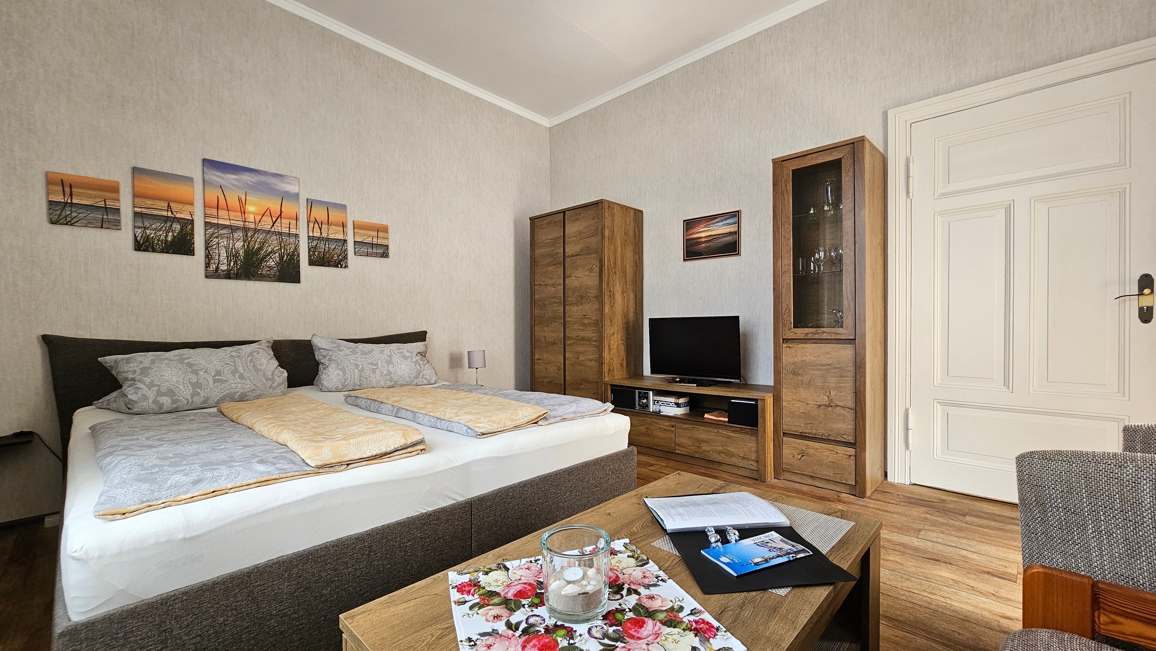 Der Fuchsbau eine Nicht-Raucherwohnung in der Parterre des Wohnhauses. Über die gemütliche Veranda mit Sitzecke gelangen Sie in den Wohn-/ Schlafbereich mit Doppelbett (180x200) und einer ausziehbaren Schlafcouch und Sessel. Dieses Zimmer verfügt über Kabel-TV und Radio. Die separate Küche ist voll ausgestattet mit einer Küchenzeile: Mikrowelle, Backofen mit 4er Ceranfeld-Herd, Kühlschrank mit kleinem Gefrierfach, Wasserkocher und Filter-Kaffeemachine, Toaster, ausreichend Gechirr und Besteck. Das Bad verfügt über eine ebenerdig, große Dusche und WC.