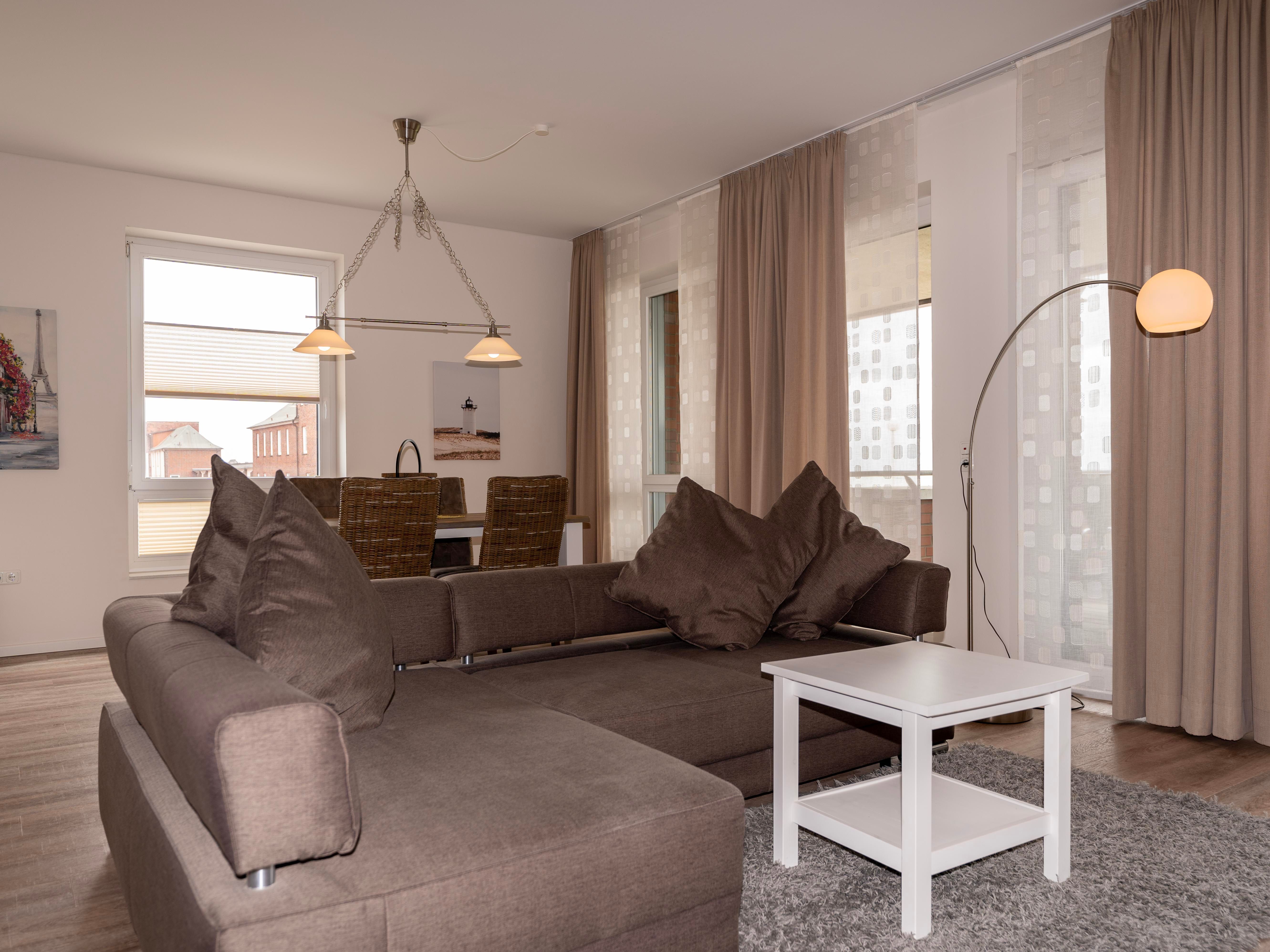 Modern ausgestattete Ferienwohnung auf einer Ebene, barrierefrei, ohne Treppen mit einem Schlafzimmer, offener Wohn-Essbereich inkl. Pkw-Stellplatz in der Tiefgarage, WLAN und Handtüchern und Bettwäsche.