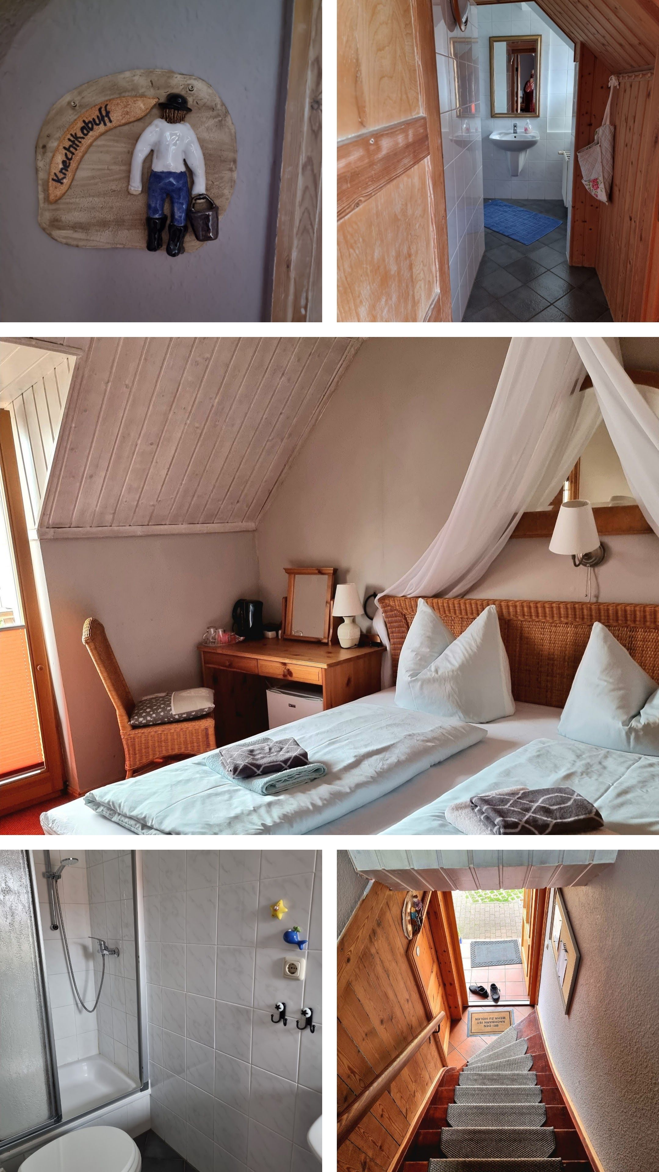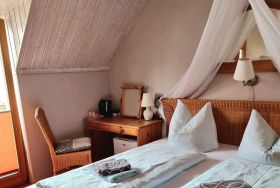 Unsere liebevoll und gemütlich eingerichtete Ferienwohnung befindet sich auf dem Grundstück des Dorfgasthofes Deutsches Haus in einem Nebengebäude im Erdgeschoss. Der Wohnbereich verfügt über eine kleine Sitzecke, Schlafcouch und eine Pantryküche (2-Platten-Kochfeld, Kühlschrank, Waschbecken). Im angrenzenden Schlafzimmer mit Zugang zum Bad befindet sich ein Doppelbett sowie ein Kleiderschrank. Zu der Wohnung gehört ebenso eine Terrasse mit Grillmöglichkeit und einer schattenspendenden Markise. Im Zimmerpreis enthalten sind bereits der Parkplatz sowie die Erstausstattung mit Bettwäsche und Handtüchern.