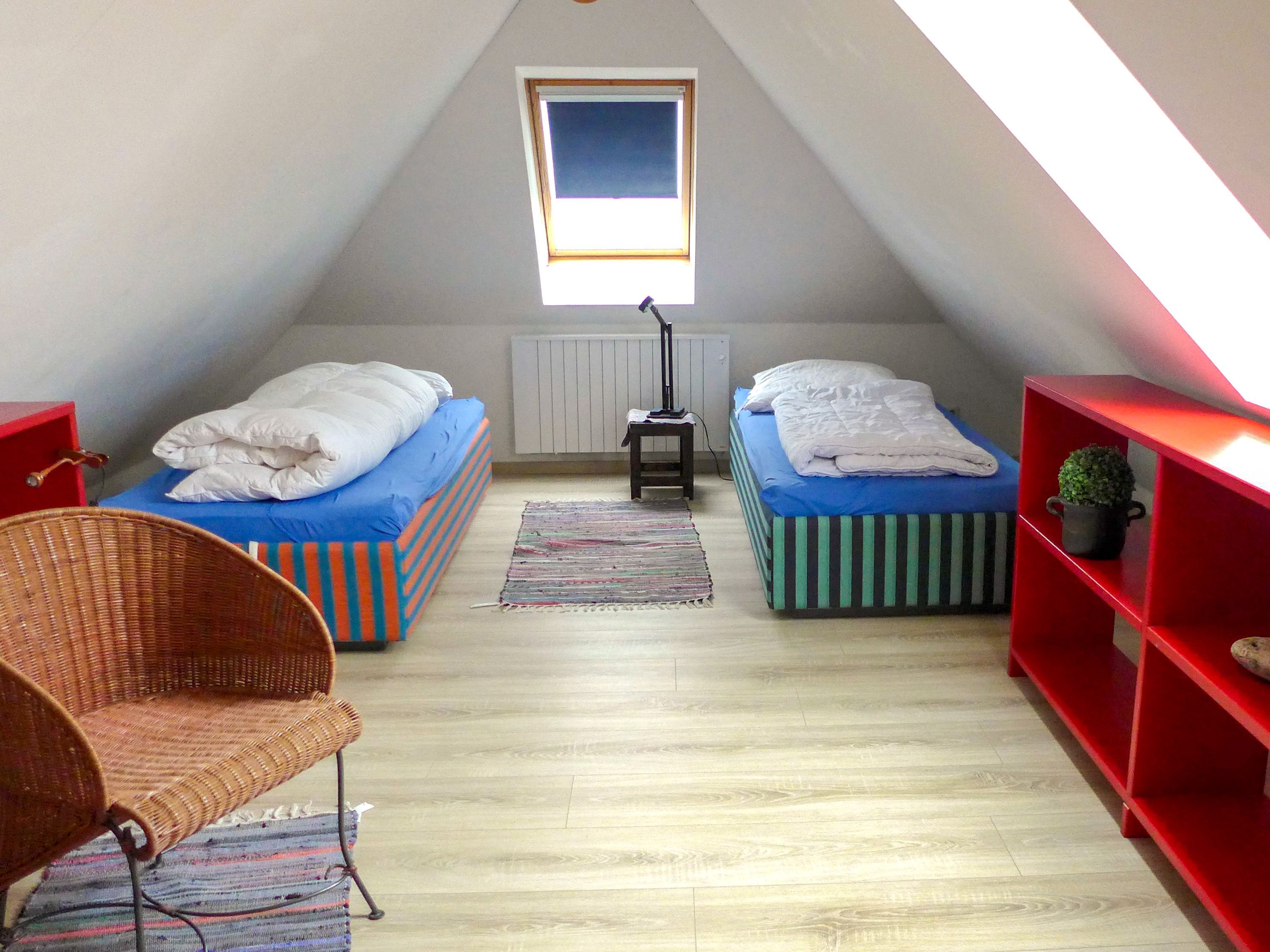 Über eine Raumspartreppe gelangst du in das Dachgeschoss, wo zwei weitere Schlafzimmer mit jeweils zwei Einzelbetten (80x200) auf dich warten. Diese Räume bieten viel Gemütlichkeit und sind ideal für Kinder oder Freunde, die einen eigenen Rückzugsort genießen möchten.
