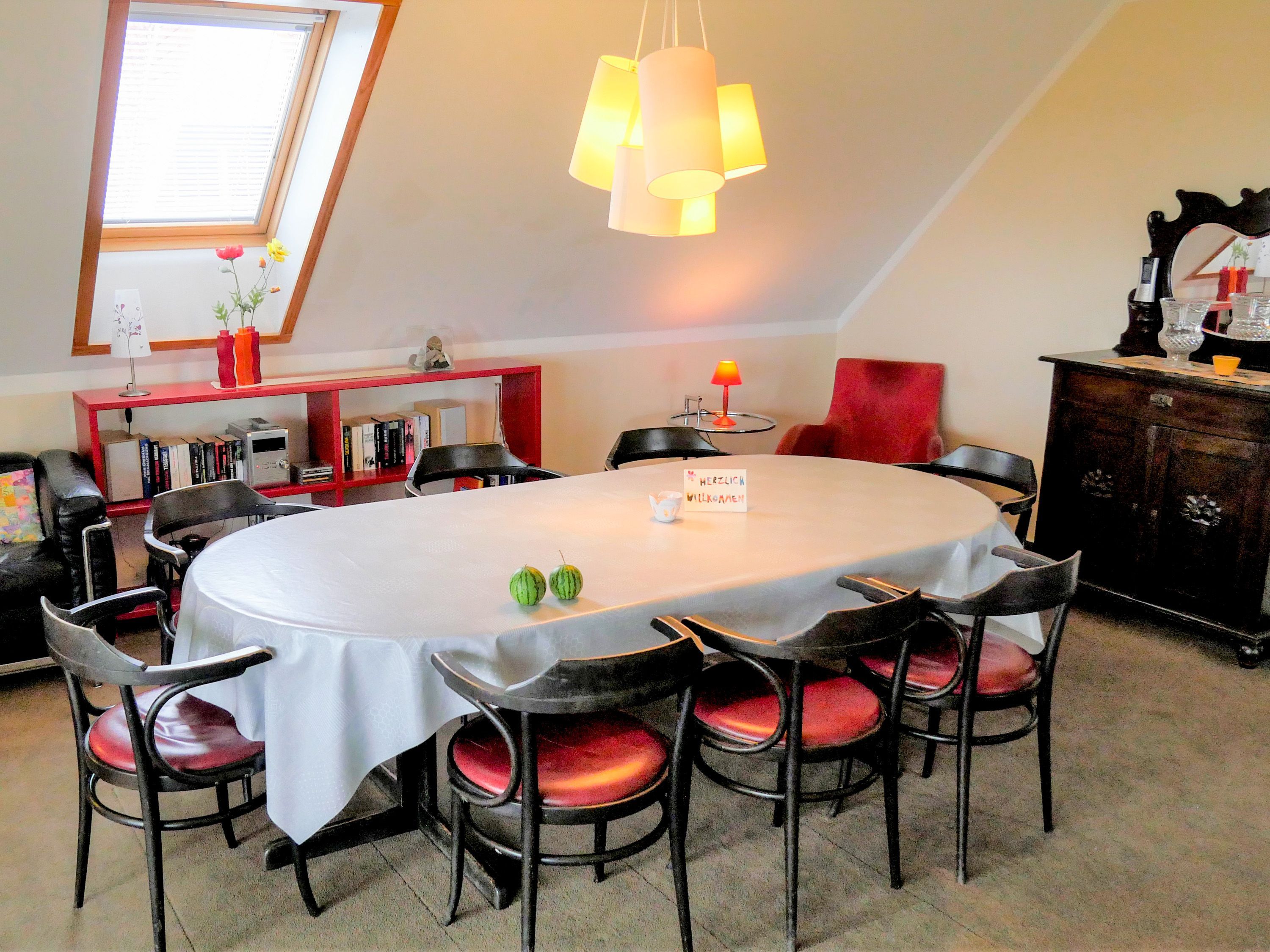 Im Obergeschoss erwartet dich ein heller und geräumiger Wohnbereich mit offener Küche und einem großen Essplatz, der zum gemeinsamen Kochen, Essen und Beisammensein einlädt. Die Küche ist vollständig ausgestattet und macht das Zubereiten deiner Lieblingsgerichte zu einem Vergnügen. Sie verfügt über einen Kühlschrank, eine Mikrowelle, einen Backofen, einen Herd, eine Spülmaschine sowie eine Kaffeemaschine, einen Toaster und einen Wasserkocher hier fehlt es an nichts.