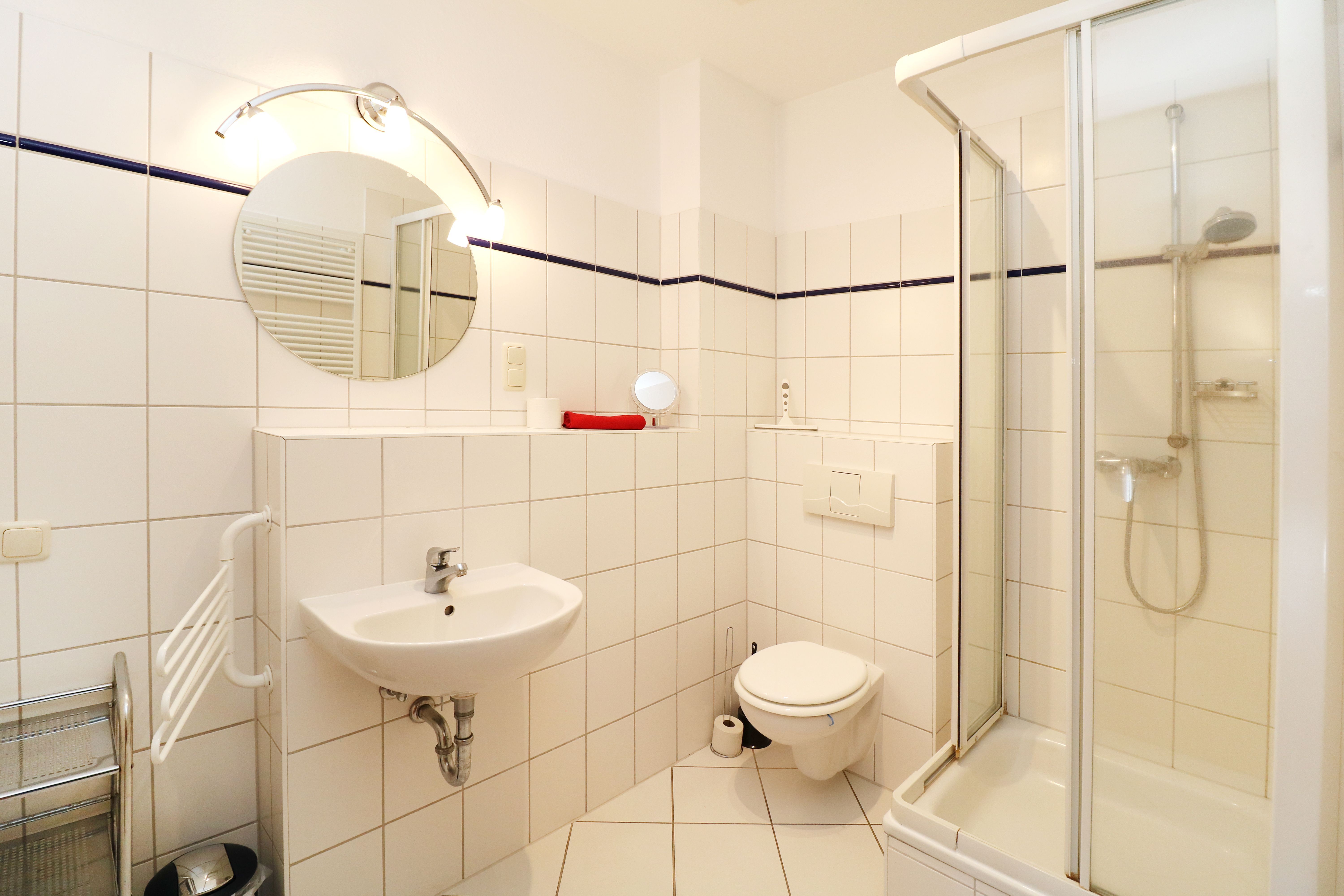 - 1 helles Badezimmer mit Dusche, WC, Waschbecken
