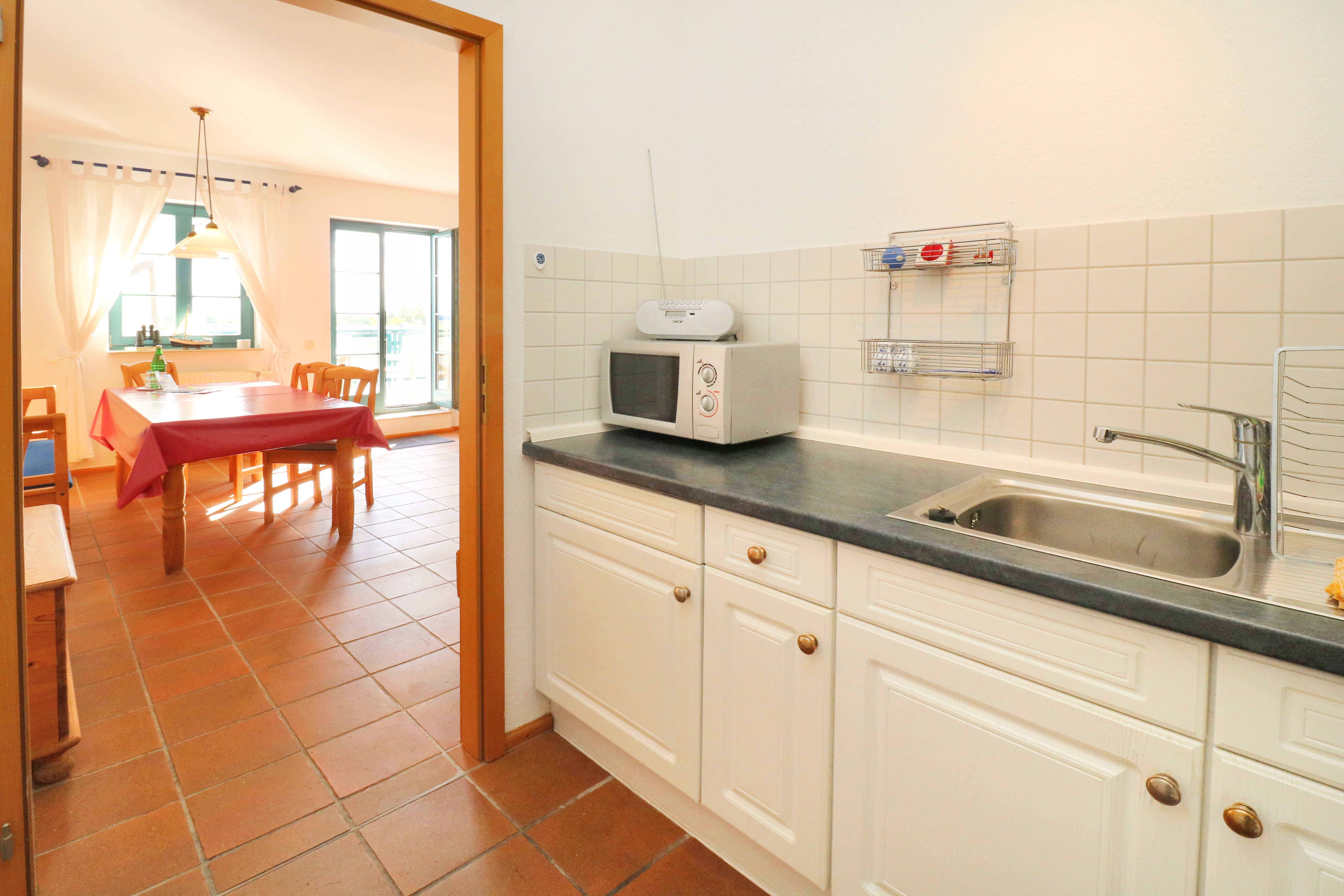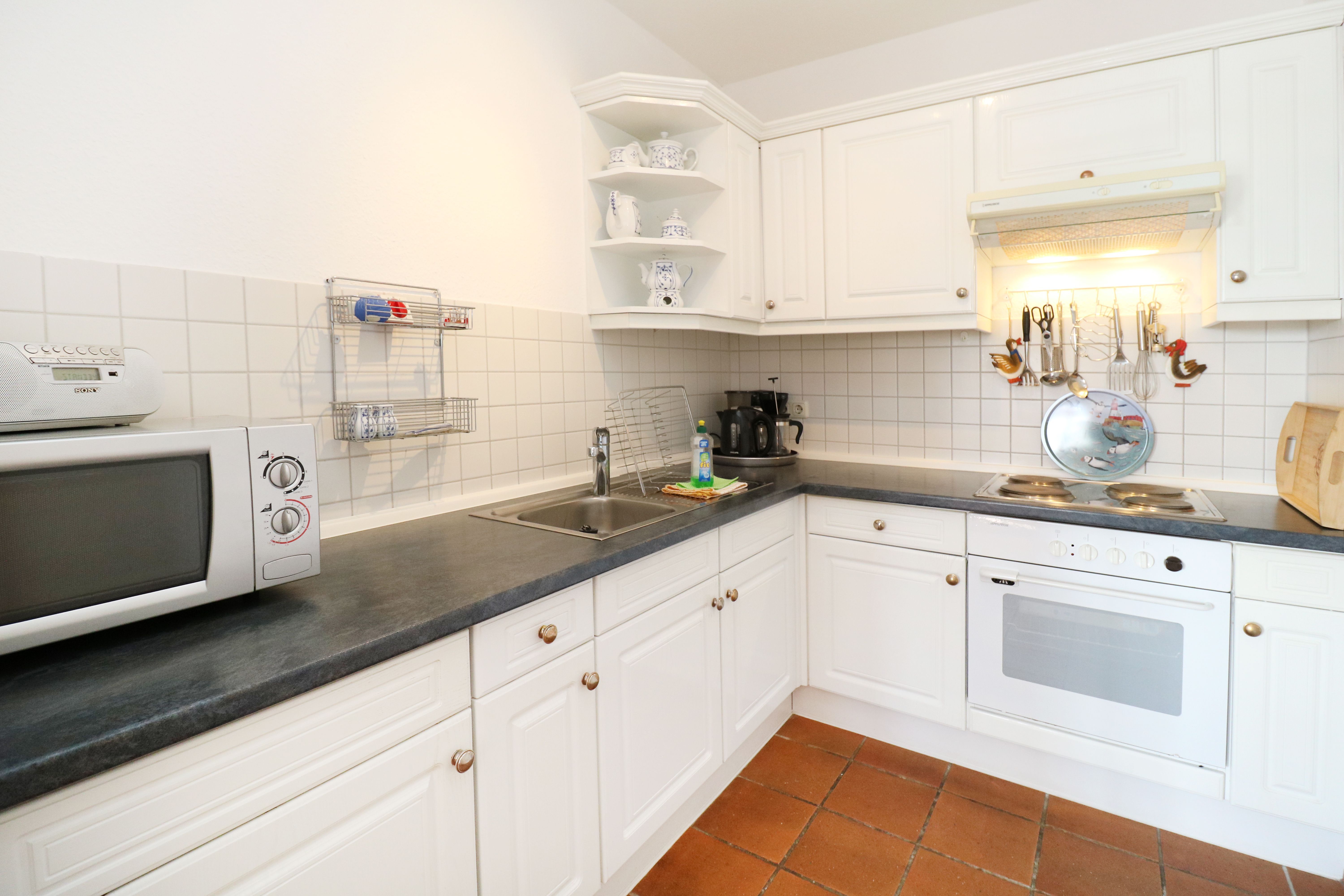 - 1 offene Küche mit Kühlschrank (inkl. Gefrierfach), Elektroherd mit Backofen, Mikrowelle und kompletter Ausstattung