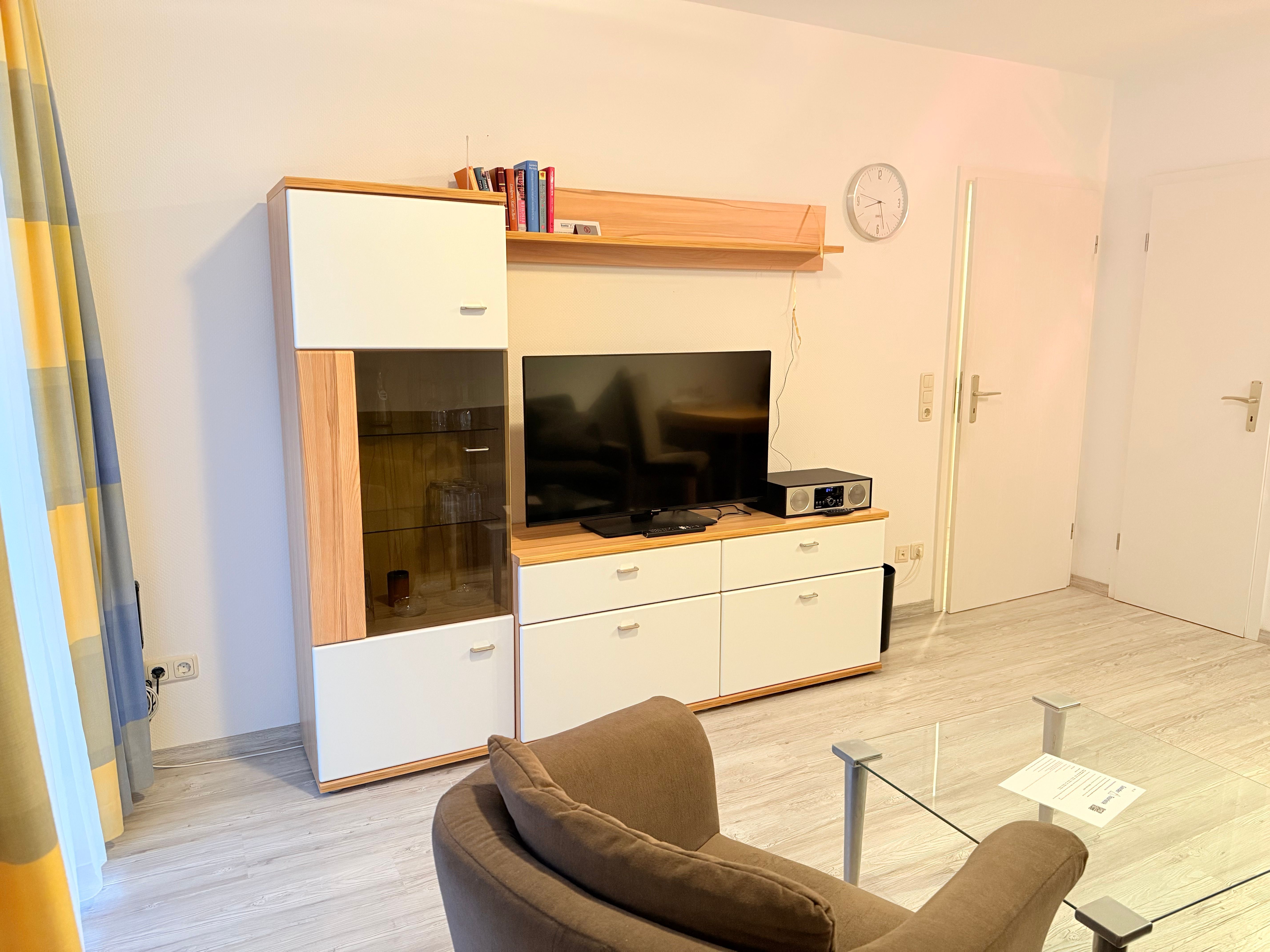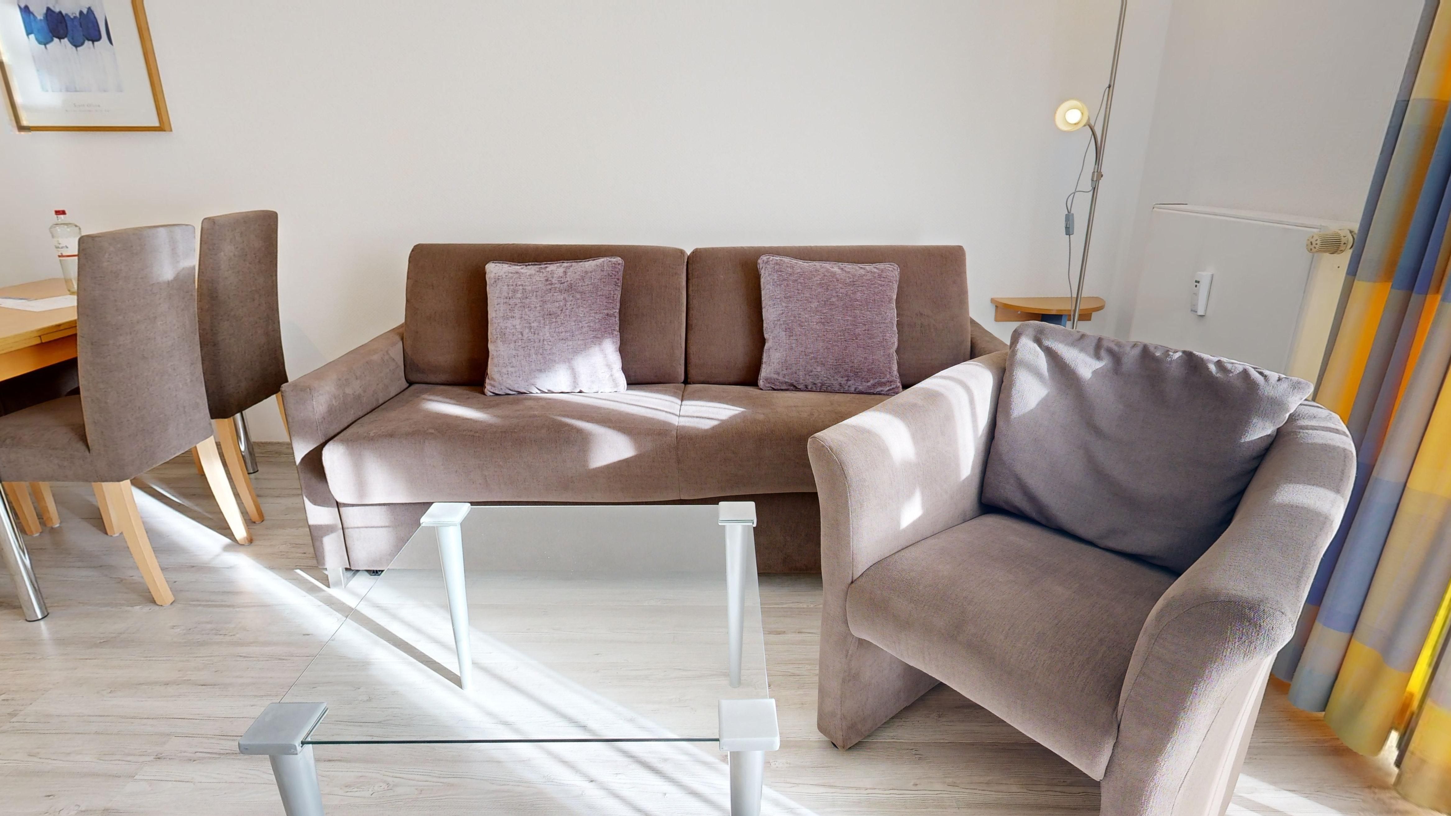 Wohnzimmer: Couchgarnitur (Schlafgelegenheit für 2 Personen), Kabel-TV, Stereoanlage, Internetanschluss (WLAN), Esstisch