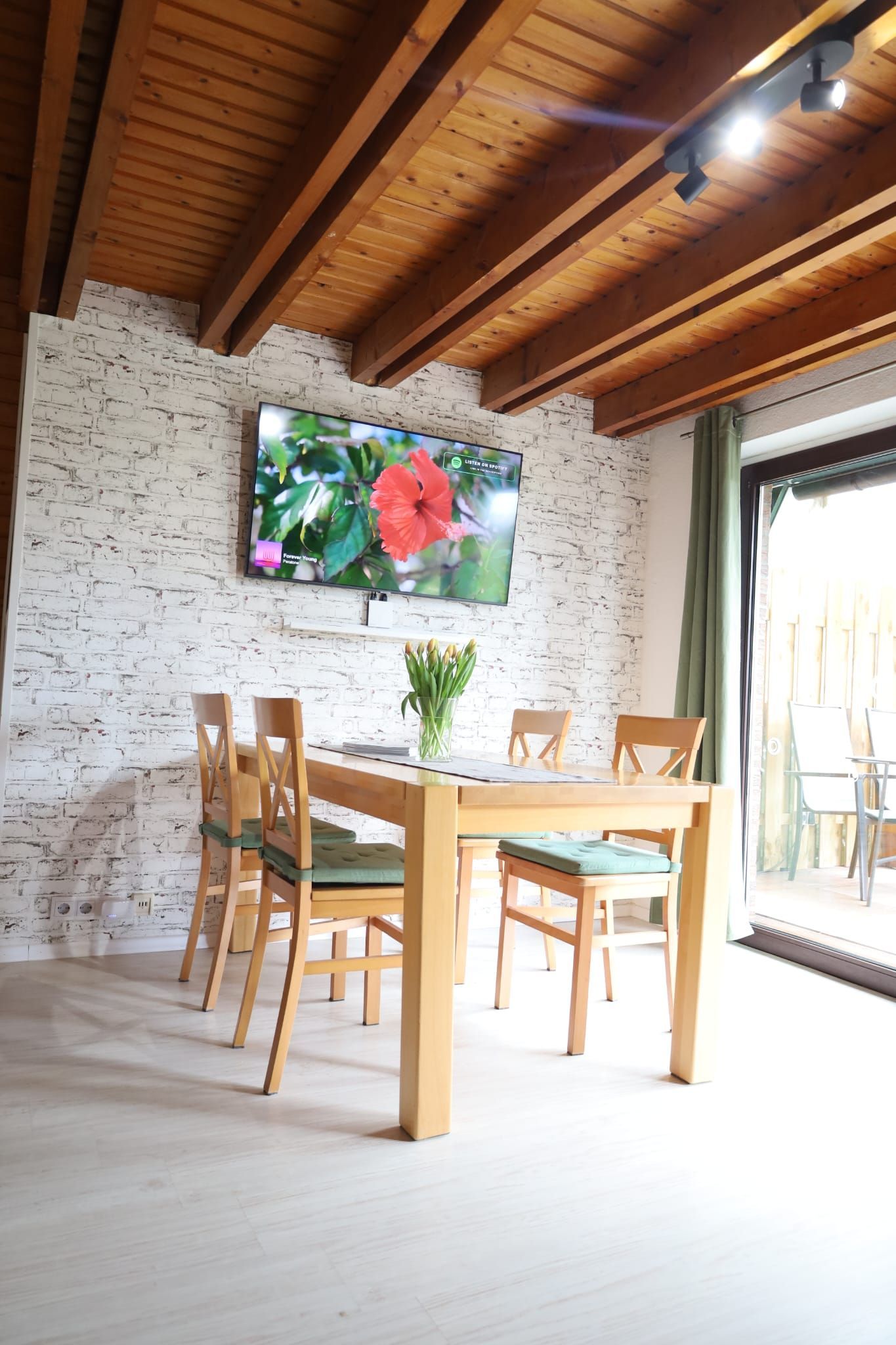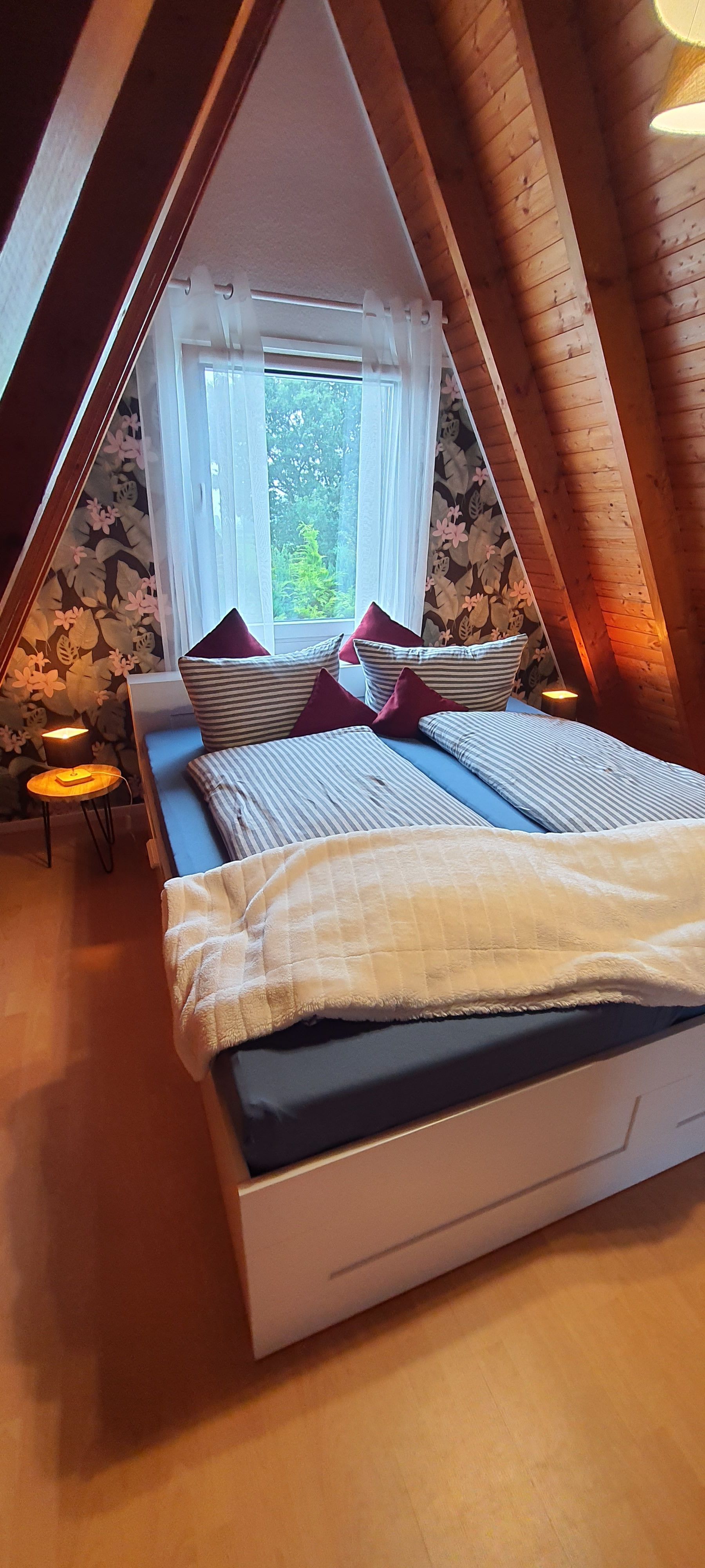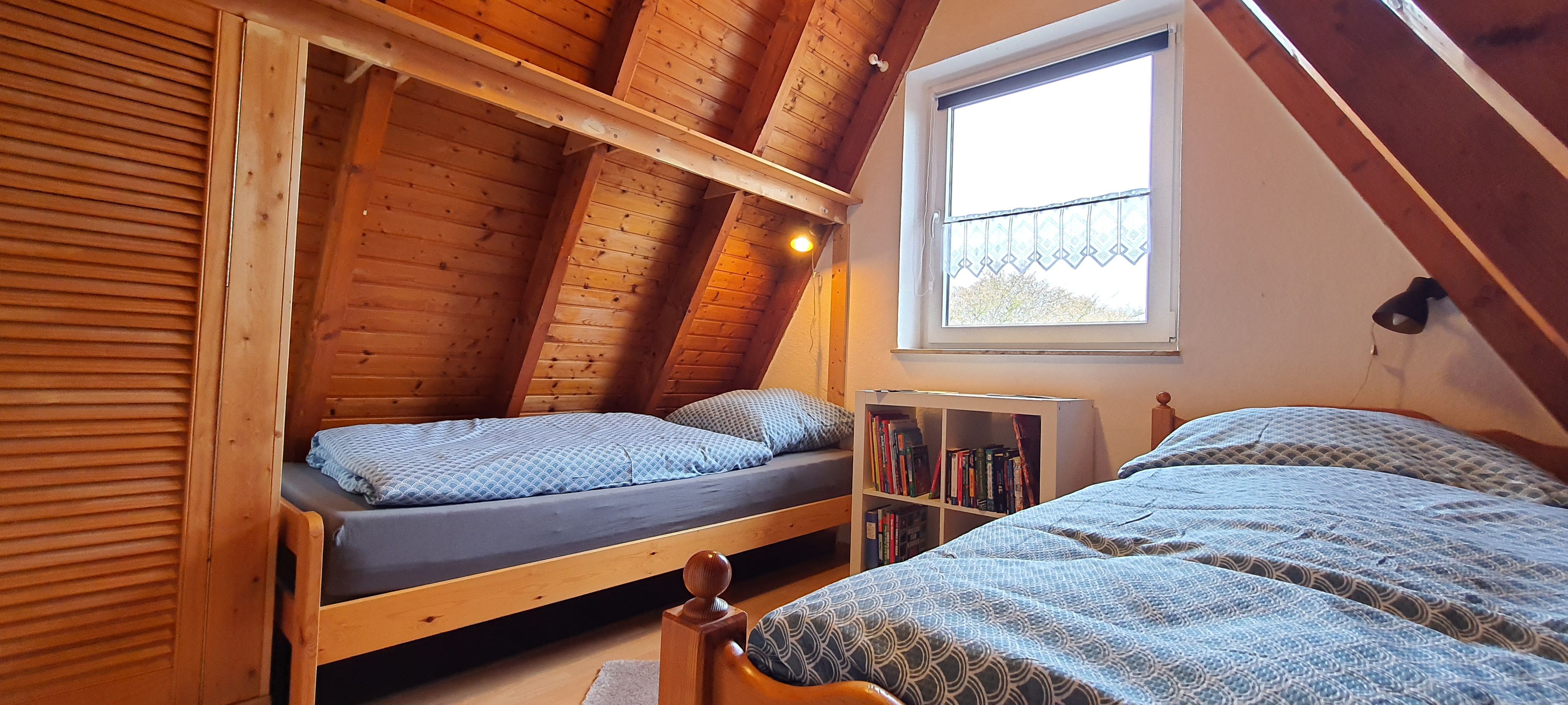 Das Haus verfügt über Platz für 4 Personen. Im Erdgeschoss befindet sich ein Tageslichtbad, eine voll ausgestattete Küche sowie ein heller freundlicher Wohn- und Essbereich mit Zugang zur Terrasse. Im Obergeschoss befindet sich ein gemütliches Schlafzimmer mit Doppelbett (1,40 m x 2,0 m), ein liebevoll eingerichtetes (Kinder-) Zimmer mit zwei Einzelbetten (0,90 m x 2,0 m) und ein WC.