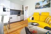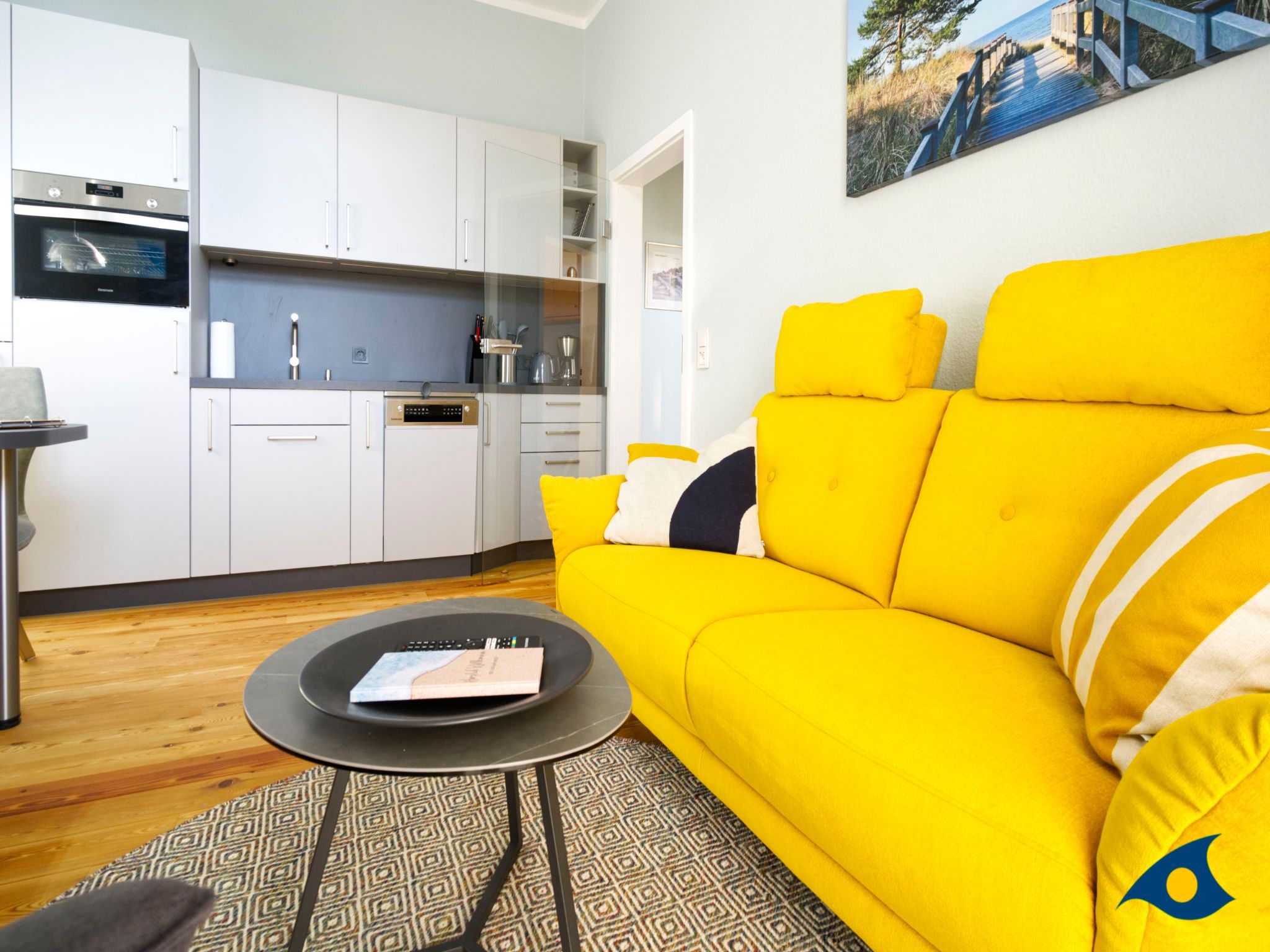 Das gemütliche und modern eingerichtete Wohnzimmer mit Echtholzfussboden bietet eine offene, gut ausgestattete Küche mit Essbereich. Die moderne und hochwertige Küchenzeile verfügt über einen Minibackofen, Ceranfeld und alles, was Sie für die Zubereitung Ihrer Mahlzeiten benötigen. Der Wohnbereich mit der gemütlichen Couch, lädt zu entspannten Abenden vor dem TV ein. Von hier aus gelangen Sie auch auf den Balkon, der mit seinen hochwertigen Sitzmöbeln zum Sonnenbaden einlädt.