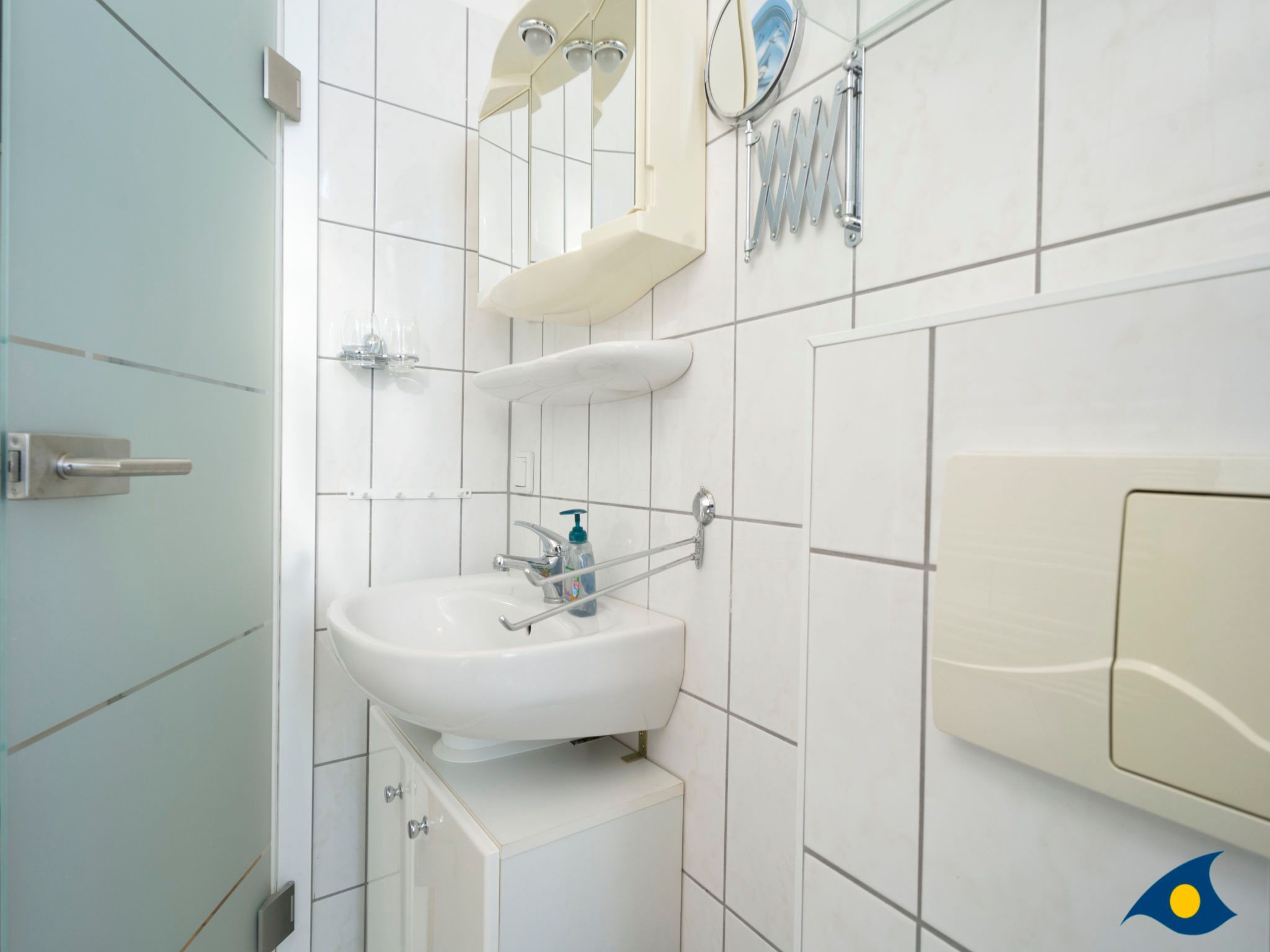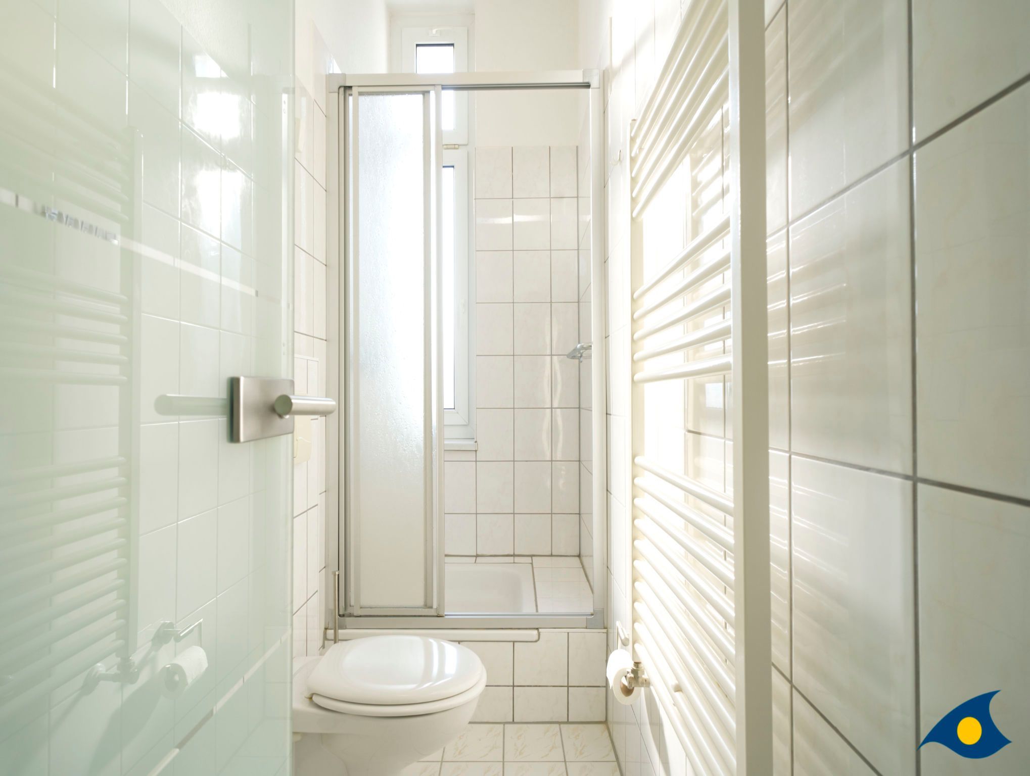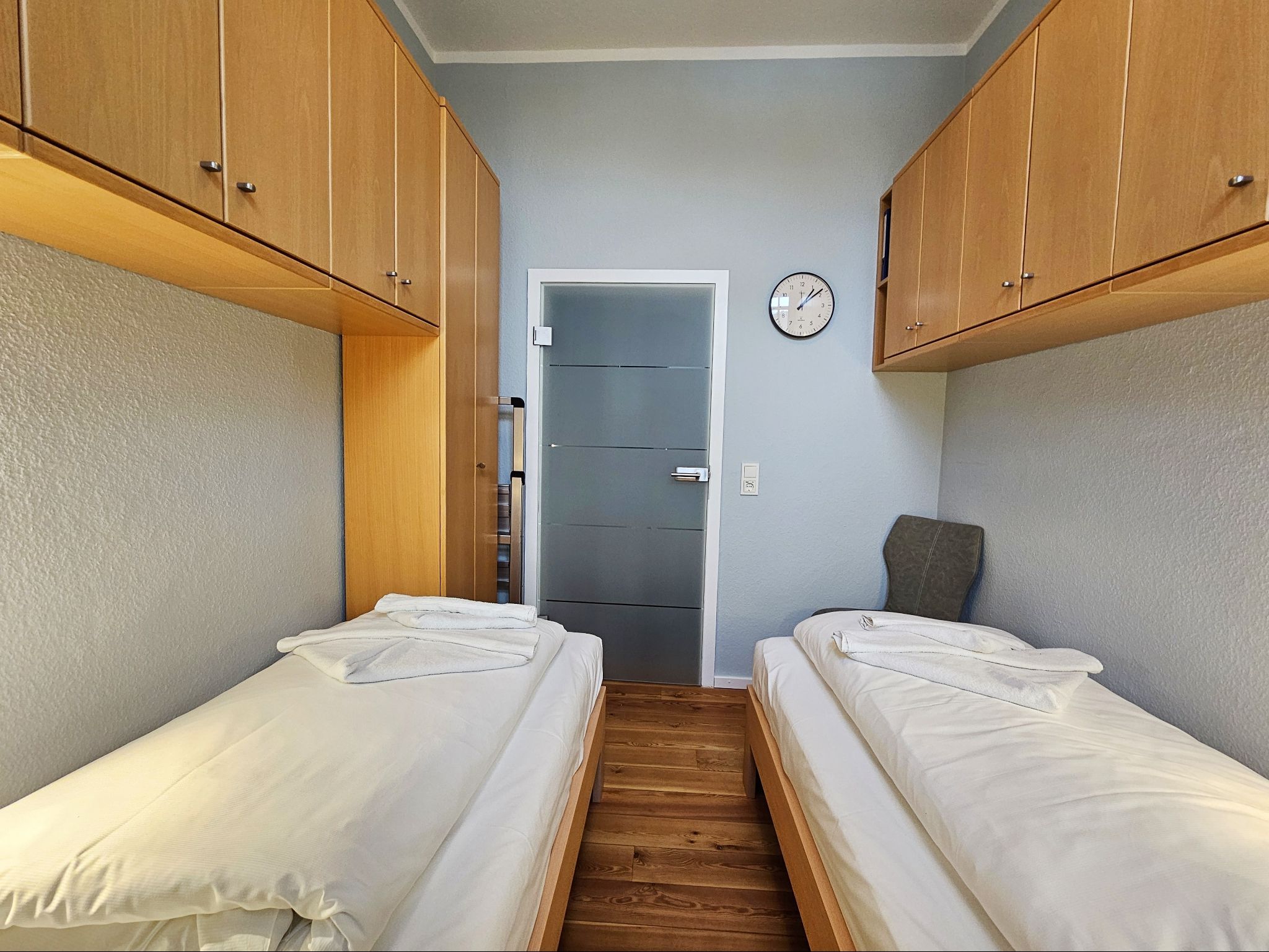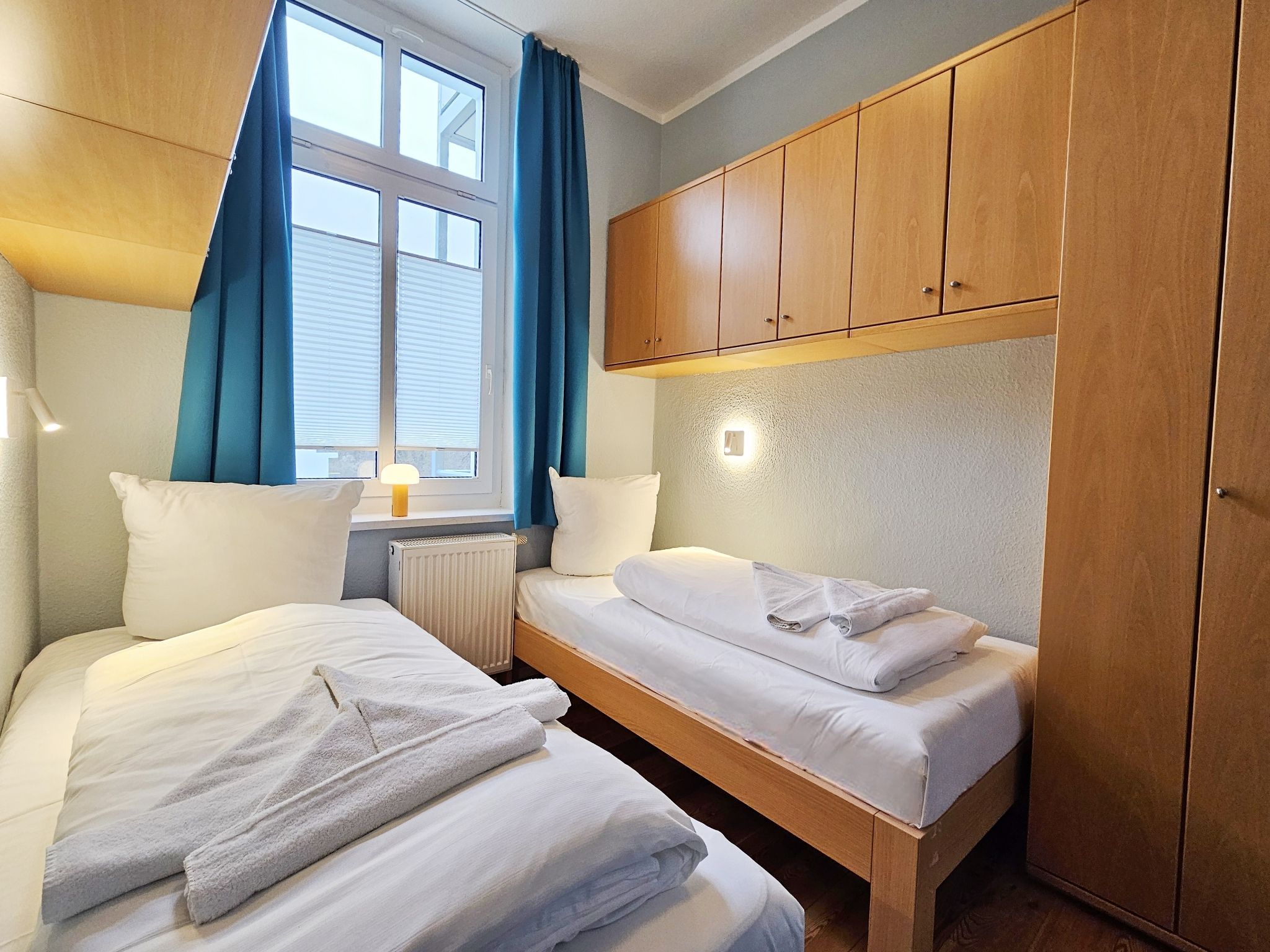 Das Schlafzimmer ist mit zwei einzeln stehenden Betten (90cmx200cm) ausgestattet. Ein kleines Badezimmer mit Dusche/WC komplettiert die Wohnung.