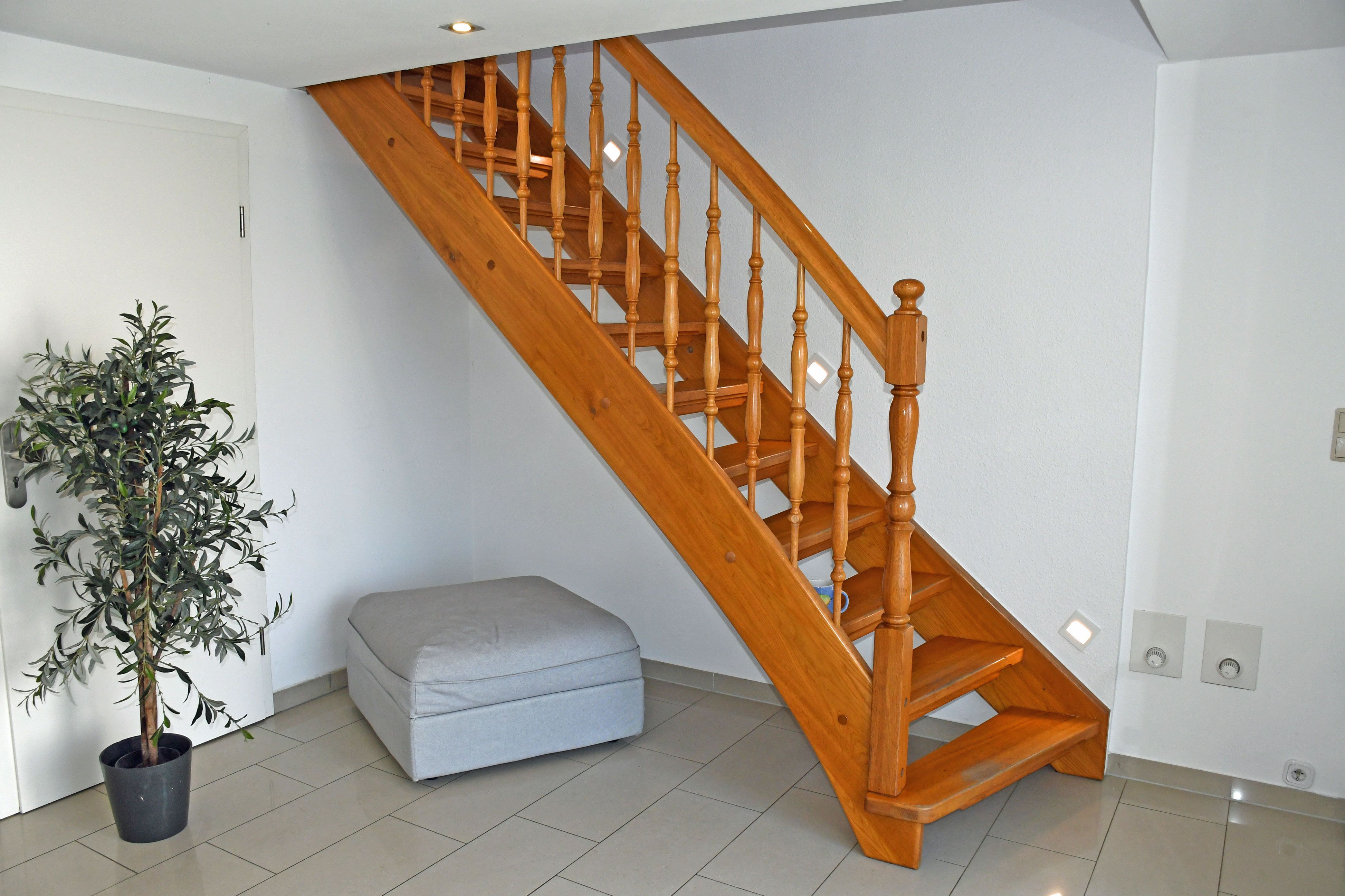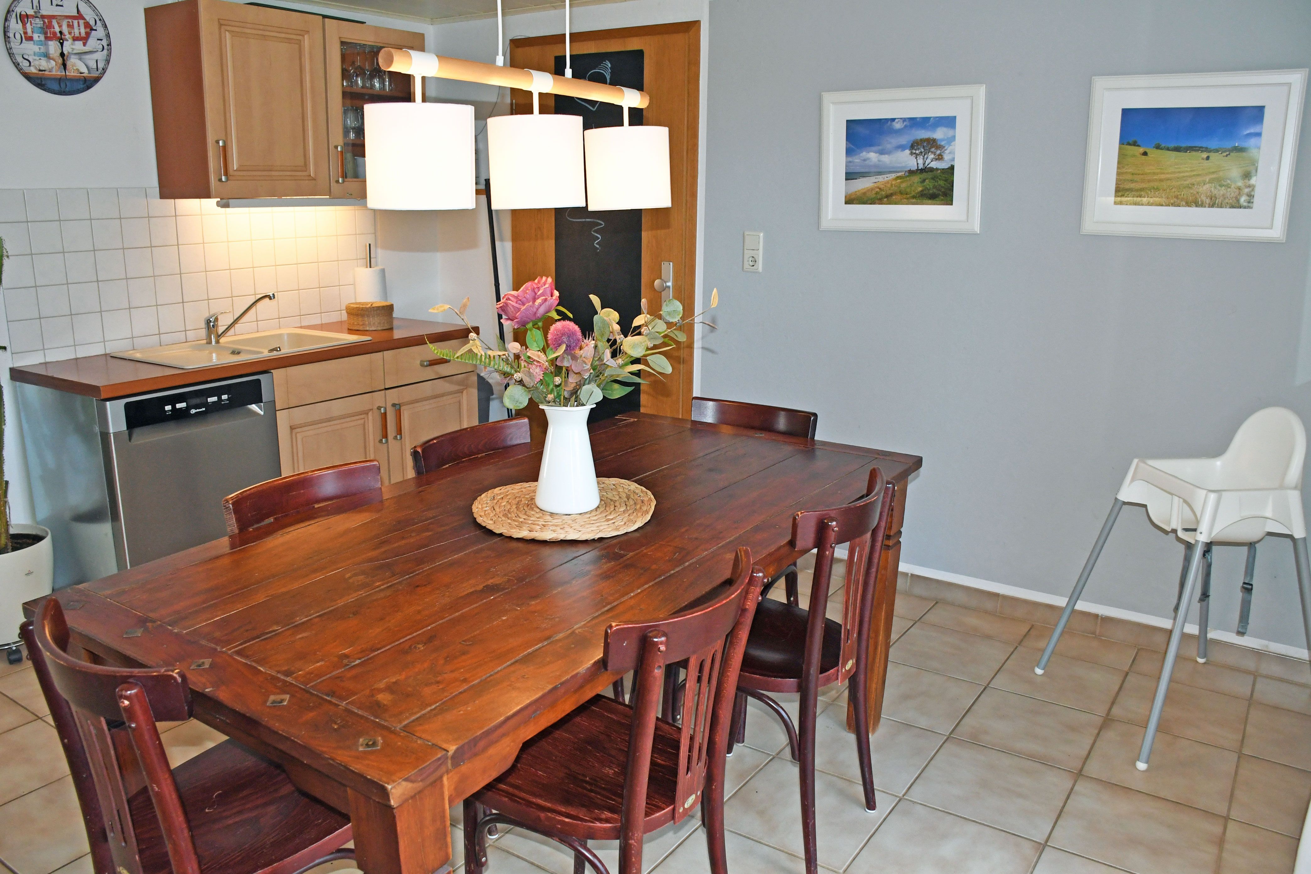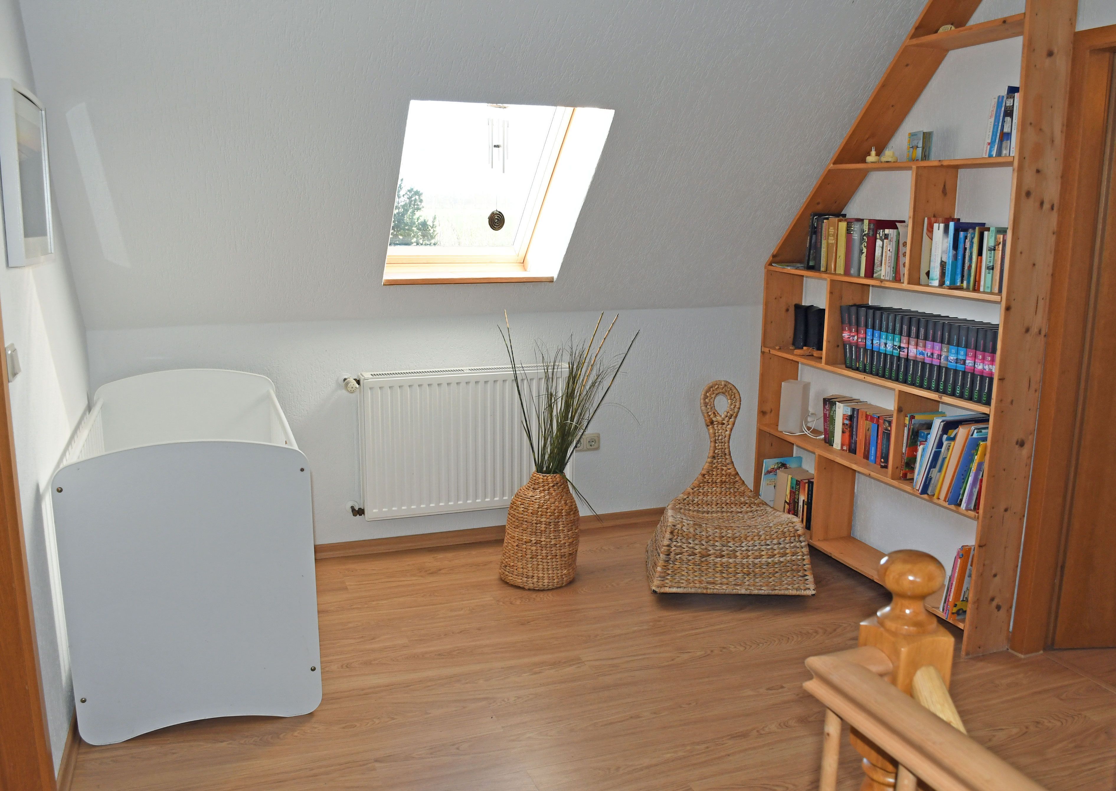 Im Erdgeschoß befindet sich ein großer Eingangsbereich sowie einer separaten Küche. Die Küche verfügt über einen Herd, Backofen, Mikrowelle, Abzugshaube, Geschirrspüler sowie einen Esstisch mit Sitzgelegeneiten sowie jeglichem Zubehör. Im oberen Bereich finden Sie einen Flur mit Lesecke vor. Der kombinierte Wohn-/Schlafraum ist mit einem bequemen Doppelbett, Nachtschränken, Leselampen, einer Couch, einem Coutschtisch sowie einem TV - Flat - Gerät mit DVD ausgestattet. Das Babybett für ein kleines Kind bis max. 3 Jahre (70 x 140 cm) können Sie variabel als Zustellbett nutzen. Im zweiten Schlafzimmer befinden sich ebenfalls ein Doppelbett, Nachtschränke, Leselampen sowie ein Kleiderschrank. In einem Schlafzimmer befindet sich zusätzlich eine Bett 90 x 200 für einen 5 Gast. Das Bad ist mit Dusche, Waschtisch und WC ausgestattet und verfügt über Tageslicht.