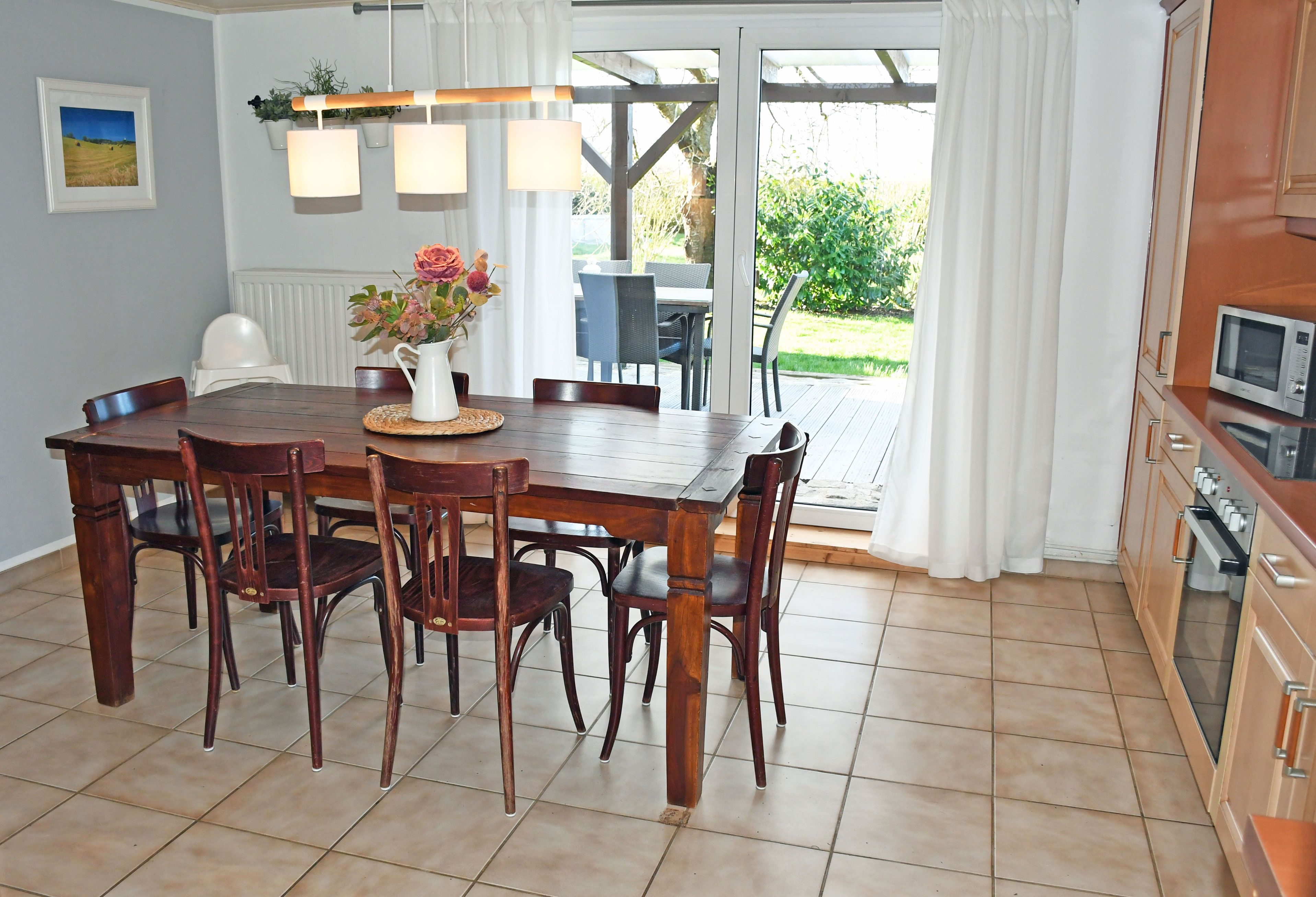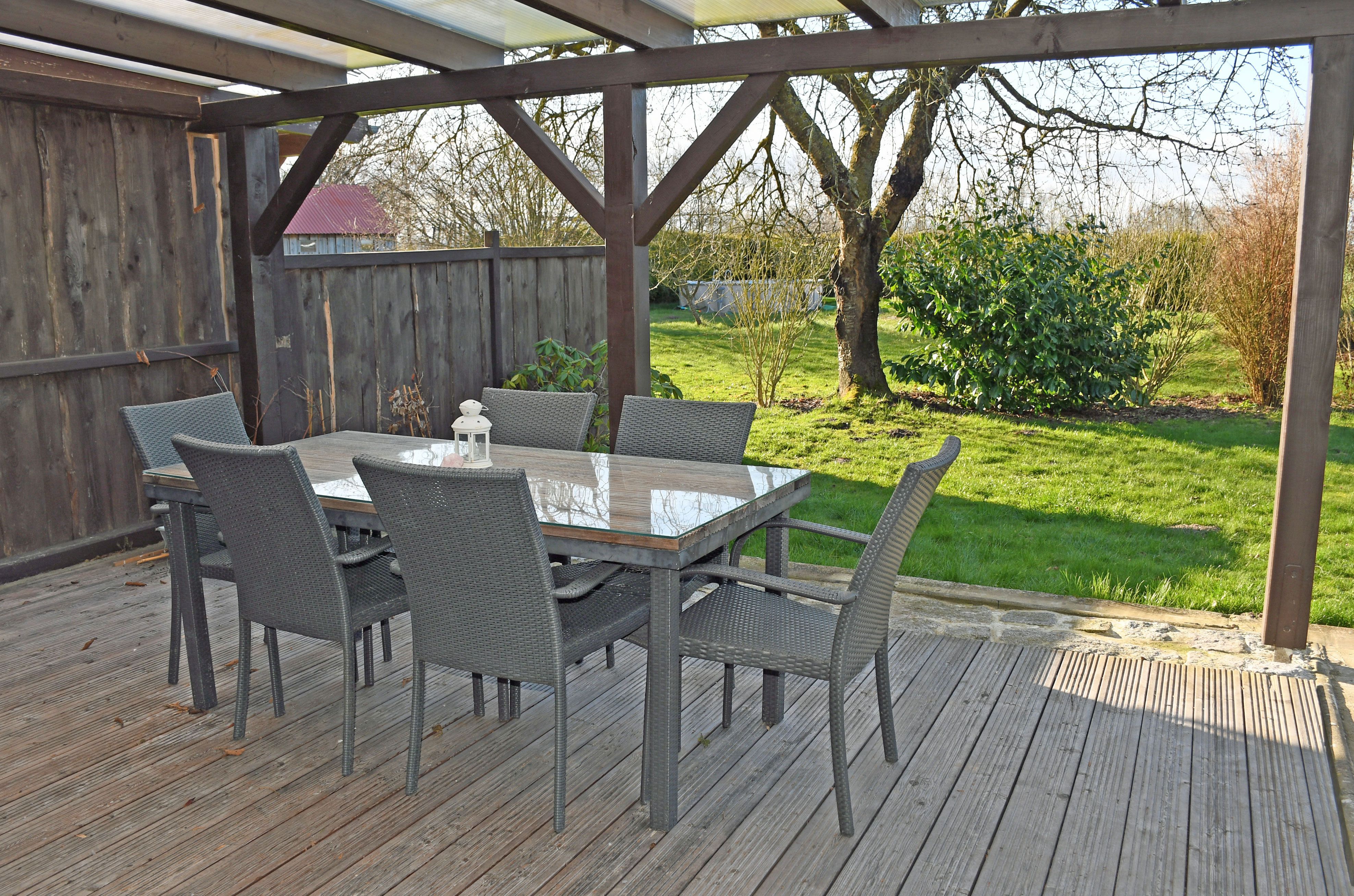 Bei Ihrer Anreise sind die Betten selbstverständlich bereits mit Bettwäsche bezogen (bei Buchungen bis 4 ÜN gegen Aufpreis von 5 Euro je Gast), Handtücher bitten wir Sie selbst mitzubringen. Zu dieser Ferienwohnung gehört eine große Terrasse mit Gartenmöbeln und Grillmöglichkeit. Hier können Sie Ihren Urlaubstag ganz entspannt bei einem Glas Wein ausklingen lassen.