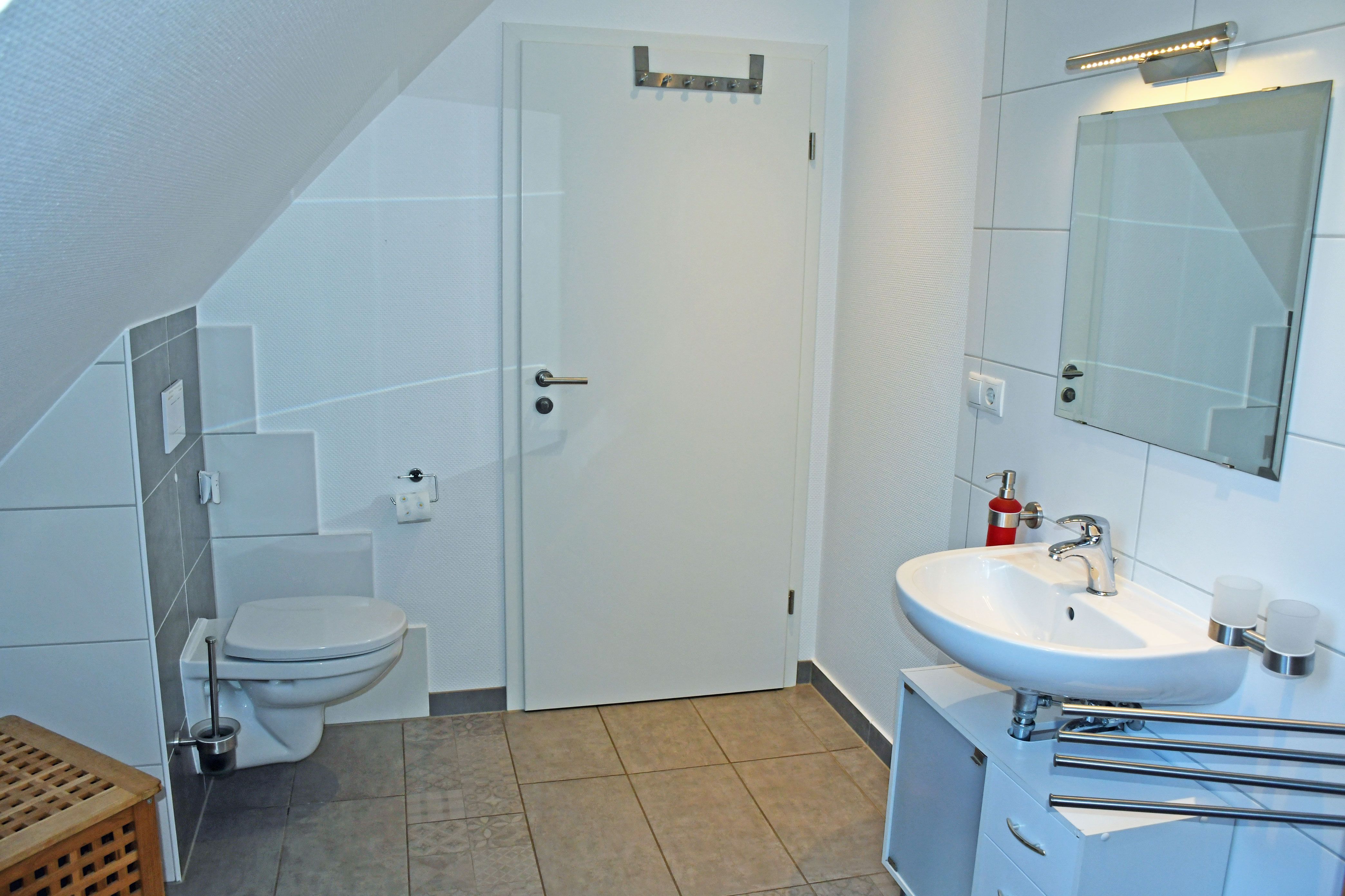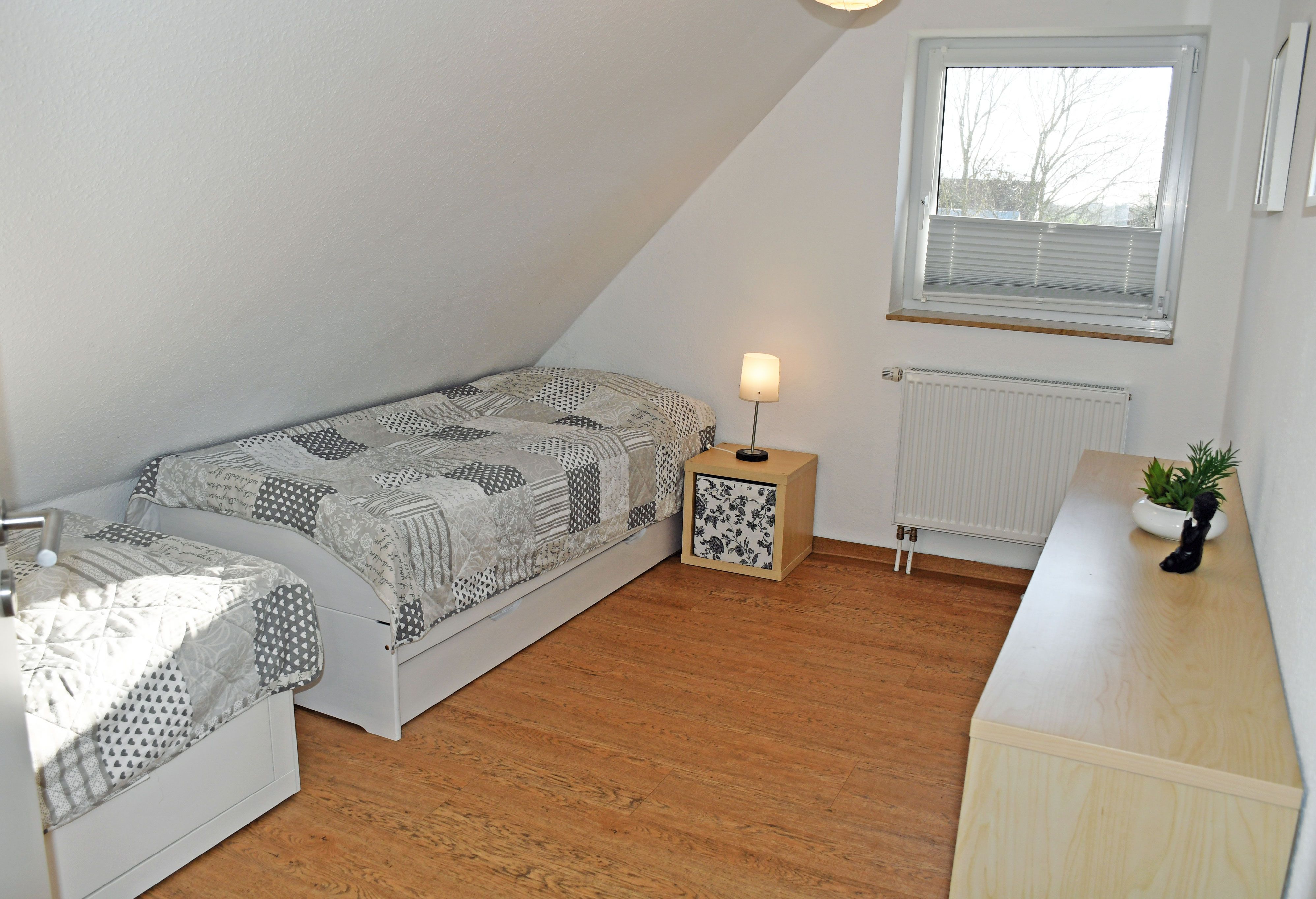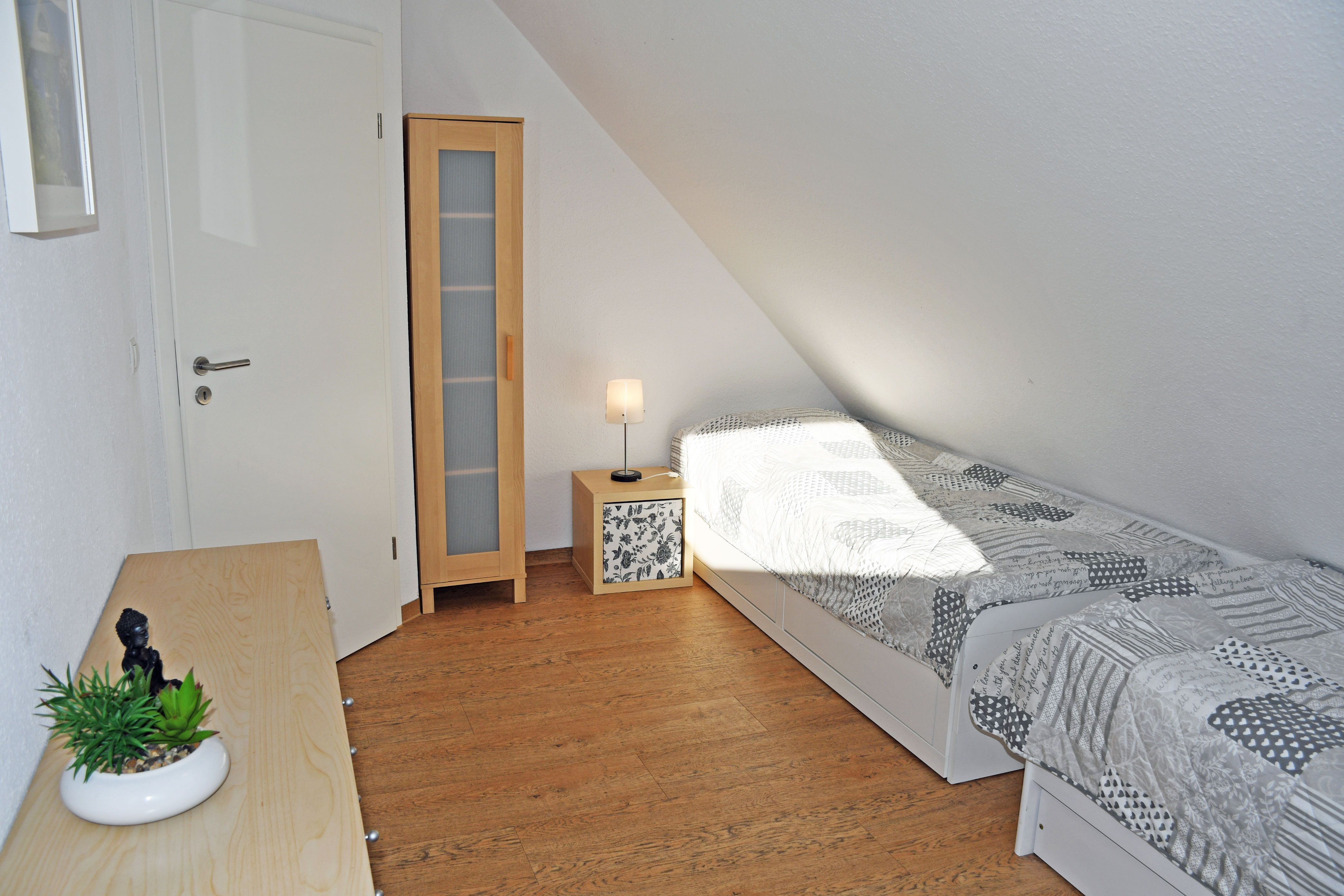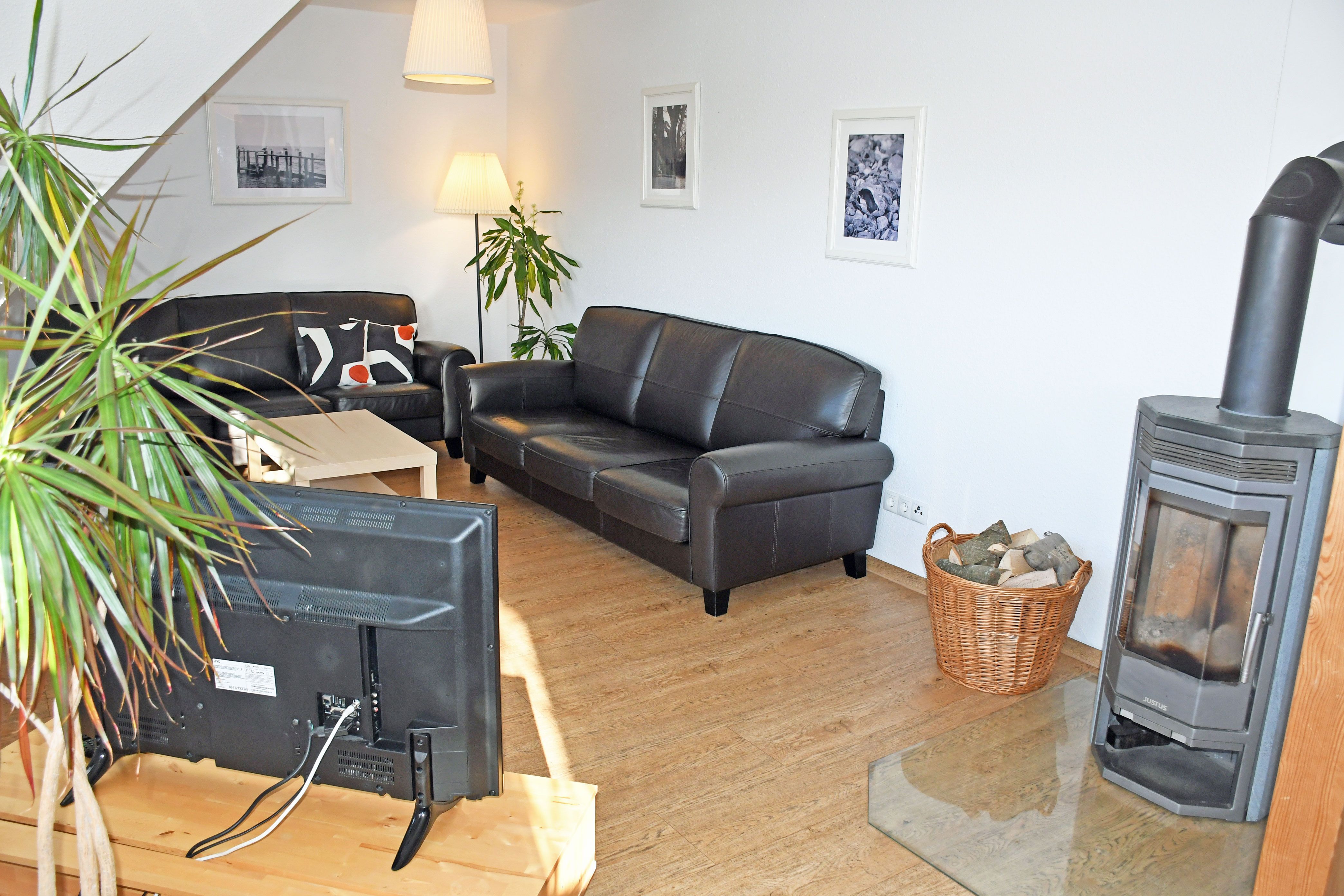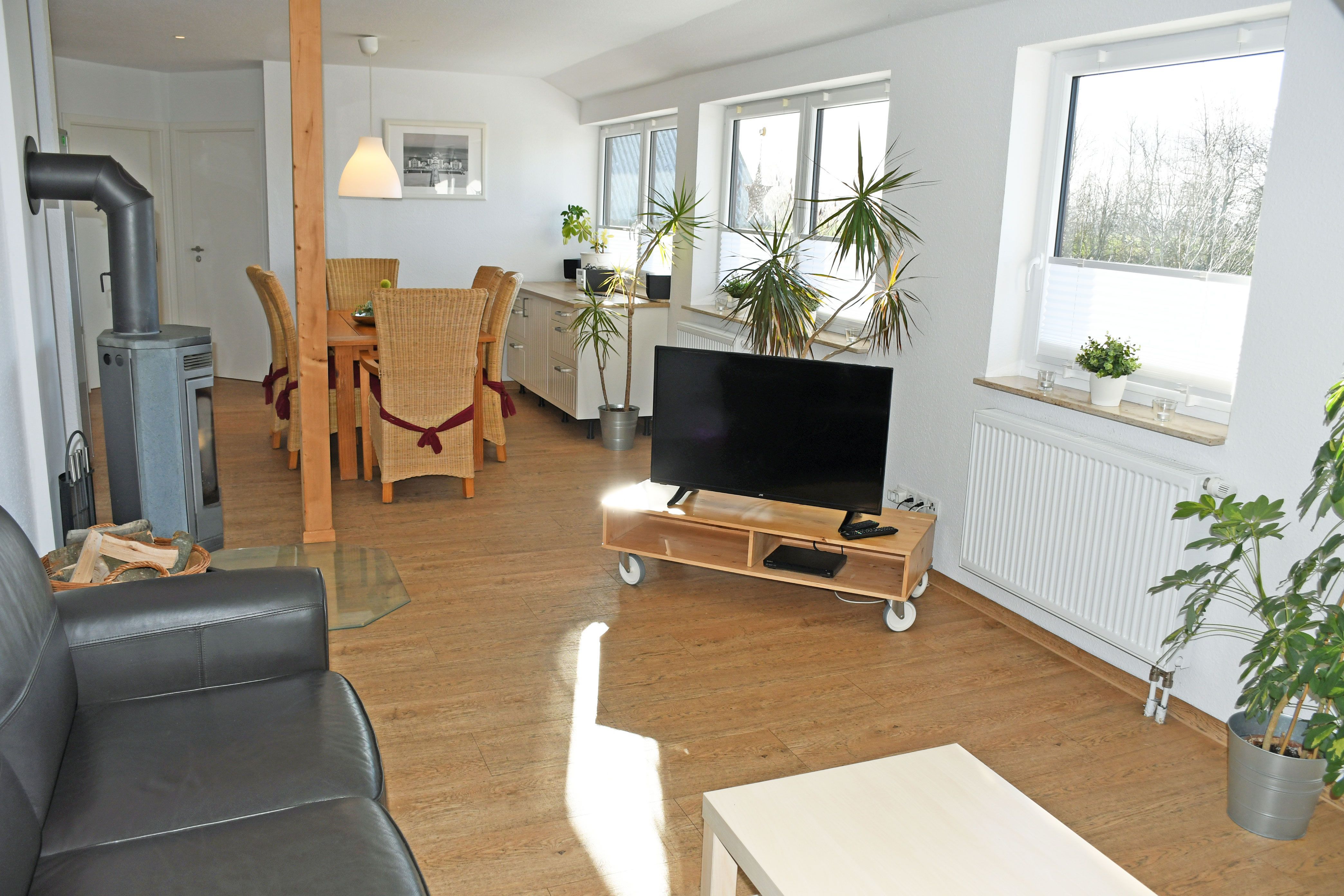 Über eine Außentreppe und einen separatent Eingang gelangen sie in den Flur und die weiteren Räume der im Obergeschoss liegenden Ferienwohnung. Das große Wohnzimmer ist mit einer bequemen Couch, einem Flachbild-TV-Grät. und einem Kamin ausgestattet. Durch die große Fensterfront haben unsere Gäste einen herrlichen, unverbauten Ausblick in die Landschaft. Die moderne Küchenzeile verfügt über einen Herd, Backofen, Mikrowelle, Abzugshaube, Geschirrspüler sowie einen Esstisch mit Stühlen. Das erste Schlafzimmer verfügt über ein bequemes Doppelbett mit Nachttischen und Leselampen sowie Kleiderschrank. Das zweite Schlafzimmer bietet zwei Einzelbetten, Nachttische mit Leselampen und einen Kleiderschrank. Eines der Einzelbetten kann ausgezogen werden zum Doppelbett (mit richtigen Matratzen). Das Kinderreisebett kann variabel gestellt werden. Das Bad ist mit Dusche und Badewanne, Waschtisch und WC ausgestattet und verfügt über Tageslicht.