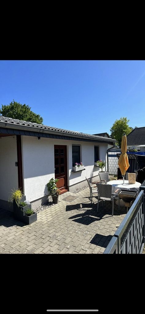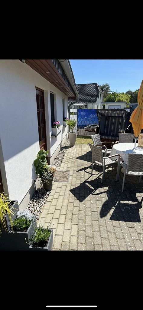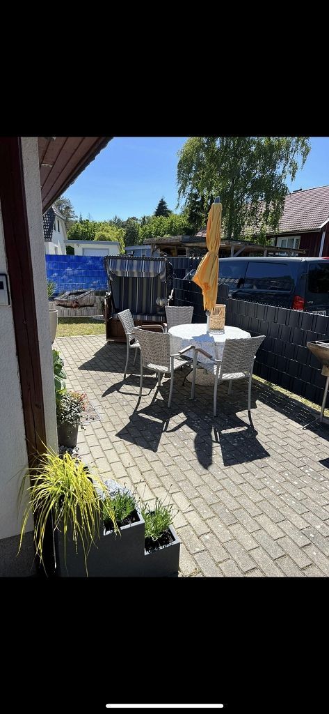 Der Außenbereich bietet eine möblierte Terrasse mit Strandkorb und Grillmöglichkeit. Außerdem ist ein Carport als Unterstellmöglichkeit für Ihr Auto vorhanden.