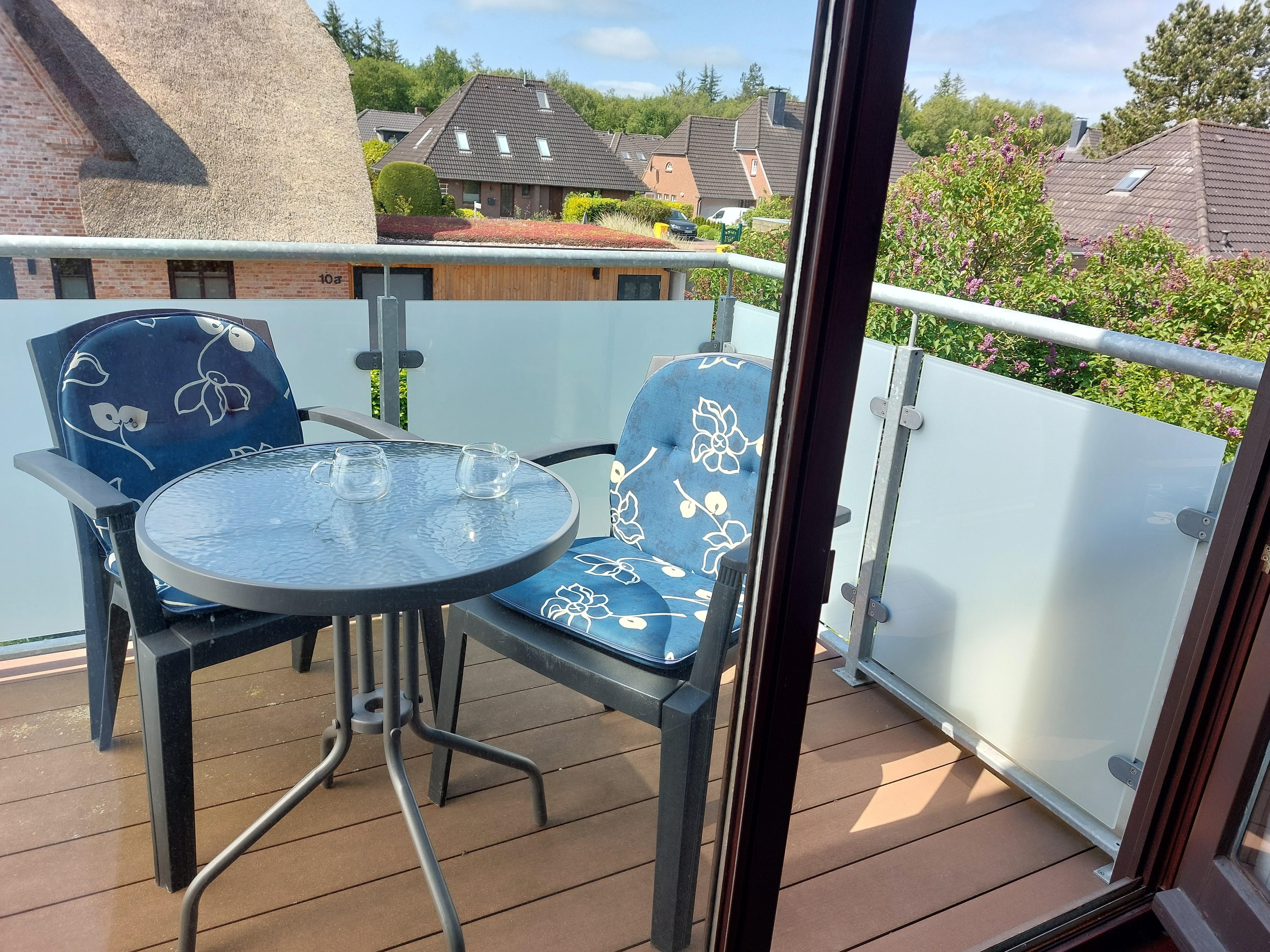 Kleiderschrank und eine Stereoanlage. Von dort gelangen Sie auf den möblierten Balkon.