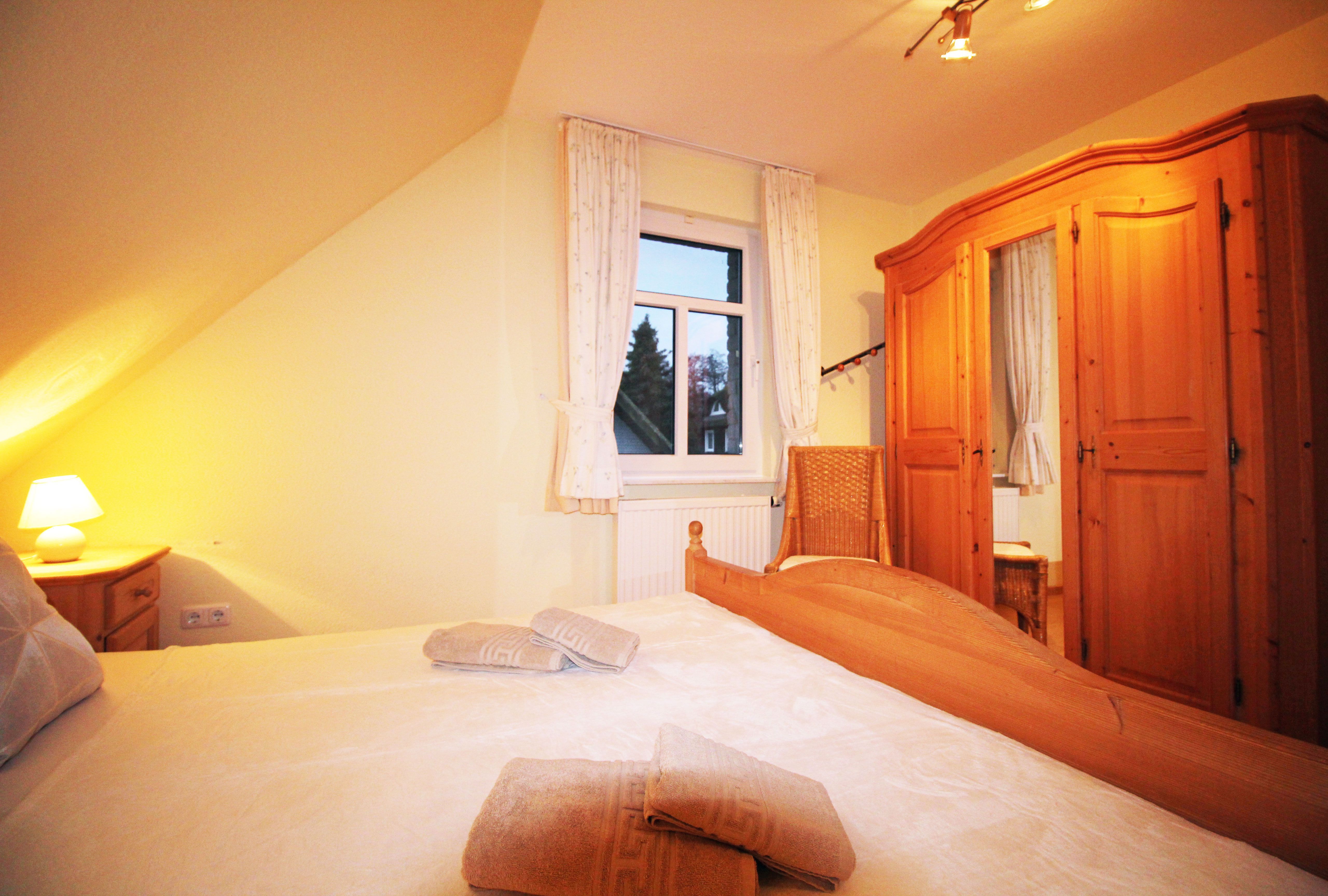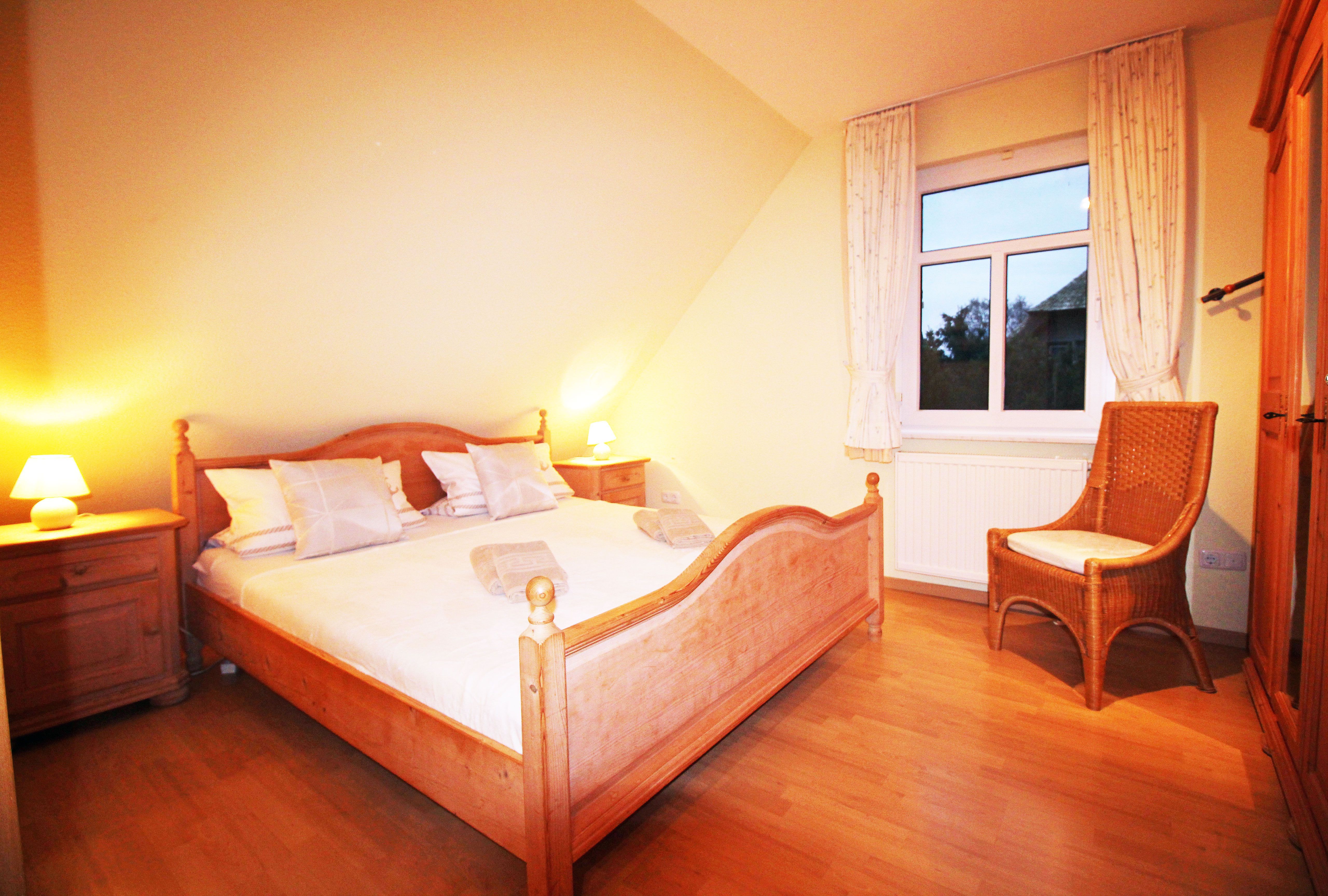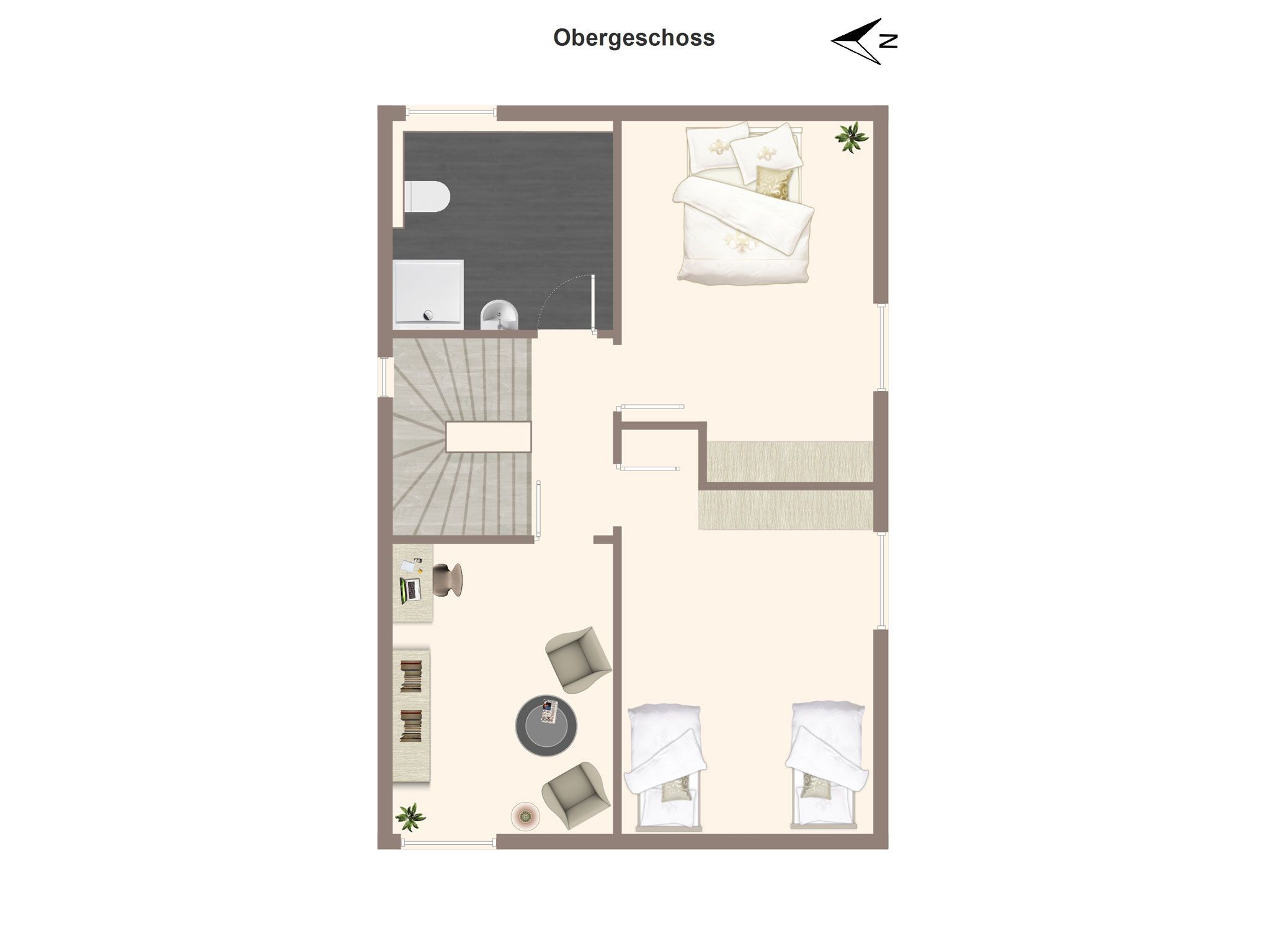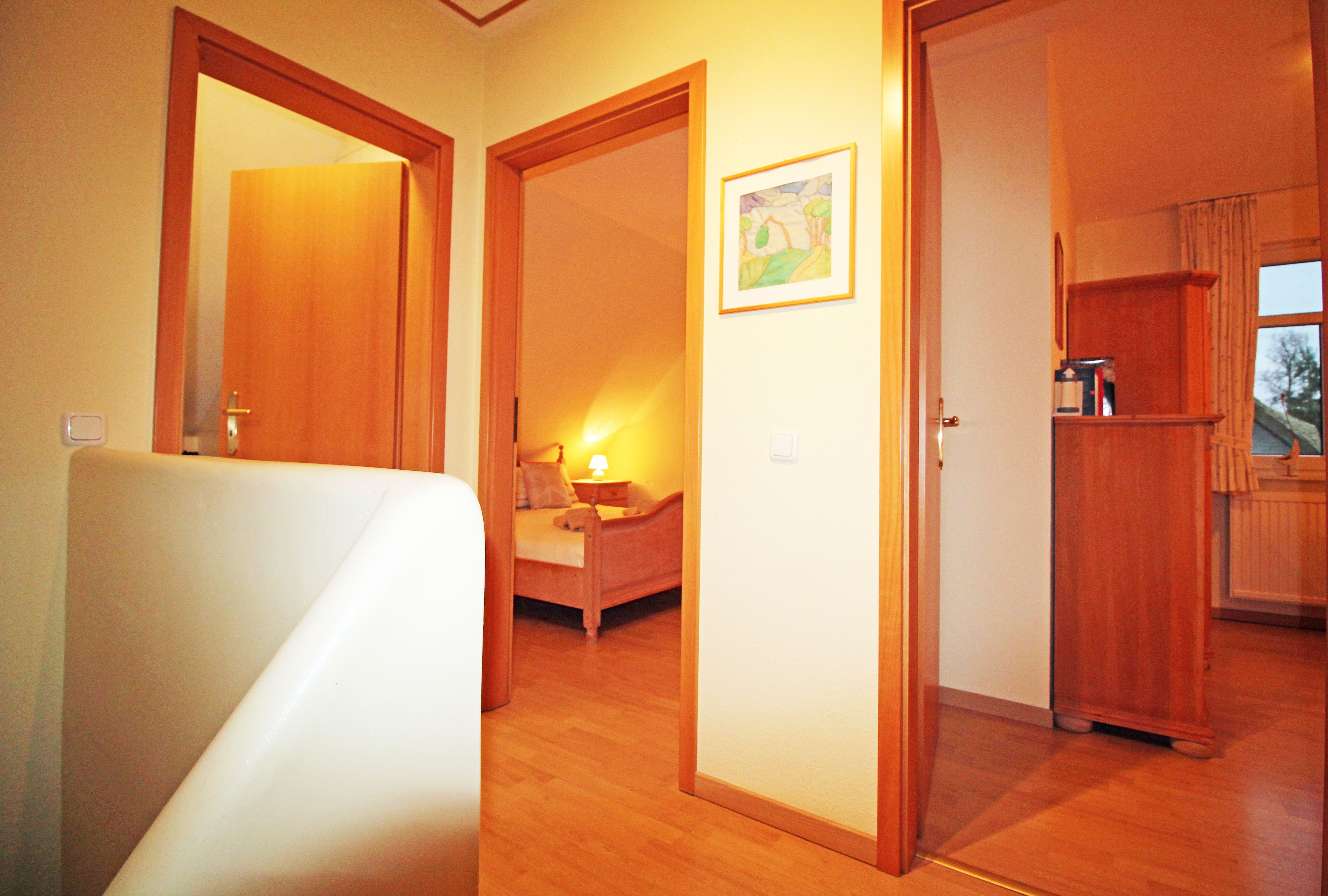 Das Obergeschoß gliedert sich in ein Schlafzimmer mit Doppelbett, ein Schlafzimmer mit 2 Einzelbetten, einer Rückzugsmöglichkeit für Dichter und Denker und ein weiteres Duschbad.